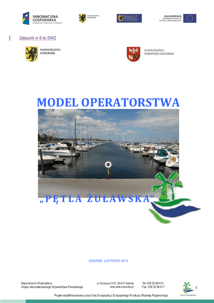 Załącznik nr 8 do SIWZ MODEL OPERATORSTWA „ P Ę T L A Ż U Ł A W S K A” GDAŃSK, LISTOPAD 2012 1 2 I. Ogólna charakterystyka Projektu „Pętla Żuławska – rozwój turystyki wodnej. Etap I” Ogólnym celem Projektu „Pętla Żuławska - rozwój turystyki wodnej Etap I" jest poprawa wizerunku Polski, jako miejsca atrakcyjnego dla turystów i inwestorów oraz stworzenie korzystnych warunków do rozwoju społeczno-gospodarczego Delty Wisły i Zalewu Wiślanego. Wzmiankowane przedsięwzięcie obejmuje realizację kilkunastu zadań inwestycyjnych polegających m.in. na budowie i modernizacji sieci portów, przystani żeglarskich, pomostów cumowniczych, które posłużą aktywnemu uprawianiu sportów wodnych i innych form turystyki. W Projekcie uczestniczy kilkunastu partnerów z obszaru Województwa Pomorskiego i Warmińsko – Mazurskiego. Zagospodarowanie dróg wodnych stanie się impulsem do podejmowania działalności gospodarczej oraz aktywizacji zawodowej mieszkańców, co z kolei pozwoli na zmniejszenie wysokiego bezrobocia, które od dłuższego czasu utrzymuje się w w/w obszarze. Zwiększony ruch turystyczny i ciekawa oferta skierowana do nowych grup odbiorców będzie bowiem zachętą dla inwestorów zewnętrznych do lokowania kapitału w nowych inwestycjach związanych z rozwojem turystyki śródlądowej w obszarze „Pętli Żuławskiej”. Projekt obejmuje następujące zadania inwestycyjne: Zadania zrealizowane. Budowa przystani żeglarskiej w Braniewie. W części hydrotechnicznej wybudowano 1 pomost cumowniczy dla jachtów i małych jednostek żeglugi śródlądowej. Jako rozwiązanie techniczne przyjęto pomosty pływające (3 szt. o długości 10 m, 2 trapy wejściowe). W części lądowej zadanie obejmowało budynek bosmanatu i budynek sanitariatów oraz zagospodarowanie terenu polegające na budowie ciągów pieszych, sieci uzbrojenia terenu oraz elementów małej architektury. Inwestor – Gmina Miasto Braniewo. Budowa przystani żeglarskiej w Nowej Pasłęce. Część hydrotechniczna obejmuje umocnione nabrzeże z miejscami postojowymi dla jednostek pływających; w pasie technicznym wzdłuż nabrzeża istnieje nawierzchnia dla ruchu pieszego o szer. 3 m. Cześć lądowa. - Kontener sanitarny, pełniący funkcję węzła sanitarnego dla przystani, z toaletami: damską, męską, oraz toaletą dla osób niepełnosprawnych, wydzielone miejsce na mycie naczyń - 20 miejsc postojowych: 19 miejsc postojowych - obiekt pomocniczy - most zwodzony. Inwestor - Gmina Braniewo. Budowa przystani żeglarskiej w Błotniku. 3 Część hydrotechniczna: - pomost główny - ogólnodostępny taras widokowy oddzielony barierą od części pomostów przeznaczonych wyłącznie dla żeglarzy. - pomosty stałe na potrzeby cumowania dużych jednostek motorowo – żaglowych, pomosty dla motorówek o długości do 5m i dobrej manewrowości, - 2 pomosty - po 20 stanowisk każdy, kotwione przegubowo do pomostu głównego, przeznaczone do cumowania jachtów o długości maksymalnej 12m. - pomost łączący brzeg rzeki z wieżą widokową długości 15m. - slip wyposażony w wyciągarkę elektryczną. Nośność i wymiary slipu umożliwiają podnoszenie z wody jachtów balastowych o długości do 12m. Długość rampy - 15m. Część kubaturowa i lądowa - dwukondygnacyjny budynek „na wodzie” - na płycie żelbetowej wspartej na palach, z tarasem na pierwszym piętrze. Parter obiektu pełni funkcję administracyjno – szkoleniową: pokój szkoleń, bosmanat, dyżurka ochrony, toalety, prysznice oraz pralnia. Na piętrze znajdą się głownie pomieszczenia magazynowe i administracyjne. Budynek pełni swoje funkcje całorocznie. Rozbudowa portu żeglarskiego w Elblągu. W części hydrotechnicznej program inwestycji obejmował dostosowanie basenu jachtowego do obsługi jednostek pływających o zanurzeniu do 2,5m. Jachty cumujące w basenie mają zapewniony, oprócz bezpiecznych warunków cumowania osiągniętych poprzez przebudowę konstrukcji nabrzeża, dostęp do energii elektrycznej i wody pitnej. Istnieje możliwość wyciągania jednostek pływających na ląd. Inwestor – Gmina Miasta Elbląg. Budowa mostu zwodzonego nad śluzą w Gdańsku Przegalinie. W ramach zadania zbudowano most zwodzony w technologii mostu klapowego o rozpiętości przęsła 18,30 m i długości całkowitej 22,5 m. Inwestor - Gmina Miasta Gdańska. Rozbudowa portu jachtowego w Krynicy Morskiej. Program inwestycji w części hydrotechnicznej obejmował rozbudowę falochronów i modernizację kei: rozbudowę nabrzeża Północno-Zachodniego, rozbudowę nabrzeża Bosmańskiego wraz ze slipem, rozbudowę nabrzeża Północno-Wschodniego, budowę pomostu stałego nr 1, budowę pomostu stałego nr 2 oraz pływające pomosty cumownicze przy pomostach nr 1, nr 2. Inwestor – Gmina Miasto Krynica Morska. Budowa przystani żeglarskiej "Park Północny" w Malborku. W ramach zadania wybudowano pomosty pływające wraz z trapami dojściowymi i odnogami cumowniczymi oraz umocniono brzeg na długości ok. 55 m wraz z pochylnią. W ramach zagospodarowania terenu pod potrzeby małej przystani jachtowej wzniesiono budynek socjalny, bosmanat, wykonano ogrodzenie i oświetlenie oraz nawierzchnię pieszo-jezdną. 4 Inwestor – Gmina Miejska Malbork. Budowa przystani żeglarskiej w Osłonce. W ramach zadania wybudowano pomost cumowniczy. W części lądowej zlokalizowano: - budynek obsługi przystani - zaplecze sanitarne w postaci toalet i umywalni dla kobiet i mężczyzn a także toalety wraz z natryskiem przystosowanej dla osoby niepełnosprawnej, punkt informacji turystycznej służący zarazem jako recepcja pola namiotowego. - wiata biesiadna o pow. 40,95m2 wyposażona w dwa stanowiska do przygotowywania posiłków i zmywania naczyń. - pole namiotowe i boisko wraz z pasem ochronnym o wymiarach 11x19 m. - 6 stanowisk parkingowych + 1 stanowisko dla osoby niepełnosprawnej. Inwestor – Gmina Nowy Dwór Gdański. Budowa