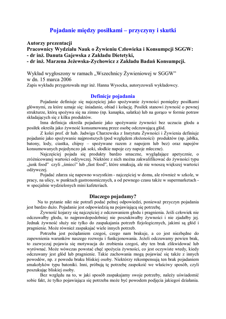 Pojadanie między posiłkami – przyczyny i skutki Autorzy prezentacji Pracownicy Wydziału Nauk o Żywieniu Człowieka i Konsumpcji SGGW: - dr inż. Danuta Gajewska z Zakładu Dietetyki, - dr inż. Marzena Jeżewska-Zychowicz z Zakładu Badań Konsumpcji. Wykład wygłoszony w ramach „Wszechnicy Żywieniowej w SGGW” w dn. 15 marca 2006 Zapis wykładu przygotowała mgr inż. Hanna Wysocka, autoryzowali wykładowcy. Definicje pojadania Pojadanie definiuje się najczęściej jako spożywanie żywności pomiędzy posiłkami głównymi, za które uznaje się: śniadanie, obiad i kolację. Posiłek stanowi żywność o pewnej strukturze, którą spożywa się na zimno (np. kanapka, sałatka) lub na gorąco w formie potraw składających się z kilku produktów. Inna definicja określa pojadanie jako spożywanie żywności bez uczucia głodu a posiłek określa jako żywność konsumowaną przez osobę odczuwającą głód. Z kolei prof. dr hab. Jadwiga Charzewska z Instytutu Żywności i Żywienia definiuje pojadanie jako spożywanie najprostszych (pod względem złożoności) produktów (np. jabłka, batony, lody, ciastka, chipsy – spożywane razem z napojem lub bez) oraz napojów konsumowanych pojedynczo jak soki, słodkie napoje czy napoje mleczne). Najczęściej pojada się produkty bardzo smaczne, wyglądające apetycznie, o zróżnicowanej wartości odżywczej. Niektóre z nich można zakwalifikować do żywności typu „junk food” czyli „śmieci” lub „fast food”, które smakują, ale nie wnoszą większej wartości odżywczej. Pojadać zdarza się napewno wszystkim - najczęściej w domu, ale również w szkole, w pracy, na ulicy, w punktach gastronomicznych, a od pewnego czasu także w supermarketach w specjalnie wydzielonych mini kafeteriach. Dlaczego pojadamy? Na to pytanie nikt nie potrafi podać pełnej odpowiedzi, ponieważ przyczyn pojadania jest bardzo dużo. Pojadanie jest odpowiedzią na pojawiającą się potrzebę. Żywność kojarzy się najczęściej z odczuwaniem głodu i pragnienia. Jeśli człowiek nie odczuwałby głodu, to najprawdopodobniej nie poszukiwałby żywności i nie zjadałby jej. Jednak żywność służy nie tylko do zaspakajania potrzeb fizjologicznych, jakimi są głód i pragnienie. Może również zaspakajać wiele innych potrzeb. Potrzeba jest pożądaniem czegoś, czego nam brakuje, a co jest niezbędne do zapewnienia warunków naszego rozwoju i funkcjonowania. Jeżeli odczuwamy pewien brak, to zazwyczaj pojawia się motywacja do zrobienia czegoś, aby ten brak zlikwidować lub wyrównać. Może wówczas powstać chęć spożycia żywności, co jest oczywiste wtedy, kiedy odczuwany jest głód lub pragnienie. Takie zachowania mogą pojawiać się także z innych powodów, np. z powodu braku bliskiej osoby. Niektórzy rekompensują ten brak pojadaniem smakołyków typu batoniki. Inni, próbują tę potrzebę zaspokoić we właściwy sposób, czyli poszukując bliskiej osoby. Bez względu na to, w jaki sposób zaspakajamy swoje potrzeby, należy uświadomić sobie fakt, że tylko pojawiająca się potrzeba może być powodem podjęcia jakiegoś działania. Pojawia się wówczas motywacja i zaczynamy poszukiwać wartości, która zaspokoi odczuwany brak. Jakie zatem potrzeby wywołują chęć pojadania? Są to różne potrzeby, wśród których wyróżnia się 3 główne grupy, a klasyfikacja ta jest wynikiem uwzględnienia źródła ich pochodzenia: 1. Potrzeby biologiczne - ich źródłem jest organizm człowieka. 2. Potrzeby społeczne - ich źródłem jest otoczenie człowieka. 3. Potrzeby psychiczne - ich źródłem jest osobowość (psychika) człowieka. Potrzeby biologiczne Potrzeby biologiczne reprezentuje głód i pragnienie. Oczywistym jest to, że głód i pragnienie mogą być zaspokojone, jeśli tylko żywność jest dostępna. W przeciwnym wypadku człowiek zaczyna jej poszukiwać i zazwyczaj tę potrzebę zaspakaja. Potrzeby społeczne Potrzeby społeczne wynikają z życia wśród ludzi. Z jednymi jesteśmy związani bardziej, z innymi mniej. Wzajemnie na siebie oddziałujemy. Te właśnie osoby są często źródłem odczuwanych przez nas potrzeb, które można zaspakajać również poprzez żywność. Większość naszych zachowań żywieniowych ma w tle rodzinę. W domu rodzinnym uczyliśmy się posługiwać sztućcami, poznawaliśmy różne produkty żywnościowe, zjadaliśmy je wspólnie z bliskimi. Oprócz takiego bardzo pozytywnego oddziaływania, rodzina może mieć również negatywny wpływ na sferę zachowań żywieniowych człowieka. W rodzinie uczymy się traktować żywność w sposób bardzo emocjonalny. Znaczenie żywności w sensie wartości odżywczej staje się wówczas mniejsze, zaś w większym stopniu żywność staje się kategorią emocjonalną. Dzieje się tak, kiedy matka karmi dziecko. Wkłada w to dużo uczucia. Dziecku przygotowuje najlepsze, najsmaczniejsze jedzenie i dziecko zaczyna kojarzyć jedzenie z czymś miłym, przyjemnym, z bezpieczeństwem i ciepłem. Z perspektywy czasu okazuje się, że traktując żywność w taki właśnie emocjonalny sposób, zaczynamy wykorzystywać ją w sytuacjach nasyconych emocjami. A oto kilka przykładów wpływu otoczenia społecznego na podjęcie decyzji o zakupie i spożyciu żywności: * Widok osoby jedzącej zachęca do spożywania posiłku. * Widok żywności może być powodem, dla którego gotowi jesteśmy zjeść, mimo że nie odczuwamy głodu, a nawet mimo to, że przed chwilą zjedliśmy posiłek, który nas nasycił. * Jeśli znajdujemy się w sytuacji związanej z jedzeniem, np. przechodzimy obok piekarni i czujemy zapach świeżego pieczywa, znamy jego smak, to sytuacja ta może zachęcić nas do wejścia do piekarni i zakupu pieczywa. * Styl życia również decyduje o sposobie żywienia. Częsty brak czasu i pośpiech są przyczynami uniemożliwiającymi spożywanie prawidłowo skomponowanych posiłków. Z tych powodów ludzie korzysta