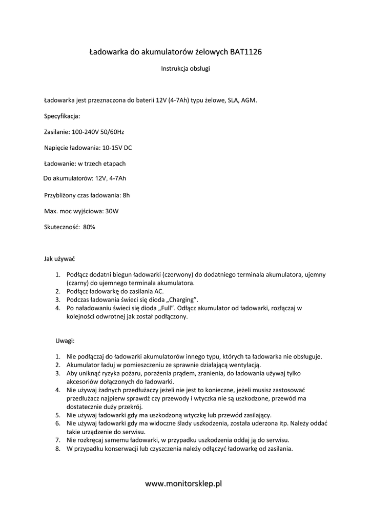 Ładowarka do akumulatorów żelowych BAT1126 Instrukcja obsługi Ładowarka jest przeznaczona do baterii 12V (4-7Ah) typu żelowe, SLA, AGM. Specyfikacja: Zasilanie: 100-240V 50/60Hz Napięcie ładowania: 10-15V DC Ładowanie: w trzech etapach Do akumulatorów: 12V, 4-7Ah Przybliżony czas ładowania: 8h Max. moc wyjściowa: 30W Skuteczność: 80% Jak używać 1. Podłącz dodatni biegun ładowarki (czerwony) do dodatniego terminala akumulatora, ujemny (czarny) do ujemnego terminala akumulatora. 2. Podłącz ładowarkę do zasilania AC. 3. Podczas ładowania świeci się dioda „Charging”. 4. Po naładowaniu świeci się dioda „Full”. Odłącz akumulator od ładowarki, rozłączaj w kolejności odwrotnej jak został podłączony. Uwagi: 1. Nie podłączaj do ładowarki akumulatorów innego typu, których ta ładowarka nie obsługuje. 2. Akumulator ładuj w pomieszczeniu ze sprawnie działającą wentylacją. 3. Aby uniknąć ryzyka pożaru, porażenia prądem, zranienia, do ładowania używaj tylko akcesoriów dołączonych do ładowarki. 4. Nie używaj żadnych przedłużaczy jeżeli nie jest to konieczne, jeżeli musisz zastosować przedłużacz najpierw sprawdź czy przewody i wtyczka nie są uszkodzone, przewód ma dostatecznie duży przekrój. 5. Nie używaj ładowarki gdy ma uszkodzoną wtyczkę lub przewód zasilający. 6. Nie używaj ładowarki gdy ma widoczne ślady uszkodzenia, została uderzona itp. Należy oddać takie urządzenie do serwisu. 7. Nie rozkręcaj samemu ładowarki, w przypadku uszkodzenia oddaj ją do serwisu. 8. W przypadku konserwacji lub czyszczenia należy odłączyć ładowarkę od zasilania. www.monitorsklep.pl