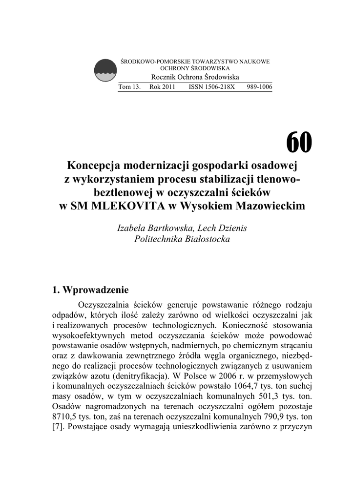 ŚRODKOWO-POMORSKIE TOWARZYSTWO NAUKOWE OCHRONY ŚRODOWISKA Rocznik Ochrona Środowiska Tom 13. Rok 2011 ISSN 1506-218X 989-1006 60 Koncepcja modernizacji gospodarki osadowej z wykorzystaniem procesu stabilizacji tlenowobeztlenowej w oczyszczalni ścieków w SM MLEKOVITA w Wysokiem Mazowieckim Izabela Bartkowska, Lech Dzienis Politechnika Białostocka 1. Wprowadzenie Oczyszczalnia ścieków generuje powstawanie różnego rodzaju odpadów, których ilość zależy zarówno od wielkości oczyszczalni jak i realizowanych procesów technologicznych. Konieczność stosowania wysokoefektywnych metod oczyszczania ścieków może powodować powstawanie osadów wstępnych, nadmiernych, po chemicznym strącaniu oraz z dawkowania zewnętrznego źródła węgla organicznego, niezbędnego do realizacji procesów technologicznych związanych z usuwaniem związków azotu (denitryfikacja). W Polsce w 2006 r. w przemysłowych i komunalnych oczyszczalniach ścieków powstało 1064,7 tys. ton suchej masy osadów, w tym w oczyszczalniach komunalnych 501,3 tys. ton. Osadów nagromadzonych na terenach oczyszczalni ogółem pozostaje 8710,5 tys. ton, zaś na terenach oczyszczalni komunalnych 790,9 tys. ton [7]. Powstające osady wymagają unieszkodliwienia zarówno z przyczyn 990 Izabela Bartkowska, Lech Dzienis prawnych jak również estetycznych i praktycznych. Względy ekonomiczne i ekologiczne wskazują, aby osad, o ile to możliwe, powracał przetworzony do środowiska naturalnego. W przypadku małych i średnich oczyszczalni ścieków szczególnie zalecane jest rolnicze wykorzystanie, będące równocześnie najtańszą metodą ostatecznego unieszkodliwiania osadu. Jednakże tylko znikoma część osadów wykorzystywana jest w rolnictwie, a mianowicie 106,8 tys. ton suchej masy, co stanowi zaledwie 10% całkowitej ich ilości [7]. Osady ściekowe przed ich powrotem do środowiska naturalnego muszą być zatem właściwie unieszkodliwione. Unieszkodliwianie osadów ściekowych polega na zmniejszeniu ich zagniwalności w procesie stabilizacji, likwidacji organizmów chorobotwórczych w procesie higienizacji oraz zmniejszeniu ich objętości i masy. Względy praktyczne decydują, że najczęściej niedocenianym przez projektantów i eksploatatorów oczyszczalni ścieków procesem jest higienizacja osadu. Być może przyczyną tego jest powszechne mniemanie, że organizmy chorobotwórcze giną natychmiast poza organizmem człowieka. W rzeczywistości wiele gatunków bakterii, wirusów a także jaja pasożytów przeżywają w osadach wiele godzin a nawet dni. W niniejszym artykule przedstawiono wyniki prac przedprojektowych dokonanych na bazie obiektu oczyszczalni ścieków w SM MLEKOVITA w Wysokiem Mazowieckim. Zaproponowano następujące warianty postępowania z osadami [5]: autotermiczna tlenowa stabilizacja osadu (ATSO), stabilizacja beztlenowa z wykorzystaniem fermentacji termofilowomezofilowej, stabilizacja tlenowo-beztlenowa z wykorzystaniem ATSO oraz fermentacji mezofilowej. Poszczególne warianty rozwiązań przygotowano dla danych wyjściowych przedstawionych w tabeli 1. Tabela 1. Bilans osadów w oczyszczalni ścieków SM Mlekovita Table 1. Sludge balance in SM Mlekovita WWTP Stan obecny 11572 Stan Docelowo 15250 [kg sm/kg BZT] 0,72 0,72 Masa osadu nadmiernego [kg sm/d] 8 332 11000 Koncentracja s. m. w osadzie nadmiernym [%] 1,0 1,0 Objętość osadu nadmiernego [m3/d] 829 1100 4 4 207 275 Koncentracja s.m. w osadzie po odwodnieniu mech. [%] 17 20 3 49 55 Parametr osadu Jednostka Ładunek BZT5 [kg O2/d] Jednostkowy przyrost osadu Koncentracja s.m. w osadzie po zagęszczaniu mech. [%] Objętość osadu po zagęszczaniu mechanicznym Objętość osadu po odwodnieniu mechanicznym [m3/d] [m /d] 992 Izabela Bartkowska, Lech Dzienis 2. Stabilizacja osadów ściekowych w procesie ATSO Proces autotermicznej termofilowej stabilizacji osadów pozwala na przeprowadzenie ich stabilizacji i higienizacji w jednym obiekcie. Przekształca osady w biomasę, która może być wykorzystywana do celów przyrodniczych. Z uwagi na niewielką liczbę obiektów tego typu występujących na terenie Polski poniżej przedstawiono charakterystykę procesu ATSO. Biologiczna stabilizacja osadu oparta jest na redukowaniu substancji organicznych zawartych w osadach ściekowych. W technologii ATSO zmniejszenie zawartości tych substancji powodowane jest przez aerobowe mikroorganizmy. Przemiana energii aerobowej odbywa się egzotermicznie. Dlatego biologiczne utlenianie substancji organicznych wyzwala energię, głównie w postaci ciepła. Produktem końcowym są substancje proste jak H2O i CO2. Wydajne zatrzymanie ciepła, które wyzwala się podczas rozkładu daje w rezultacie wysoką temperaturę roboczą (>50C), a to z kolei wysoki stopień rozkładu substancji organicznych jak też eliminację czynników chorobotwórczych [10]. Proces ten wymaga wstępnego zagęszczenia osadu do ponad 4% s.m., dzięki czemu uzyskuje się większą jednostkową zawartość substancji organicznych, która nie powinna być mniejsza niż 40,0 g/l, wyrażona wartością ChZT (w przypadku osadów z MLEKOVITY ChZT wynosi 94 g/l – badania własne). Przy dostarczeniu odpowiedniej ilości tlenu samorzutnie osiągana jest temperatura od 55 do 80°C [4]. W większości oczyszczalni proces jest ograniczany do temperatury 55÷60°C, co daje możliwość odzysku ciepła. Zmniejszone gabaryty komory (obliczeniowy czas przetrzymania 5 do 6 dni) pozwalają na uzyskanie 38÷50% obniżki substancji organicznych w suchej masie osadu [10], oraz bezpiecznego osadu pod względem zawartości organizmów chorobotwórczych. Układy ATSO zwykle składają się z dwóch reaktorów pracujących szeregowo. Układ zasilany jest porcjowo raz dziennie, po czym reaktory pozostają odizolowane. Odizolowane i zamknięte reaktory stosuje się w celu zminimalizowania strat ciepła. Skuteczny przebieg procesu jest możliwy przy zastosowaniu napowietrzania, które powoduje szybkie t