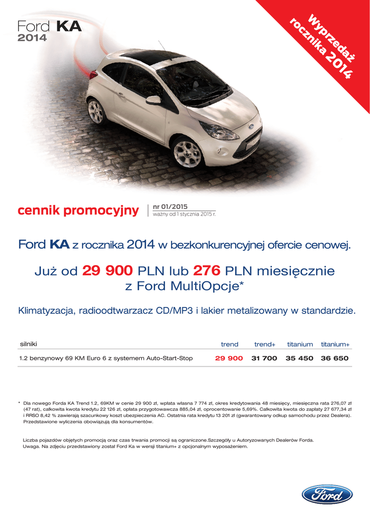 aż 14 ed 0 rz 2 yp ka W ni cz ro Ford KA 2014 cennik promocyjny nr 01/2015 ważny od 1 stycznia 2015 r. Ford KA z rocznika 2014 w bezkonkurencyjnej ofercie cenowej. Już od 29 900 PLN lub 276 PLN miesięcznie z Ford MultiOpcje* Klimatyzacja, radioodtwarzacz CD/MP3 i lakier metalizowany w standardzie. silniki 1.2 benzynowy 69 KM Euro 6 z systemem Auto-Start-Stop trend trend+ titanium titanium+ 29 900 31 700 35 450 36 650 * Dla nowego Forda KA Trend 1.2, 69KM w cenie 29 900 z∏, wp∏ata w∏asna 7 774 z∏, okres kredytowania 48 miesi´cy, miesi´czna rata 276,07 z∏ (47 rat), ca∏kowita kwota kredytu 22 126 z∏, op∏ata przygotowawcza 885,04 z∏, oprocentowanie 5,69%. Ca∏kowita kwota do zap∏aty 27 677,34 z∏ i RRSO 8,42 % zawierajà szacunkowy koszt ubezpieczenia AC. Ostatnia rata kredytu 13 201 z∏ (gwarantowany odkup samochodu przez Dealera). Przedstawione wyliczenia obowiàzujà dla konsumentów. Liczba pojazdów obj´tych promocjà oraz czas trwania promocji sà ograniczone.Szczegó∏y u Autoryzowanych Dealerów Forda. Uwaga. Na zdj´ciu przedstawiony zosta∏ Ford Ka w wersji titanium+ z opcjonalnym wyposa˝eniem. Ford KA 2014 wyposa˝enie bezpieczeƒstwo Uk∏ad przeciwblokujàcy (ABS) z elektronicznym systemem podzia∏u si∏y hamowania (EBD) oraz uk∏adem wsomagajàcym awaryjne hamowanie (EBA) Elektroniczny uk∏ad stabilizacji toru jazdy (ESC) wraz z hydraulicznym wspomaganiem hamulców (HBA) oraz uk∏adem u∏atwiajàcym ruszanie na wzniesieniach (HSA) Poduszki powietrzne – poduszki czo∏owe kierowcy i pasa˝era z przodu Boczne poduszki powietrzne Boczne kurtyny powietrzne (dost´pne tylko z dachem panoramicznym) Reflektory – Êwiat∏a halogenowe Reflektory – wy∏àcznik reflektorów z opóêniaczem (po opuszczeniu pojazdu) Przednie Êwiat∏a przeciwmgielne Wycieraczki przedniej szyby o pr´dkoÊci pracy dostosowujàcej si´ do pr´dkoÊci jazdy System minitorowania ciśnienia w oponach (TPMS) + m u i n nd tr e + nd e r t s s s s s s s s s – – s s s – s s s p s s s p s s 500 s 500 s s s s s s s s s s s s s – s s s – s s – s s – – s – – – s – p s – s – 40 850 s – p s – s – 40 s s 900 p s 400 s s 40 s s 900 p – s s s 40 s s s s s s – – p p – – s – – – – s s s s s s s s p s p s p s p – – 2 200 2 200 t it ium an tita komfort Elektryczny uk∏ad wspomagania kierownicy Elektrycznie sterowane szyby przednich drzwi R´cznie sterowane lusterka boczne, obudowy w kolorze czarnym (nielakierowane) R´cznie sterowane lusterka boczne, obudowy lakierowane w kolorze nadwozia Elektrycznie sterowane i podgrzewane lusterka boczne, obudowy lakierowane w kolorze nadwozia Klimatyzacja manualna Klimatyzacja z automatycznà regulacjà temperatury (EATC) Podgrzewana przednia szyba „Quickclear” Kierownica – 3-ramienna Kierownica pokryta skórà Kolumna kierownicy – z regulacjà pochylenia Dywaniki welurowe z przodu i z ty∏u Pakiet dla palàcych Centralna konsola na pod∏odze mi´dzy przednimi fotelami z jednym uchwytem na kubek Komputer pok∏adowy – wersja standardowa (zasi´g, zu˝ycie paliwa oraz Êrednia pr´dkoÊç podró˝y) Komputer pok∏adowy – wersja rozbudowana (zasi´g, zu˝ycie paliwa, Êrednia pr´dkoÊç podró˝y oraz temperatura zewn´trzna) Fotel kierowcy – z r´cznà regulacjà w 2 kierunkach (przesuwany do przodu/ty∏u) Fotel kierowcy – z r´cznà regulacjà w 4 kierunkach (przesuwany do przodu/ty∏u, góra/dó∏) Przedni fotel pasa˝era – z r´cznà regulacjà w 2 kierunkach Przedni fotel pasa˝era – z funkcjà „Easy entry”, u∏atwiajacà zajmowanie miejsc z ty∏u Podgrzewane przednie fotele (standard z tapicerkà skórzanà) Dach panoramiczny nieotwierany z filtrem przeciws∏onecznym oraz boczne kurtyny powietrzne s – wyposa˝enie standardowe – – opcja niedost´pna p – opcja dost´pna tylko w pakiecie Ford KA 2014 wyposa˝enie zabezpieczenia Elektroniczny immobilizer Centralny zamek sterowany pilotem, jeden sk∏adany kluczyk + m u i n nd tr e + nd e r t s – s s s s s s s s s s – s s 100 s 500 s s 100 s – s s 100 s – s s 100 s – s – s s – – – – 500 s – – – s – s s s – – – 500 s – – 500 1 300 1 950 s s s – – s 500 – s – 500 1 300 1 950 s s – s s s 500 – – s – 1 200 – 1 200 – 1 200 500 1 200 1 350 1 350 1 350 1350 – – – 4 200 – – – 4 200 t it ium an tita systemy audio i nawigacji Radioodtwarzacz CD/MP3, 4 g∏oÊniki, gniazdo AUX–IN do pod∏àczania zewn´trznych odtwarzaczy elementy funkcjonalne Tylna kanapa dzielona 50:50, sk∏adana System AUTO–START–STOP Dodatkowe gniazdko zasilania (12V) Ko∏o zapasowe dojazdowe mini Zestaw do naprawy ogumienia stylizacja Lakier niemetalizowany: Crystal, Flame Lakier metalizowany Lakier specjalny: Piste, Blush Zderzaki – przedni zderzak lakierowany w kolorze nadwozia Zderzaki – tylny zderzak lakierowany w kolorze nadwozia Klamki drzwi – lakierowane w kolorze nadwozia Klamki drzwi – chromowane Chromowana koƒcówka rury wydechowej Dodatkowo przyciemniane szyby w tylnej cz´Êci pojazdu Tylny spojler lakierowany w kolorze nadwozia 14” obr´cze stalowe, ko∏paki (wzór 6–ramienny) 15” obr´cze stalowe, ko∏paki (wzór 10–ramienny) 15” obr´cze ze stopów lekkich (wzór 13–ramienny) pakiety wyposa˝enia dodatkowego Pakiet High Gloss Black Interior – obudowa zegarów, konsola centralna, postument dêwigni zmiany biegów, ga∏ka dêwigni zmiany biegów, wstawki na kole kierownicy oraz siatka na drobiazgi – lakierowane w kolorze Gloss Black (ABBBE) Pakiet Winter - podgrzewana przednia szyba, podgrzewane przednie fotele (AB1BV) Pakiet Connectivity – zestaw g∏oÊnomówiàcy z Bluetooth i funkcjà sterowania g∏osem w j´zyku polskim, z∏àcze USB/iPod, funkcja odczytywania wiadomoÊci SMS w j´zyku polskim, zdalne sterowanie na kierownicy, rozbudowany komputer pok∏adowy (pakiet dost´pny do wersji Trend i Trend+ jedynie w 