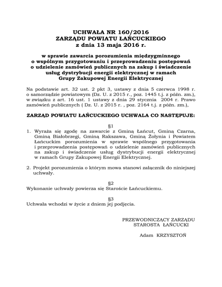 UCHWAŁA NR 160/2016 ZARZĄDU POWIATU ŁAŃCUCKIEGO z dnia 13 maja 2016 r. w sprawie zawarcia porozumienia międzygminnego o wspólnym przygotowaniu i przeprowadzeniu postępowań o udzielenie zamówień publicznych na zakup i świadczenie usług dystrybucji energii elektrycznej w ramach Grupy Zakupowej Energii Elektrycznej Na podstawie art. 32 ust. 2 pkt 3, ustawy z dnia 5 czerwca 1998 r. o samorządzie powiatowym (Dz. U. z 2015 r., poz. 1445 t.j. z późn. zm.), w związku z art. 16 ust. 1 ustawy z dnia 29 stycznia 2004 r. Prawo zamówień publicznych ( Dz. U. z 2015 r. , poz. 2164 t.j. z późn. zm.), ZARZĄD POWIATU ŁAŃCUCKIEGO UCHWALA CO NASTĘPUJE: §1 1. Wyraża się zgodę na zawarcie z Gminą Łańcut, Gminą Czarna, Gminą Białobrzegi, Gminą Rakszawa, Gminą Żołynia i Powiatem Łańcuckim porozumienia w sprawie wspólnego przygotowania i przeprowadzenia postępowań o udzielenie zamówień publicznych na zakup i świadczenie usług dystrybucji energii elektrycznej w ramach Grupy Zakupowej Energii Elektrycznej. 2. Projekt porozumienia o którym mowa stanowi załącznik do niniejszej uchwały. §2 Wykonanie uchwały powierza się Staroście Łańcuckiemu. §3 Uchwała wchodzi w życie z dniem jej podjęcia. PRZEWODNICZĄCY ZARZĄDU STAROSTA ŁAŃCUCKI Adam KRZYSZTOŃ Załącznik do uchwały Nr 160/2016 Zarządu Powiatu Łańcuckiego z dnia 13 maja 2016 r. POROZUMIENIE MIĘDZYGMINNE o wspólnym przygotowaniu i przeprowadzeniu postępowań o udzielenie zamówień publicznych oraz udzielenie pełnomocnictwa w ramach Grupy Zakupowej Energii Elektrycznej Gmin Powiatu Łańcuckiego zawarte w dniu…….…….2016 r. pomiędzy: Powiatem Łańcuckim, ul. Mickiewicza 2 37-100 Łańcut Reprezentowanym przez dwóch członków Zarządu w Osobach: Adam Krzysztoń – Starosta Łańcucki Barbara Pilawa – Kraus- Wicestarosta Łańcucki nazywaną dalej „Liderem”, a 1. Gminą Łańcut ul. Mickiewicza 2A 37-100 Łańcut reprezentowaną przez: Zbigniew Łoza– Wójt Gminy 2. Gminą Białobrzegi Białobrzegi 4 37-114 Białobrzegi reprezentowaną przez: Franciszek Masłoń – Wójt Gminy 3. Gminą Żołynia ul. Rynek 22 37-110 Żołynia reprezentowaną przez: Andrzej Benedyk – Wójt Gminy 4. Gminą Rakszawa Rakszawa 506 37-111 Rakszawa reprezentowaną przez: Maria Kula – Wójt Gminy 5. Gminą Czarna Czarna 260 37-125 Czarna reprezentowaną przez: Strona 1 z 3 POROZUMIENIE o wspólnym przygotowaniu i przeprowadzeniu postępowań o udzielenie zamówień publicznych w ramach Grupy Zakupowej Gminy……………………. Edward Dobrzański – Wójt Gminy nazywanych dalej „Partnerem” w oparciu o art. 4 pkt 8 i art. 16 ust. 1 ustawy z dnia 29 stycznia 2004r. Prawo zamówień publicznych (t.j. . Dz. U. z 2015 r., poz. 2164 z późn. zm) o następującej treści: §1 1. Strony Porozumienia postanawiają wspólnie przygotować i przeprowadzić postępowania o udzielenie zamówień publicznych: a) w trybie przetargu nieograniczonego na zakup energii elektrycznej, b) w trybie z wolnej ręki na świadczenie usług dystrybucji energii elektrycznej. §2 1. Strony Porozumienia wyznaczają spośród siebie Lidera, jako zamawiającego reprezentującego do przygotowania i przeprowadzenia postępowań o udzielenie zamówień publicznych, o których mowa w § 1, w imieniu stron Porozumienia i na rzecz stron Porozumienia, a także do występowania przed organami oraz sądami do tego uprawnionymi w związku z rozpatrywaniem odwołań i skarg. 2. Porozumienie będzie realizowane po jego podpisaniu przez upoważnionych przedstawicieli stron Porozumienia. 3. Strony porozumienia jednocześnie wyznaczają i udzielają firmie: ……………………………………………………………………………………………. pełnomocnictwa do dokonania w imieniu i na rzecz Lidera i Partnerów następujących czynności: - reprezentowania i występowania w imieniu Gmin i Powiatu Łańcuckiego, będącego Liderem porozumienia przed wszystkimi organami administracji publicznej oraz podmiotami gospodarczymi w zakresie realizacji postanowień porozumienia o współpracy w ramach Grupy Zakupowej Energii Elektrycznej, - przygotowania, uzgodnienia i przeprowadzenia postępowań o udzielenie zamówień publicznych: na zakup energii elektrycznej oraz na świadczenie usług dystrybucji energii elektrycznej wskazanych w § 1 oraz czynności określonych w § 2 pkt 1 porozumienia z wyłączeniem zawarcia umowy zakupu energii elektrycznej z wybranym w toku postępowania Wykonawcą - podejmowania wszelkich innych czynności niezbędnych do przeprowadzenia procedur przetargowych na zakup energii elektrycznej (w trybie przetargu nieograniczonego) oraz świadczenia usług dystrybucji energii elektrycznej (w trybie z wolnej ręki) Strona 2 z 3 POROZUMIENIE o wspólnym przygotowaniu i przeprowadzeniu postępowań o udzielenie zamówień publicznych w ramach Grupy Zakupowej Gminy……………………. §3 1. Przedmiot zamówienia publicznego, o którym mowa w § 1 pkt 1 lit. a) Porozumienia zostanie opisany w projekcie Specyfikacji Istotnych Warunków Zamówienia, 2. Przedmiot zamówienia publicznego, o którym mowa w § 1 pkt 1 lit. b) Porozumienia zostanie opisany w projekcie Szczegółowego opisu przedmiotu zamówienia. §4 Po wyborze najkorzystniejszych ofert, strony Porozumienia udzielą zamówień publicznych, o których mowa w § 1, we własnym imieniu i na własną rzecz, zawierając w tym celu odrębne umowy w sprawie zamówień publicznych. §5 Porozumienie wchodzi w życie z dniem podpisania. §6 Wszelkie zmiany Porozumienia mogą nastąpić jedynie w formie pisemnej pod rygorem nieważności. §7 W sprawach nieuregulowanych Porozumieniem będą miały zastosowanie obowiązujące przepisy Kodeksu Cywilnego oraz Ustawy Prawo zamówień publicznych. §8 Porozumienie sporządzono w jednobrzmiących egzemplarzach, po jednym dla każdej ze stron. Lider Partnerzy 1. …………………………. 2. ……