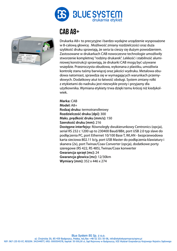 cab a8+ Drukarka A8+ to precyzyjne i bardzo wydajne urządzenie wysposażone w 8-calową głowicę . Możliwość zmiany rozdzielczości oraz duża szybkość druku sprawiają, że seria ta cieszy się dużym powodzeniem. Zastosowane w drukarkach CAB nowoczesne technologie umożliwiły stworzenie kompletnej "rodziny drukarek". Lekkość i stabilność aluminiowej konstrukcji sprawiają, że drukarki CAB mogą być używane wszędzie. Przezroczysta obudowa, wykonana z plastiku, umożliwia kontrolę stanu taśmy barwiącej oraz jakości wydruku. Metalowa obudowa natomiast, sprawdza się w wymagających warunkach przemysłowych. Dodatkowy atut to łatwość obsługi. System zmiany rolki z etykietami do nadruku jest niezwykle prosty i przyjazny dla użytkownika. Wymiana etykiety trwa dzięki temu krócej niż kiedykolwiek. Marka: CAB Model: A8+ Rodzaj druku: termotransferowy Rozdzielczość druku [dpi]: 300 Maks. prędkość druku [mm/s]: 150 Szerokość druku [mm]: 216 Dostępne interfejsy: Równoległy dwukierunkowy Centronics (opcja), serial RS 232 c 1200 up to 230400 Baud/8Bit, port USB 2.0 typ slave do podłączenia PC, port Ethernet 10/100 Base T, WLAN - bezprzewodowa karta sieciowa 802.11 b/g, port USB Master do podłączenia klawiatury i skanera (2x), port Twinax/Coax Converter (opcja), dodatkowe porty szeregowe (RS 422, RS 485), Twinax/Coax konwerter Gwarancja sprzęt [mc]: 24 Gwarancja głowica [mc]: 12/30km Wymiary [mm]: 352 x 446 x 274