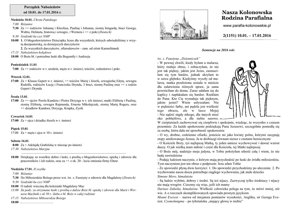 Porządek Nabożeństw od 10.01. do 17.01.2016 r. Niedziela 10.01. Chrztu Pańskiego 7:00 Różaniec 7:30 Za ++ rodziców Johannę i Kleofasa, Paulinę i Johanna, siostrę Irmgardę, braci Georga, Waltra, Helmuta, bratową i szwagra ,+Wernera i ++ z pokr.(Deutsch) 9:30 Godzinki ku czci NMP 10:00 1. O błogosławieństwo Dzieciątka Jezus dla wszystkich, których odwiedziliśmy z wizytą duszpasterską, za dzisiejszych darczyńców 2. Za wszystkich darczyńców, ofiarodawców - zam. od sióstr Karmelitanek 17:15 Nabożeństwo kolędowe 18:00 O Boże bł. i potrzebne łaski dla Bogumiły i Andrzeja Poniedziałek 11.01. 7:00 Za ++ rodziców w r. urodzin, męża w r. śmierci, teściów, rodzeństwo i pokr. Wtorek 12.01. 17:00 Za + Klausa Gepert w r. śmierci, ++ teściów Marię i Józefa, szwagierkę Edytę, szwagra Rudolfa, rodziców Łucję i Franciszka Drynda, 3 braci, siostrę Paulinę oraz ++ z rodzin Gepert i Drynda Środa 13.01. 17:00 Za ++ ojców Pawła Kandora i Piotra Drzyzga w r. ich śmierci, matki Elżbietę i Paulinę, siostrę Elżbietę, szwagra Rajmunda, Ernesta Mikołajczak, siostrę Marię Rogera, oraz ++ dziadków Kandora, Drzyzga, Krupka, Zyzik Czwartek 14.01. 17:00 Za + ojca i dziadka Józefa w r. śmierci Piątek 15.01. 17:00 Za + męża i ojca w 10 r. śmierci Sobota 16.01. 8:00 Za + Adelajdę Grabińską w miesiąc po śmierci 17:30 Nabożeństwo Maryjne ———————————————————————————————————— 18:00 Dziękując za wszelkie dobro i łaski, z prośbą o błogosławieństwo, opiekę i zdrowie dla pracowników i ich rodzin, oraz za ++ z ok. 20 - lecia istnienia firmy Eltete Niedziela 17.01. II zwykła 7:00 Różaniec 7:30 Do Miłosierdzia Bożego przez wst. św. s. Faustyny o zdrowie dla Magdaleny (Deutsch) 9:30 Godzinki ku czci NMP 10:00 O radość wieczną dla koleżanki Magdaleny Muc 13:00 Za podz. za otrzymane łaski z prośbą o dalsze Boże bł. opiekę i zdrowie dla Marii i Wernera Machnik z ok 50 r. ślubu o bł. Boże w całej rodzinie 17:15 Nabożeństwo Miłosierdzia Bożego 18:00 .………………………... Nasza Kolonowska Rodzina Parafialna www.parafia-kolonowskie.pl 2(1151) 10.01. – 17.01.2016 Sentencje na 2016 rok: św. s. Faustyna „Dzienniczek” - W pewnej chwili, kiedy byłam u malarza, który maluje obraz, i zobaczyłam, że nie jest tak piękny, jakim jest Jezus, zasmuciłam się tym bardzo, jednak ukryłam to w sercu głęboko. Kiedyśmy wyszły od malarza, matka przełożona została w mieście dla załatwienia różnych spraw, ja sama powróciłam do domu. Zaraz udałam się do kaplicy i napłakałam się bardzo. Rzekłam do Pana: Kto Cię wymaluje tak pięknym, jakim jesteś? Wtem usłyszałam: Nie w piękności farby, ani pędzla jest wielkość tego obrazu, ale w łasce Mojej - Nie sądzić nigdy nikogo, dla innych mieć oko pobłażliwe, a dla siebie surowe. W cierpieniach zachowywać się cierpliwie i spokojnie, wiedząc, że wszystko z czasem przeminie. Za każde upokorzenie podziękuję Panu Jezusowi, szczególnie pomodlę się za osobę, która dała mi sposobność upokorzenia - O wy, drobne, codzienne ofiarki, jesteście mi jako kwiaty polne, którymi zasypuję stopy umiłowanego Jezusa. Ja te drobiazgi równam nieraz z cnotami heroicznymi - O Kościele Boży, tyś najlepszą Matką, ty jeden umiesz wychowywać i dawać wzrost duszy. O jak wielką mam miłość i cześć dla Kościoła, tej Matki najlepszej - O Boże mój, nadziejo moja jedyna, w Tobie położyłam ufność całą i wiem, że nie będę zawiedziona - Podaję ludziom naczynie, z którym mają przychodzić po łaski do źródła miłosierdzia. Tym naczyniem jest ten obraz z podpisem: Jezu ufam Tobie - Ze spowiedzi płyną dwie korzyści: 1. Do spowiedzi przychodzimy po uleczenie. 2. Po wychowanie nasza dusza potrzebuje ciągłego wychowania, jak małe dziecko Simone Moro, himalaista - Są ludzie wybitni, dobrzy i średni. Są też nijacy. Zazwyczaj tylko średniacy i nijacy nie mają wrogów. Cieszmy się więc, jeśli ich mamy Dariusz Załuska, himalaista- Wielkość człowieka polega na tym, że mówi mniej, niż wie. A o rzeczach skomplikowanych opowiada prostym językiem Mount Everest – nazwa od inicjatora pomiarów wysokości, Anglika, sir Georga Everest. Czomolungma – po tybetańsku „mający głowę w niebie” 2/2016 Z planowanej książki „ Camino- Drogi życia” - Gdy rusza się w drogę, w pewnym sensie odsuwa się na bok codzienną rutynę, nawyki, przyzwyczajenia, żeby pogrążyć się całkowicie w innej, nieznanej rzeczywistości. Pozostawia się za plecami wiele rzeczy, które na co dzień wydają się do życia konieczne, a w drodze tylko ciążą. Ruszyć w drogę to przede wszystkim, wyjść poza samego siebie Martyna Wojciechowska, dziennikarka, podróżniczka - Mija złe, mija dobre, mija nijakie, wszystko mija. Takie jest życie - Prawdę o sobie poznajemy tylko w sytuacji ekstremalnej, ostatecznej. Potęgę drzemiącą w każdym z nas możemy dostrzec, kiedy osiągniemy dno śp. Jerzy Kukuczka, himalaista - Gdy zdobywa się ośmio tysięczniki, wtedy człowiek inaczej patrzy na życie, ludzi, siebie. Nie spotkałem człowieka, który po przekroczeniu pewnej wysokości aby się nie modlił śp. Artur Hajzer, himalaista - Życie jest jak szklanka do połowy zapełniona wodą. Można patrzeć na nią i widzieć, że jest do połowy pełna, lub patrzeć i dostrzegać, że jest do połowy pusta. Lepiej jest ludziom, którzy wyznają pierwszą filozofię życia. Innym też, z takim żyje się lepiej. Życie jest za krótkie i za piękne, aby tracić energię na małość i małych. Nie nakręcaj się nigdy negatywnie Wiesława Szymborska - Tyle wiemy o sobie, ile nas sprawdzono ——–————————–———————–—————-–——————— Bóg zapłać za: - wszystkie życzenia, prezenty, modlitwy - czas świąteczny: o. Arkowi, ch