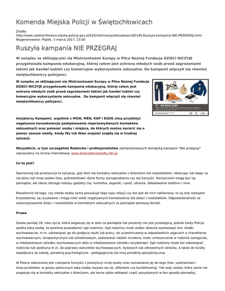 Komenda Miejska Policji w Świętochłowicach Źródło: http://www.swietochlowice.slaska.policja.gov.pl/k25/informacje/aktualnosci/62140,Ruszyla-kampania-NIE-PRZEGRAJ.html Wygenerowano: Piątek, 3 marca 2017, 23:00 Ruszyła kampania NIE PRZEGRAJ W związku ze zbliżającymi się Mistrzostwami Europy w Piłce Nożnej Fundacja DZIECI NICZYJE przygotowała kampanię edukacyjną, której celem jest ochrona młodych osób przed zagrożeniami takimi jak handel ludźmi czy komercyjne wykorzystanie seksualne. Do kampanii włączyli się również świętochłowiccy policjanci. W związku ze zbliżającymi się Mistrzostwami Europy w Piłce Nożnej Fundacja DZIECI NICZYJE przygotowała kampanię edukacyjną, której celem jest ochrona młodych osób przed zagrożeniami takimi jak handel ludźmi czy komercyjne wykorzystanie seksualne. Do kampanii włączyli się również świętochłowiccy policjanci. Inicjatorzy Kampanii, wspólnie z MSW, MEN, KGP i KGSG chcą przybliżyć negatywne konsekwencje podejmowania nieprzemyślanych kontaktów seksualnych oraz pokazać osoby i miejsca, do których można zwrócić się o pomoc zawsze wtedy, kiedy Wy lub Wasi znajomi znajdą się w trudnej sytuacji. Wszystkich, w tym szczególnie Rodziców i profesjonalistów zainteresowanych tematyką kampanii "Nie przegraj!" zapraszamy na stronę internetową: www.dzieciofiaryhandlu.fdn.pl Co to jest? Sponsoring lub prostytucja to sytuacja, gdy ktoś ma kontakty seksualne z dzieckiem lub nastolatkiem, obiecując lub dając za nie jemu lub innej osobie (tzw. pośrednikowi) różne formy wynagrodzenia czy też korzyści. Korzyściami mogą być np. pieniądze, ale także różnego rodzaju gadżety (np. komórka, zegarek, i-pod), ubrania, doładowanie telefonu i inne. Niezależnie od tego, czy młoda osoba sama poszukuje tego typu relacji czy też jest do nich nakłaniana, to są one rodzajem krzywdzenia, są ryzykowne i mogą mieć wiele negatywnych konsekwencji dla dzieci i nastolatków. Odpowiedzialność za wykorzystywanie dzieci i nastolatków w kontaktach seksualnych za pieniądze ponoszą dorośli. Prawo Osoba poniżej 18. roku życia, która angażuje się w seks za pieniądze lub prezenty nie jest przestępcą, jednak kiedy Policja spotka taką osobę, to powinna powiadomić sąd rodzinny. Sąd rodzinny może wobec dziecka zastosować tzw. środki wychowawcze, m.in. zobowiązać go do podjęcia nauki lub pracy, do uczestniczenia w odpowiednich zajęciach o charakterze wychowawczym, terapeutycznym lub szkoleniowym, zastosować nadzór kuratora, orzec umieszczenie w rodzinie zastępczej, w młodzieżowym ośrodku wychowawczym albo w młodzieżowym ośrodku socjoterapii. Sąd rodzinny może też zobowiązać rodziców lub opiekuna m.in. do poprawy warunków wychowawczych, bytowych lub zdrowotnych dziecka, a także do ścisłej współpracy ze szkołą, poradnią psychologiczno - pedagogiczną lub inną poradnią specjalistyczną. W Polsce zabronione jest czerpanie korzyści z prostytucji innej osoby oraz namawianie jej do tego (tzw. sutenerstwo i stręczycielstwo- w języku potocznym taką osobę nazywa się np. alfonsem czy burdelmamą). Tak więc osoba, która sama nie angażuje się w kontakty seksualne z dzieckiem, ale karze sobie oddawać część pozyskanych w ten sposób pieniędzy, popełnia przestępstwo. Zabronione jest również zmuszanie kogoś do uprawiania prostytucji. Tzw. „klienci” popełniają przestępstwo mając kontakt seksualny z dzieckiem, które nie ma jeszcze 15. lat lub, w przypadku dzieci starszych, namawiając je do płatnych kontaktów seksualnych. Międzynarodowa Konwencja o prawach dziecka mówi, że wszystkie osoby do 18 r. ż. powinny być chronione przed nakłanianiem, zmuszaniem i wykorzystywaniem do jakichkolwiek nielegalnych działań seksualnych. Ryzykowne zachowania i ich konsekwencje Niektóre osoby z różnych powodów podejmują decyzję o świadczeniu usług seksualnych. Główną motywacją może być chęć zarobienia pieniędzy czy zdobycia różnych atrakcyjnych rzeczy jak np. gadżetów czy ubrań. Wiele osób, które rozpoczynają podejmowanie kontakty seksualne za pieniądze lub prezenty sądzi, że jest to zajęcie na chwilę i tylko od nich zależy kiedy z tym skończą i jak to będzie wyglądało. To tylko złudzenie – w rzeczywistości młoda osoba jest bardzo podatna na skrzywdzenie i negatywny wpływ ze strony innych. Często jest jej trudno samodzielnie wycofać się ze sponsoringu lub prostytucji. Może się także zdarzyć, że nastolatki robią to pod presją innych osób, które je do tego namawiają (np. rówieśników czy też osób starszych). To naturalne, że w tym wieku najważniejsze jest to, co myślą o nas koledzy i koleżanki i robimy wiele rzeczy, aby być do nich podobnych i przez nich akceptowanym. Jednak czasem warto zastanowić się nad intencjami osób, które namawiają nas do ryzykowanych zachowań, i konsekwencjami jakie mogą z nich wyniknąć. Świadczenie usług seksualnych może doprowadzić do sytuacji niebezpiecznych np. narażenia na przemoc ze strony tzw. „klientów” (przemoc fizyczna, szantaż, groźby) czy sutenerów, choroby przenoszone drogą płciową czy niechciane ciąże, uzależnienie od alkoholu czy narkotyków. Obawa dziecka, że bliskie osoby dowiedzą się o tym, czym się ono zajmuje, może ułatwiać sprawcom szantażowanie dziecka. Takie doświadczenia mogą również wpływać na relacje z innymi osobami np. utrudniać w przyszłości tworzenie związków opartych na bliskości i szacunku. Identyfikacja zachowań / sposobów działania potencjalnych sprawców Osoby, które czerpią korzyści lub zmuszają dzieci do prostytucji są przestępcami (może to być osoba z rodziny, osoba znajoma, chłopak lub dziewczyna i właściwie każda inna osoba). Aby do tego doprowadzić, często manipulują dzieckiem. Wydają się osobami miłymi i atrakcyjnymi- mogą wcale nie przypominać bezwzględnych przestęp