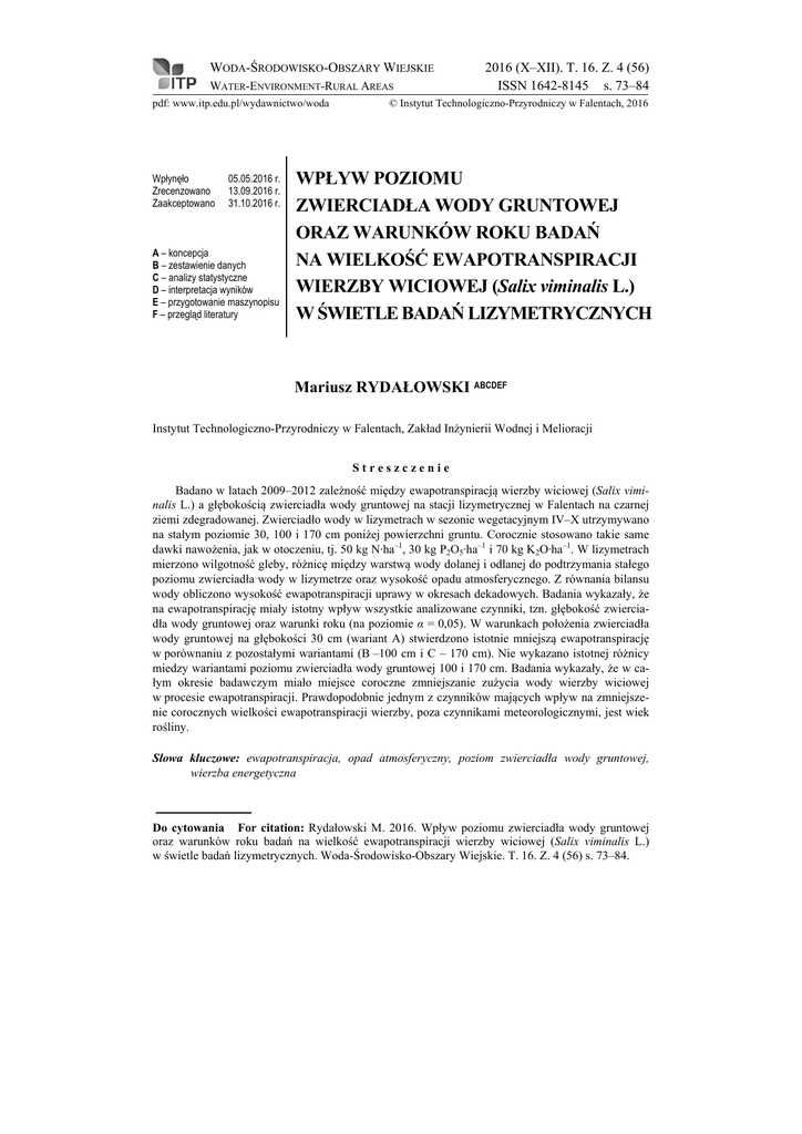 WODA-ŚRODOWISKO-OBSZARY WIEJSKIE WATER-ENVIRONMENT-RURAL AREAS pdf: www.itp.edu.pl/wydawnictwo/woda Wpłynęło Zrecenzowano Zaakceptowano 05.05.2016 r. 13.09.2016 r. 31.10.2016 r. A – koncepcja B – zestawienie danych C – analizy statystyczne D – interpretacja wyników E – przygotowanie maszynopisu F – przegląd literatury 2016 (X–XII). T. 16. Z. 4 (56) ISSN 1642-8145 s. 73–84 © Instytut Technologiczno-Przyrodniczy w Falentach, 2016 WPŁYW POZIOMU ZWIERCIADŁA WODY GRUNTOWEJ ORAZ WARUNKÓW ROKU BADAŃ NA WIELKOŚĆ EWAPOTRANSPIRACJI WIERZBY WICIOWEJ (Salix viminalis L.) W ŚWIETLE BADAŃ LIZYMETRYCZNYCH Mariusz RYDAŁOWSKI ABCDEF Instytut Technologiczno-Przyrodniczy w Falentach, Zakład Inżynierii Wodnej i Melioracji Streszczenie Badano w latach 2009–2012 zależność między ewapotranspiracją wierzby wiciowej (Salix viminalis L.) a głębokością zwierciadła wody gruntowej na stacji lizymetrycznej w Falentach na czarnej ziemi zdegradowanej. Zwierciadło wody w lizymetrach w sezonie wegetacyjnym IV–X utrzymywano na stałym poziomie 30, 100 i 170 cm poniżej powierzchni gruntu. Corocznie stosowano takie same dawki nawożenia, jak w otoczeniu, tj. 50 kg N∙ha–1, 30 kg P2O5∙ha–1 i 70 kg K2O∙ha–1. W lizymetrach mierzono wilgotność gleby, różnicę między warstwą wody dolanej i odlanej do podtrzymania stałego poziomu zwierciadła wody w lizymetrze oraz wysokość opadu atmosferycznego. Z równania bilansu wody obliczono wysokość ewapotranspiracji uprawy w okresach dekadowych. Badania wykazały, że na ewapotranspirację miały istotny wpływ wszystkie analizowane czynniki, tzn. głębokość zwierciadła wody gruntowej oraz warunki roku (na poziomie α = 0,05). W warunkach położenia zwierciadła wody gruntowej na głębokości 30 cm (wariant A) stwierdzono istotnie mniejszą ewapotranspirację w porównaniu z pozostałymi wariantami (B –100 cm i C – 170 cm). Nie wykazano istotnej różnicy miedzy wariantami poziomu zwierciadła wody gruntowej 100 i 170 cm. Badania wykazały, że w całym okresie badawczym miało miejsce coroczne zmniejszanie zużycia wody wierzby wiciowej w procesie ewapotranspiracji. Prawdopodobnie jednym z czynników mających wpływ na zmniejszenie corocznych wielkości ewapotranspiracji wierzby, poza czynnikami meteorologicznymi, jest wiek rośliny. Słowa kluczowe: ewapotranspiracja, opad atmosferyczny, poziom zwierciadła wody gruntowej, wierzba energetyczna Do cytowania For citation: Rydałowski M. 2016. Wpływ poziomu zwierciadła wody gruntowej oraz warunków roku badań na wielkość ewapotranspiracji wierzby wiciowej (Salix viminalis L.) w świetle badań lizymetrycznych. Woda-Środowisko-Obszary Wiejskie. T. 16. Z. 4 (56) s. 73–84. 74 Woda-Środowisko-Obszary Wiejskie. T. 16. Z. 4 (56) WSTĘP Ewapotranspiracja jest procesem bardzo złożonym, zależnym od wielu czynników środowiskowych oraz trudno mierzalnym w rzeczywistości. Definiowana jest z reguły jako ilość pary wodnej odprowadzanej do atmosfery wskutek parowania z gleby i transpiracji roślin w istniejących warunkach meteorologicznych, przy aktualnym stanie uwilgotnienia gleby, wraz z intercepcją [JAWORSKI 2004]. Najdokładniejszy obraz tego zjawiska dają pomiary bezpośrednie z zastosowaniem lizymetrów lub ewaporometrów glebowych [ALLEN i in. 2011; BAC, ROJEK 1999]. Uprawa roślin na cele energetyczne jest propagowana w Polsce jako nowy kierunek produkcji rolniczej, który ma przyczynić się do poprawy sytuacji materialnej polskiego rolnictwa oraz rozwoju regionów. Na podstawie opracowanej przez Światową Organizację Meteorologiczną (WMO) komputerowej prognozy wzrostu i produktywności wierzby wiciowej na plantacjach polowych stwierdzono, że w Polsce istnieją korzystne warunki do produkcji drewna z wierzb [BANASZYŃSKI i in. 2004]. Z danych Głównego Urzędu Statystycznego [GUS 2015] wynika, że w latach 2010–2014 występowały stosunkowo niewielkie wahania wielkości krajowego pozyskania biopaliwa stałego. Największą dynamikę wzrostu produkcji energii ze źródeł odnawialnych, przewiduje się właśnie w sektorze biomasy [Ministerstwo Gospodarki 2009]. Będzie ona najważniejszym odnawialnym źródłem energii w Polsce, stanowiąc 73% całkowitego zużycia energii ze źródeł odnawialnych w 2030 r. [International Renewable Energy Agency 2015]. Wierzba wiciowa (Salix viminalis L.) przedstawiana jest jako roślina o dużych potrzebach wodnych, której uprawa często bardzo mocno wpływa na zmiany poziomu zwierciadła wody gruntowej, a w konsekwencji na warunki hydrologiczne w zlewni [KANECKA-GESZKE 2015]. Badania różnych odmian i klonów wierzby, prowadzone w różnych warunkach klimatyczno-siedliskowych oraz z zastosowaniem odmiennych metod wykazują bardzo duże różnice wielkości ewapotranspiracji. Według TROJANOWSKIEJ [2010], wielkości te wahają się od 100 do 1790 mm w okresie wegetacyjnym. Zużycie wody przez uprawę uzależnione jest od gatunku rośliny, jej plonu, warunków meteorologicznych, a przede wszystkim od długości okresu wegetacyjnego. Potrzeby wodne upraw rolniczych, rozumiane jako zapotrzebowanie na wodę niezbędne do osiągnięcia określonego efektu produkcyjnego, mogą być zaspokajane z opadów atmosferycznych, naturalnego dopływu wód gruntowych lub nawodnień. Wszystkie te zjawiska i procesy mają bezpośredni wpływ na ilość wody dostępnej dla roślin. Wykorzystanie wody gruntowej przez rośliny uzależnione jest od głębokości jej zalegania, budowy systemu korzeniowego rośliny oraz rodzaju gleby. Należy jednak podkreślić, że w przeciwieństwie do upraw polowych czy łąk, które z reguły zasilane są wodą zretencjonowaną w strefie aeracji, wierzba, dzięki głębokiemu i ekspansywnemu systemowi korzeniowemu, może wykorzystywać również płytko zalegające wody gruntowe. © ITP Woda Środ. Obsz. Wiej. 2016 (X–XII). T. 16. Z. 4 (56) M. Rydałowski: Wpływ poziomu zwierciadła 