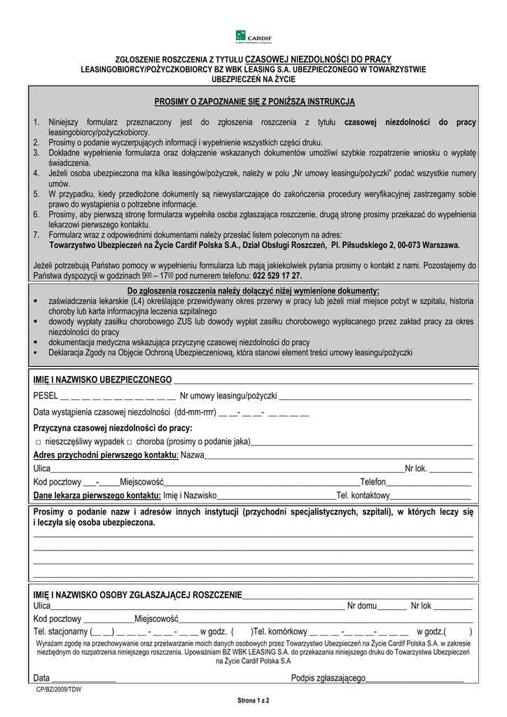 ZGŁOSZENIE ROSZCZENIA Z TYTUŁU CZASOWEJ NIEZDOLNOŚCI DO PRACY LEASINGOBIORCY/POśYCZKOBIORCY BZ WBK LEASING S.A. UBEZPIECZONEGO W TOWARZYSTWIE UBEZPIECZEŃ NA śYCIE CARDIF POLSKA S.A. PROSIMY O ZAPOZNANIE SIĘ Z PONIśSZĄ INSTRUKCJĄ 1. 2. 3. 4. 5. 6. 7. Niniejszy formularz przeznaczony jest do zgłoszenia roszczenia z tytułu czasowej niezdolności do pracy leasingobiorcy/poŜyczkobiorcy. Prosimy o podanie wyczerpujących informacji i wypełnienie wszystkich części druku. Dokładne wypełnienie formularza oraz dołączenie wskazanych dokumentów umoŜliwi szybkie rozpatrzenie wniosku o wypłatę świadczenia. JeŜeli osoba ubezpieczona ma kilka leasingów/poŜyczek, naleŜy w polu „Nr umowy leasingu/poŜyczki” podać wszystkie numery umów. W przypadku, kiedy przedłoŜone dokumenty są niewystarczające do zakończenia procedury weryfikacyjnej zastrzegamy sobie prawo do wystąpienia o potrzebne informacje. Prosimy, aby pierwszą stronę formularza wypełniła osoba zgłaszająca roszczenie, drugą stronę prosimy przekazać do wypełnienia lekarzowi pierwszego kontaktu. Formularz wraz z odpowiednimi dokumentami naleŜy przesłać listem poleconym na adres: Towarzystwo Ubezpieczeń na śycie Cardif Polska S.A., Dział Obsługi Roszczeń, Pl. Piłsudskiego 2, 00-073 Warszawa. JeŜeli potrzebują Państwo pomocy w wypełnieniu formularza lub mają jakiekolwiek pytania prosimy o kontakt z nami. Pozostajemy do Państwa dyspozycji w godzinach 900 – 1700 pod numerem telefonu: 022 529 17 27. Do zgłoszenia roszczenia naleŜy dołączyć niŜej wymienione dokumenty: zaświadczenia lekarskie (L4) określające przewidywany okres przerwy w pracy lub jeŜeli miał miejsce pobyt w szpitalu, historia choroby lub karta informacyjna leczenia szpitalnego dowody wypłaty zasiłku chorobowego ZUS lub dowody wypłat zasiłku chorobowego wypłacanego przez zakład pracy za okres niezdolności do pracy dokumentacja medyczna wskazująca przyczynę czasowej niezdolności do pracy Deklaracja Zgody na Objęcie Ochroną Ubezpieczeniową, która stanowi element treści umowy leasingu/poŜyczki IMIĘ I NAZWISKO UBEZPIECZONEGO ______________________________________________________________________ PESEL __ __ __ __ __ __ __ __ __ __ __ Nr umowy leasingu/poŜyczki _____________________________________________ Data wystąpienia czasowej niezdolności (dd-mm-rrrr) __ __- __ __- __ __ __ __ Przyczyna czasowej niezdolności do pracy: □ nieszczęśliwy wypadek □ choroba (prosimy o podanie jaka)____________________________________________________ Adres przychodni pierwszego kontaktu: Nazwa_______________________________________________________________ Ulica___________________________________________________________________________________Nr lok. __________ Kod pocztowy ___-_____Miejscowość______________________________________________Telefon____________________ Dane lekarza pierwszego kontaktu: Imię i Nazwisko____________________________Tel. kontaktowy___________________ Prosimy o podanie nazw i adresów innych instytucji (przychodni specjalistycznych, szpitali), w których leczy się i leczyła się osoba ubezpieczona. _______________________________________________________________________________________________________ _______________________________________________________________________________________________________ _______________________________________________________________________________________________________ _______________________________________________________________________________________________________ IMIĘ I NAZWISKO OSOBY ZGŁASZAJĄCEJ ROSZCZENIE______________________________________________________ Ulica_____________________________________________________________________ Nr domu_______ Nr lok _________ Kod pocztowy ____________Miejscowość_____________________________________________________________________ Tel. stacjonarny (__ __) __ __ __ - __ __ - __ __ w godz. ( )Tel. komórkowy __ __ __ -__ __ __- __ __ __ w godz.( ) WyraŜam zgodę na przechowywanie oraz przetwarzanie moich danych osobowych przez Towarzystwo Ubezpieczeń na śycie Cardif Polska S.A. w zakresie niezbędnym do rozpatrzenia niniejszego roszczenia. UpowaŜniam BZ WBK LEASING S.A. do przekazania niniejszego druku do Towarzystwa Ubezpieczeń na śycie Cardif Polska S.A Data _______________ Podpis zgłaszającego_______________________ CP/BZ/2009/TDW Strona 1 z 2 ZGŁOSZENIE ROSZCZENIA Z TYTUŁU CZASOWEJ NIEZDOLNOŚCI DO PRACY LEASINGOBIORCY/POśYCZKOBIORCY BZ WBK LEASING S.A. UBEZPIECZONEGO W TOWARZYSTWIE UBEZPIECZEŃ NA śYCIE CARDIF POLSKA S.A. OŚWIADCZENIE LEKARZA do roszczeń z tytułu czasowej niezdolności do pracy Imię i Nazwisko Ubezpieczonego PESEL Miejsce Zamieszkania Ubezpieczonego Proszę określić datę zdarzenia* (dzień, miesiąc, rok) *Data zdarzenia – pierwszy dzień zwolnienia lekarskiego, Przyczyna niezdolności do pracy: choroba nieszczęśliwy wypadek W przypadku, gdy niezdolność do pracy powstała w wyniku choroby proszę wymienić nazwę (nazwy) choroby: Czy pacjent był leczony w ciągu ostatnich 5 lat z powodu chorób przewlekłych? Jeśli tak to proszę podać następujące informacje: L.p. Nazwa choroby lub obraŜenia (ewentualnie kod ICD-10) Data rozpoznania i/lub hospitalizacji TAK NIE Nazwa i adres placówki medycznej 1 2 3 4 5 W przypadku, gdy czasowa niezdolność do pracy powstała w wyniku nieszczęśliwego wypadku proszę podać okoliczności zdarzenia: Miejsce wypadku: Jeśli było prowadzone postępowanie wyjaśniające, proszę wskazać prokuraturę: ...................................................................... Czy według posiadanej wiedzy Ubezpieczony w chwili nieszczęśliwego wypadku pozostawał pod wpływem: alkoholu środków odurzających inne ................................................. Tak Tak Tak Nie Nie Nie Nie wiem Nie wiem Nie wiem Oświadczam, Ŝe zgodnie z moim przekonaniem i wiedzą powyŜsze stwierdzenia są prawdziwe i wyczerpuj