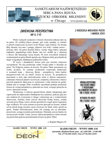 SANKTUARIUM NAJŚWIĘTSZEGO SERCA PANA JEZUSA JEZUICKI OŚRODEK MILENIJNY w Chicago www.jezuici.org 2 niedziela wielkiego postu 1 marca 2015 zmieniona perspektywa Mk 9, 2-10 Wiele ważnych wydarzeń w historii zbawienia dokonywało się na górze. Po wielkiej klęsce potopu, gdy wody opadały, to właśnie w górach rozpoczyna się nowe życie Noego i jego rodziny. Na Synaju Bóg okazuje swą moc i potęgę, objawia swą wolę i nadaje prawo – dziesięć słów. Na górze Karmel Eliasz, wierny sługa Jahwe, pokonał kapłanów pogańskiego kultu Baala, tam też, modlił się z ufnością o deszcz dla ukaranego suszą Izraela. Po tych wszystkich trudnych wydarzeniach na górze Horeb spotyka się z Bogiem, który przychodzi do niego w łagodnym, delikatnym podmuchu wiatru. W życiu i działalności Jezusa góra jest również miejscem szczególnym. Na niej przekazuje sedno swojej nauki w Kazaniu na górze. Na Golgocie umiera na krzyżu. Na górze Tabor przemienia się wobec uczniów. To ostatnie wydarzenie rozpoczęło budowanie w uczniach innej – zbawczej, Bożej – perspektywy, która będzie przygotowywała ich na śmierć Jezusa na krzyżu. Ta perspektywa pozostanie w nich, jako doświadczenie, które w obliczu samotności, załamania własnych planów życiowych, cierpienia, odrzucenia i śmierci pozwoli popatrzeć dalej poza te wydarzenia i ciało złożone do grobu. Jednak nim to nastąpi, Piotr wszelkimi sposobami próbuje przekonać Jezusa do swojej perspektywy patrzenia na świat, swojego pomysłu na życie i zbawienie świata. Wydarzenie, w którym apostoł bierze udział, interpretuje jako zaproszenie do odpoczynku (zbudujemy trzy namioty), podczas gdy jest ono znakiem do wyruszenia w drogę i zmierzenia się z wydarzeniami zbawczymi. Zasłona, która zawsze okrywała Osobę Jezusa, została zerwana przez Boga i przez chwilę apostołowie mogli ujrzeć tajemnicę Jego wielkości. Po czym zasłona na powrót spoczęła na Jezusie. Jednak od tej chwili drogę uczniów może oświecać ów blask, który ujrzeli na górze. Trudne doświadczenia, które ich czekają, nie są odwołane, przeciwnie, zostają wyraźnie potwierdzone. Niemniej zawsze będzie im towarzyszyło światło. I inna, szersza, dalsza perspektywa, która otwarła się przed nimi podczas przemienienia Jezusa na górze Tabor. droga Krzyżowa dla dzieci wraz z rodzicami w czwartki po mszy św. o godz. 19:00. w piątki po MSzy Św. o godz. 19:00 o. Bogdan Długosz SJ RADIO DEON WNWI 1080 AM RADIO DEON - WNWI 1080 AM poranek z Radiem Deon: pon. - pt. 6:00 AM - 11:00 AM Tel. (773) 283 2425 / Fax. (773) 283 2435 PORZĄDEK MSZY ŚWIĘTYCH Poniedziałek - pi¹tek: 8:00, 18:00, 19:00 (radiowa: WCEV 1450) I piątek miesiąca: 8:00, 19:00, 20:30 Środa: 19:00 - nowenna do Matki Bożej Nieustającej Pomocy Sobota: 8:00 i 19:00 , tylko w I sobotę miesiąca o 17:00 dla chorych, Niedziela: 8:00 (radiowa), 9:30, 11:00, 13:00, 19:00, 20:30 -=- SpowiedŸ św.: od poniedziałku do soboty - 7:30 i 18:30, w niedzielę - pó³ godziny przed ka¿d¹ Msz¹ Œwiêt¹, w1. pi¹tek miesi¹ca - od 17:30 do 20:00 Adoracja Najświętszego Sakramentu - od poniedziałku do czwartku - od 18:30 do 19:00 sobota - od 18:00 do 19:00 Sanktuarium Najświętszego Serca Pana Jezusa Jezuicki Ośrodek Milenijny 5835 W. Irving Park Rd.; Chicago, IL 60634, Tel. 773 777 7000; fax 773 427 0126 www.jezuici.org e-mail: [email protected] Audycje Radia DEON: tel. 773 283 2425 Fax. 773 283 2435 www. radiodeon.com e-mail: [email protected] Biuro czynne: od poniedziałku do soboty: 8:30 - 9:00, 15:30 - 20:30 niedziela: 8:30 - 15:00 Biblioteka czynna: sobota: 18:00 - 19:00; niedziela: 10:30 - 14:30; Kawiarenka czynna: niedz.: 10:00 - 15:00 Sacred Heart Mission House 4105 N. Avers Ave., Chicago, IL 60618 Tel. 773 588 74 76; fax 773 588 65 17 Rektor Sanktuarium i Przełożony Jezuitów o. Tomasz Oleniacz , SJ (773-588-7476 - ext. 224) o. Józef Birecki, SJ (773-777-7000 - ext. 121) o. Jerzy Mordarski, SJ (773-588-7476 - ext. 234) o. Jerzy Karpiński, SJ (773-588-7476 - ext. 237) o. Paweł Witon, SJ (773-588-7476 - ext. 227) br. Adam Poręba, SJ (773-777-7000 - ext. 122) Wszelkie ofiary i donacje prosimy kierowaæ na adres Sanktuarium. Donacje s¹ wolne od podatku i mo¿na je odpisywaæ przy rozliczeniu z IRS. TRANSMISJE RADIOWE I INTERNETOWE od poniedziałku do piątku,transmisja Mszy Św. z godz. 19:00 Radio WCEV 1450 (www.wcev1450.com) Niedziela 9:30 www.RadioSiedeM.net w niedziele: godz 8-9, Radio WCEV 1450, oraz Polskie Radio Chicago 1030 WNVR www.polskieradio.com) Codziennie przez całą dobę: Kamera internetowa z Sanktuarium (obraz i dźwięk; używać Internet Explorer): www.jezuici.org - link „Transmisje na żywo” – wpisać jako użytkownik i hasło: 5835 INTENCJE MSZY ŚWIĘTYCH Niedziela, 1 III 2015 8:00 za Dobroczyńców Jezuickiego Ośrodka Milenijnego 9:30 Zbiorowa 11:00 w intencja Filipka w 4. rocznicę urodzin o potrzebne łaski i opiekę Matki Bożej 13:00 + Rozalia Kuroń w 5. rocznicę śmierci 19:00 Zbiorowa 20:30 + + Józef i Bronisława Soweccy Poniedziałek, 2 III 8:00 o zdrowie i Boże błogosławieństwo dla Rene Janis 18:00 + Zenon Polak w rocznicę śmierci 19:00 Zbiorowa Wtorek, 3 III 8:00 w intencji Aleksandra i Elżbiety Górka i ich rodzin, dziękczynno-błagalna o błogosławieństwo, Miłosierdzie Boże i opiekę Mateczki Najświętszej w 54. rocznicę ślubu 18:00 + + Kazimierz i Anna Laski, + + Kazimierz Tyrański, + + Małgorzata Susu, + + Jan i Aniela Tyrański 19:00 Zbiorowa Środa, 4 III - św. Kazimierza 8:00 za Dobroczyńców Jezuickiego Ośrodka Milenijnego 18:00 + Bolesław Mazur 19:00 Zbiorowa I Czwartek, 5 III 8:00 + Jan Nowosiński 18:00 + + Witold i Janina Ekiert 19:00 Zbiorowa I Piątek, 6 III 8:00 o Boże błogosławieństwo i opiekę Matki Bożej dla syna Mateuszka 18:00 Zbiorowa 19:00 Wynagradzająca Najświętszemu Sercu Jezusa i za Czytelników Posłańca I Sobota, 7 III 8:00 + Klaudia Brdej, o spokój i r