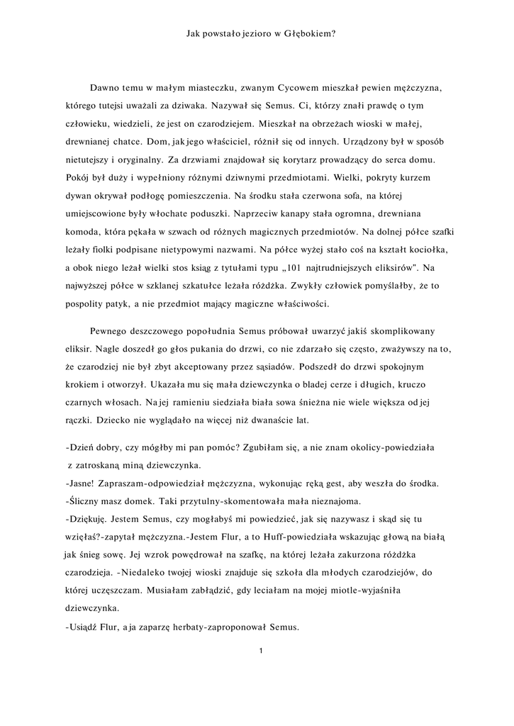 Jak powstało jezioro w Głębokiem? Dawno temu w małym miasteczku, zwanym Cycowem mieszkał pewien mężczyzna, którego tutejsi uważali za dziwaka. Nazywał się Semus. Ci, którzy znałi prawdę o tym człowieku, wiedzieli, że jest on czarodziejem. Mieszkał na obrzeżach wioski w małej, drewnianej chatce. Dom, jak jego właściciel, różnił się od innych. Urządzony był w sposób nietutejszy i oryginalny. Za drzwiami znajdował się korytarz prowadzący do serca domu. Pokój był duży i wypełniony różnymi dziwnymi przedmiotami. Wielki, pokryty kurzem dywan okrywał podłogę pomieszczenia. Na środku stała czerwona sofa, na której umiejscowione były włochate poduszki. Naprzeciw kanapy stała ogromna, drewniana komoda, która pękała w szwach od różnych magicznych przedmiotów. Na dolnej półce szafki leżały fiolki podpisane nietypowymi nazwami. Na półce wyżej stało coś na kształt kociołka, a obok niego leżał wielki stos ksiąg z tytułami typu „101 najtrudniejszych eliksirów". Na najwyższej półce w szklanej szkatułce leżała różdżka. Zwykły człowiek pomyślałby, że to pospolity patyk, a nie przedmiot mający magiczne właściwości. Pewnego deszczowego popołudnia Semus próbował uwarzyć jakiś skomplikowany eliksir. Nagle doszedł go głos pukania do drzwi, co nie zdarzało się często, zważywszy na to, że czarodziej nie był zbyt akceptowany przez sąsiadów. Podszedł do drzwi spokojnym krokiem i otworzył. Ukazała mu się mała dziewczynka o bladej cerze i długich, kruczo czarnych włosach. Na jej ramieniu siedziała biała sowa śnieżna nie wiele większa od jej rączki. Dziecko nie wyglądało na więcej niż dwanaście lat. -Dzień dobry, czy mógłby mi pan pomóc? Zgubiłam się, a nie znam okolicy-powiedziała z zatroskaną miną dziewczynka. -Jasne! Zapraszam-odpowiedział mężczyzna, wykonując ręką gest, aby weszła do środka. -Śliczny masz domek. Taki przytulny-skomentowała mała nieznajoma. -Dziękuję. Jestem Semus, czy mogłabyś mi powiedzieć, jak się nazywasz i skąd się tu wzięłaś?-zapytał mężczyzna.-Jestem Flur, a to Huff-powiedziała wskazując głową na białą jak śnieg sowę. Jej wzrok powędrował na szafkę, na której leżała zakurzona różdżka czarodzieja. -Niedaleko twojej wioski znajduje się szkoła dla młodych czarodziejów, do której uczęszczam. Musiałam zabłądzić, gdy leciałam na mojej miotle-wyjaśniła dziewczynka. -Usiądź Flur, a ja zaparzę herbaty-zaproponował Semus. 1 Czarodziej nie miał pojęcia, jak pomóc zabłąkanej dziewczynce. Najpierw pomyślał, że mogą polecieć na miotach, ale to byłoby zbyt ryzykowne, ponieważ Semus był kompletnie zielony w sprawach latania. Drugim pomysłem mężczyzny było napisanie listu do dyrektora magicznej szkoły i powiadomienie go o zagubieniu się jednej z jego uczennic, lecz ten pomysł też był beznadziejny, gdyż czarodziej nie znał adresu szkoły. Ostatnią deską ratunku zostało uwarzenie eliksiru, w czym czarodziej czuł się jak ryba w wodzie. Tylko jaki eliksir mógłby teleportować dziewczynkę na teren szkoły? Semus podszedł do małego stolika, kładąc na nim dwa kubki gorącej cieczy. -Więc Flur, może powiesz mi coś o sobie? Jak się uczysz? -zapytał, spoglądają prosto w niebieskie jak ocean oczy dziewczynki. -Uczęszczam do drugiej klasy, jestem najlepszą uczennicą w moim roczniku i reprezentuję szkołę w corocznym konkursie „Zaklęcia i uroki wcale nie są trudne"-odpowiedziała dumnie podnosząc głowę. -A lubisz eliksiry? -zapytał z nadzieją czarodziej-Ja jestem mistrzem w tej dziedzinie. -Uwielbiam! -wykrzyknęła Flur-Na koniec roku miałam najwyższy stopień. -Wspaniale! Jeśli byś chciała, moglibyśmy uwarzyć eliksir, który zdołałby przenieść cię do szkoły-oznajmił mężczyzna-Co ty na to? -Bardzo chętnie. Lecz nie mamy za dużo czasu. Pojutrze rozpoczyna się rok szkolnyna twarzy dziewczyny można było zobaczyć zakłopotanie.Z-dążymy. Poczekaj, zaraz ci coś pokażę-wstał, podszedł do szafki z której wyciągnął swoją zakurzoną różdżkę i krzyknął: -Lesandrom!-z końca drewnianego przedmiotu wystrzelił złotawy blask, który powędrował w stronę szafki, gdzie leżały fiolki i stał kociołek. Po chwili wszystkie składniki i narzędzia leżały na okrągłym stoliku, a na rękach Semusa wylądował opasły tom zatytułowany „Eliksiry-program dla zaawansowanych". Flur przyglądała się z zachwytem poczynaniom starszego od siebie czarodzieja.-To było wspaniałe! -wykrzyknęła dziewczynka, podnosząc się z kanapy. Podeszła do Semusa i zajrzała mu przez ramię, aby dowiedzieć się, jaki eliksir będą starali się zrobić. -To jak? Zaczynamy? -czarodziej położył otwartą księgę na stoliku obok kociołka i nalał do niego wody. -Spróbujemy zrobić eliksir teleportacji. Do łatwych on nie należy, ale powinniśmy dać radę! Młoda czarodziejka podeszła dziarskim krokiem do stolika, przy którym stał już Semus. Mężczyzna zawzięcie kroił żabie nóżki, a dziewczyna powoli mieszała gotujący się w kociołku wywar. Po około trzech godzinach zawziętej pracy dwójki czarodziejów eliksir był prawie gotowy. 2 « - Wystarczy dodać ostatni, ale najważniejszy składnik-włos z grzywy jednorożca. Jako, że składnik ten ma niemałą moc, trzeba się z nim obchodzić nad wyraz ostrożnie-powiedział mężczyzna, spoglądają na robiącą notatki Flur.-Jesteś jeszcze młoda i niedoświadczona, więc ja to zrobię, ale najpierw rzucę na ciebie zaklęcie tarczy, które osłoni cię, gdyby miało się coś stać.- Inventimento! -krzykną Semus, a wokół Flur uniósł się jasno czerwony pył.-Uwaga, wrzucam! W ułamku sekundy ostatni składnik eliksiru wylądował w bulgoczącym kociołku. Wywar nagle zmienił kolor na jasnozielony i wybuchł. Cały pokój zapełnił się dymem, prze który nic nie było widać. Flur, która by