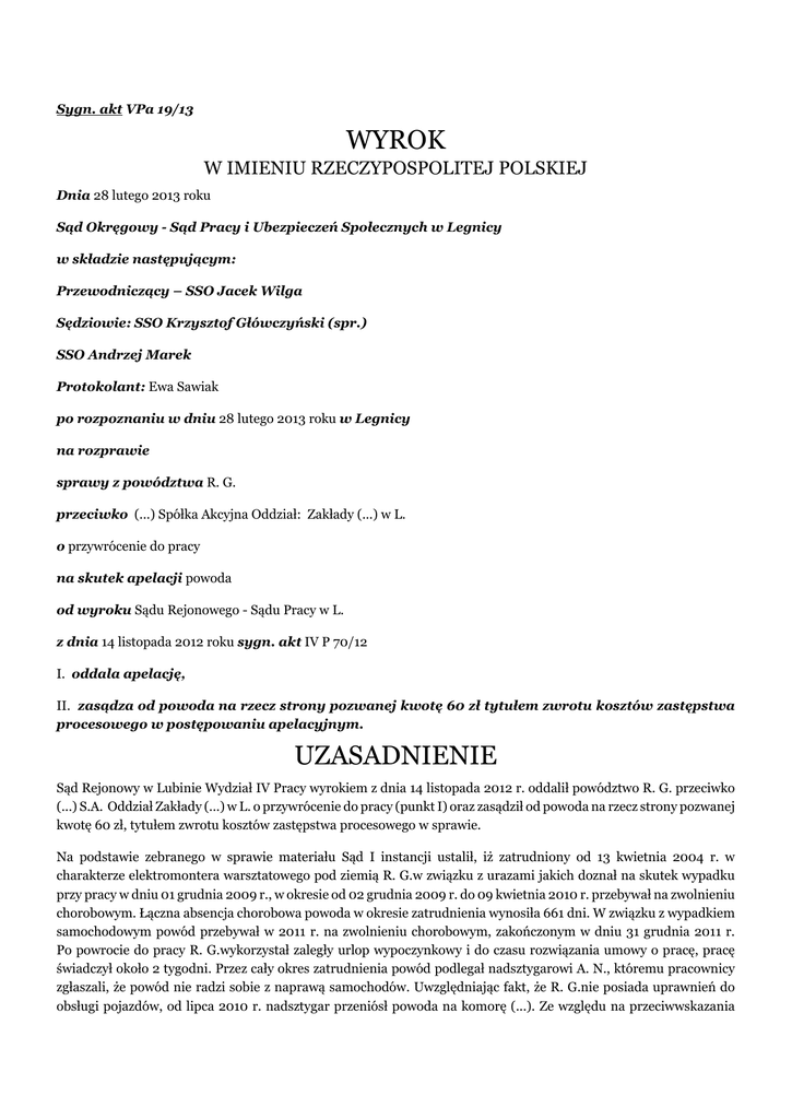 Sygn. akt VPa 19/13 WYROK W IMIENIU RZECZYPOSPOLITEJ POLSKIEJ Dnia 28 lutego 2013 roku Sąd Okręgowy - Sąd Pracy i Ubezpieczeń Społecznych w Legnicy w składzie następującym: Przewodniczący – SSO Jacek Wilga Sędziowie: SSO Krzysztof Główczyński (spr.) SSO Andrzej Marek Protokolant: Ewa Sawiak po rozpoznaniu w dniu 28 lutego 2013 roku w Legnicy na rozprawie sprawy z powództwa R. G. przeciwko (...) Spółka Akcyjna Oddział: Zakłady (...) w L. o przywrócenie do pracy na skutek apelacji powoda od wyroku Sądu Rejonowego - Sądu Pracy w L. z dnia 14 listopada 2012 roku sygn. akt IV P 70/12 I. oddala apelację, II. zasądza od powoda na rzecz strony pozwanej kwotę 60 zł tytułem zwrotu kosztów zastępstwa procesowego w postępowaniu apelacyjnym. UZASADNIENIE Sąd Rejonowy w Lubinie Wydział IV Pracy wyrokiem z dnia 14 listopada 2012 r. oddalił powództwo R. G. przeciwko (...) S.A. Oddział Zakłady (...) w L. o przywrócenie do pracy (punkt I) oraz zasądził od powoda na rzecz strony pozwanej kwotę 60 zł, tytułem zwrotu kosztów zastępstwa procesowego w sprawie. Na podstawie zebranego w sprawie materiału Sąd I instancji ustalił, iż zatrudniony od 13 kwietnia 2004 r. w charakterze elektromontera warsztatowego pod ziemią R. G.w związku z urazami jakich doznał na skutek wypadku przy pracy w dniu 01 grudnia 2009 r., w okresie od 02 grudnia 2009 r. do 09 kwietnia 2010 r. przebywał na zwolnieniu chorobowym. Łączna absencja chorobowa powoda w okresie zatrudnienia wynosiła 661 dni. W związku z wypadkiem samochodowym powód przebywał w 2011 r. na zwolnieniu chorobowym, zakończonym w dniu 31 grudnia 2011 r. Po powrocie do pracy R. G.wykorzystał zaległy urlop wypoczynkowy i do czasu rozwiązania umowy o pracę, pracę świadczył około 2 tygodni. Przez cały okres zatrudnienia powód podlegał nadsztygarowi A. N., któremu pracownicy zgłaszali, że powód nie radzi sobie z naprawą samochodów. Uwzględniając fakt, że R. G.nie posiada uprawnień do obsługi pojazdów, od lipca 2010 r. nadsztygar przeniósł powoda na komorę (...). Ze względu na przeciwwskazania zdrowotne, powód nie mógł wykonywać zadań operatora pojazdów transportowych pod ziemią. Wobec tego powód wykonywał prace gospodarcze na komorze. Od marca 2011 r. powód został przydzielony sztygarowi oddziałowemu do obsługi komory paliw. Z uwagi na przeciwwskazania zdrowotne powód nie mógł tego stanowiska w pełni obsługiwać. Od lipca 2011 r. R. G.przebywał na zwolnieniu chorobowym, a jego nieobecność w pracy spowodowała konieczność przeprowadzenia inwentaryzacji. Pismem z dnia 19 stycznia 2012 r. przełożony powoda wniósł o rozwiązanie z powodem umowy o pracę, uzasadniając ten wniosek niską jakością pracy R. G., niewykazywaniem zaangażowania, wyjątkową niedyspozycyjnością, dezorganizującą pracę oddziału oraz oceną, iż pracownik nie rokuje poprawy w podejściu do obowiązków pracowniczych. Pismem z dnia 13 lutego 2012 r. strona pozwana wypowiedziała powodowi umowę o pracę, ze względu na brak zainteresowania pracą, brak dyspozycyjności, wysoką, dezorganizującą pracę oddziału absencję chorobową, świadczącą o braku predyspozycji zdrowotnych do pracy w warunkach dołowych. W 2010 r. powód nie przepracował ani jednego dnia wolnego od pracy (nadgodziny), zaś w 2011 r. przepracował 2 dni, a w 2012 r. – 3 dni. Powód ma przeciwwskazania do pracy na stanowisku operatora (...), operatora urządzeń dźwignicowych oraz pracy na wysokości powyżej 3 m. Od momentu zjazdu pod ziemię do wyjazdu szybem wszyscy zjeżdżający pod ziemię mają obowiązek noszenia szelek odblaskowych. Powód ma stwierdzone zaświadczeniem lekarskim z dnia 27 października 2006 r. przeciwwskazanie do noszenia szelek odblaskowych. Uwzględniając ustalone w sprawie fakty Sąd I instancji uznał, że powództwo nie zasługuje na uwzględnienie. Sąd wskazał, że w świetle orzecznictwa Sądu Najwyższego wypowiedzenie umowy o pracę jest zwykłym sposobem rozwiązania stosunku pracy. W ocenie Sądu Pracy strona pozwana wykazała prawdziwość przyczyn wypowiedzenia. Poza spowodowaną wypadkiem absencją chorobową, liczba dni nieobecności powoda w pracy jest bardzo duża. Stąd racjonalnie brzmią argumenty przełożonego powoda, iż pracownikowi z taką absencją chorobową nie można powierzyć żadnego odpowiedzialnego zadania. Ze względu na fakt, że na zmianie jest tylko jeden elektromonter, w razie nieobecności takiego pracownika w pracy, konieczne jest organizowanie zastępstw. Duża absencja chorobowa powoda może świadczyć o braku jego predyspozycji do pracy pod ziemią. Zeznania przełożonych powoda, T. K. i A. N. wskazują, że powód nie radził sobie z naprawą maszyn. Z tego względu przydzielono go do obsługi pojazdów ale z uwagi na przeciwwskazania do wykonywania tej pracy, nie mógł jej wykonywać. W apelacji od powyższego wyroku, zaskarżonego w całości, R. G. zarzucił: 1. naruszenie art. 233 § 1 k.p.c. w związku z art. 328 § 2 k.p.c. poprzez dowolną, a nie swobodną ocenę materiału, sprzeczną z zasadami doświadczenia życiowego, polegającą na pominięciu: • zeznań świadków G. C., M. Z., M. K., T. L. oraz K. K., z których wynika, że zarzuty co do jakości pracy powoda nie są prawdziwe i stworzone na potrzeby niniejszego postępowania, • zeznań K. T., który zeznał, że gdyby nie złożenie przez powoda niniejszej sprawy na drogę postępowania sądowego, w przypadku pozytywnej opinii bezpośrednich przełożonych powoda, byłby on nadal zatrudniony, • okoliczności, czym spowodowana była długa absencja chorobowa powoda, 2. obrazę art. 45 § 1 k.p. w związku z art. 6 k.c. poprzez błędną wykładnię polegającą na przyjęciu, że przyczyna wskazana w wypowiedzeniu była zasadna i prawdziwa, mimo iż długa absencja była spowodowana wypadkiem przy pracy oraz rozstrojem zdrowia powstałym wskutek wypadku samoch