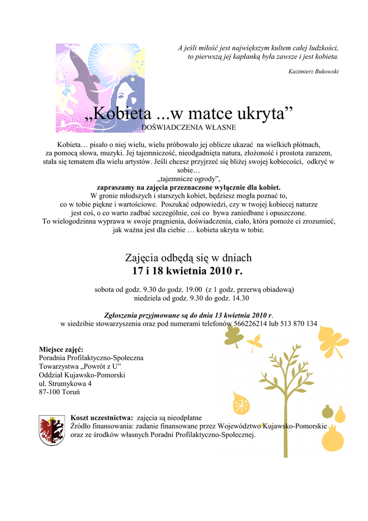 A jeśli miłość jest największym kultem całej ludzkości, to pierwszą jej kapłanką była zawsze i jest kobieta. Kazimierz Bukowski „Kobieta ...w matce ukryta” DOŚWIADCZENIA WŁASNE Kobieta… pisało o niej wielu, wielu próbowało jej oblicze ukazać na wielkich płótnach, za pomocą słowa, muzyki. Jej tajemniczość, nieodgadnięta natura, złoŜoność i prostota zarazem, stała się tematem dla wielu artystów. Jeśli chcesz przyjrzeć się bliŜej swojej kobiecości, odkryć w sobie… „tajemnicze ogrody”, zapraszamy na zajęcia przeznaczone wyłącznie dla kobiet. W gronie młodszych i starszych kobiet, będziesz mogła poznać to, co w tobie piękne i wartościowe. Poszukać odpowiedzi, czy w twojej kobiecej naturze jest coś, o co warto zadbać szczególnie, coś co bywa zaniedbane i opuszczone. To wielogodzinna wyprawa w swoje pragnienia, doświadczenia, ciało, która pomoŜe ci zrozumieć, jak waŜna jest dla ciebie … kobieta ukryta w tobie. Zajęcia odbędą się w dniach 17 i 18 kwietnia 2010 r. sobota od godz. 9.30 do godz. 19.00 (z 1 godz. przerwą obiadową) niedziela od godz. 9.30 do godz. 14.30 Zgłoszenia przyjmowane są do dnia 13 kwietnia 2010 r. w siedzibie stowarzyszenia oraz pod numerami telefonów 566226214 lub 513 870 134 Miejsce zajęć: Poradnia Profilaktyczno-Społeczna Towarzystwa „Powrót z U” Oddział Kujawsko-Pomorski ul. Strumykowa 4 87-100 Toruń Koszt uczestnictwa: zajęcia są nieodpłatne Źródło finansowania: zadanie finansowane przez Województwo Kujawsko-Pomorskie oraz ze środków własnych Poradni Profilaktyczno-Społecznej. Osoby prowadzące: mgr Agnieszka Słowik- realizator i autor programów profilaktycznych, pedagog, psychoterapeuta systemowy w trakcie procesu certyfikacji (Wielkopolskie Towarzystwo Terapii Systemowej), na co dzień prowadzi terapię indywidualną, rodzinną, par, prezes Toruńskiego Stowarzyszenia Terapeutów Systemowych. Obecnie praktyka terapeutyczna w Poradni Profilaktyczno-Społecznej Towarzystwa „Powrót z U”. mgr Dominika Łęcka – realizator i autor programów profilaktycznych, pedagog, socjolog w trakcie studiów doktoranckich na UMK, psychoterapeuta systemowy w trakcie procesu certyfikacji (Wielkopolskie Towarzystwo Terapii Systemowej), na co dzień prowadzi terapię indywidualną, rodzinną, par, członek Polskiej Federacji Psychoterapii oraz członek zarządu Toruńskiego Stowarzyszenia Terapeutów Systemowych. Obecnie praktyka terapeutyczna w Poradni Profilaktyczno-Społecznej Towarzystwa „Powrót z U”.