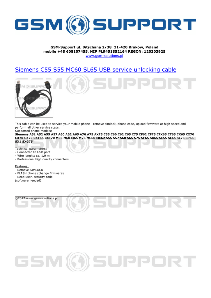 GSM-Support ul. Bitschana 2/38, 31-420 Kraków, Poland mobile +48 608107455, NIP PL9451852164 REGON: 120203925 www.gsm-solutions.pl Siemens C55 S55 MC60 SL65 USB service unlocking cable This cable can be used to service your mobile phone - remove simlock, phone code, upload firmware at high speed and perform all other service steps. Supported phone models: Siemens A51 A52 A55 A57 A60 A62 A65 A70 A75 AX75 C55 C60 C62 C65 C75 CF62 CF75 CFX65 CT65 CX65 CX70 CX70 CX75 CXT65 CXT70 M55 M60 M65 M75 MC60 MC62 S55 S57 S60 S65 S75 SF65 SK65 SL55 SL65 SL75 SP65 SX1 SXG75 Technical parameters: - Connected to USB port - Wire lenght: ca. 1.0 m - Professional high quality connectors Features: - Remove SIMLOCK - FLASH phone (change firmware) - Read user, security code (software needed) ©2012 www.gsm-solutions.pl Powered by TCPDF (www.tcpdf.org)