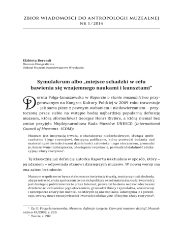ZBIÓR WI ADOMOŚCI DO A NTROPOLOGII MUZE ALNEJ Nr 1 / 2 014 Elżbieta Berendt Muzeum Etnograficzne Oddział Muzeum Narodowego we Wrocławiu Symulakrum albo „miejsce schadzki w celu bawienia się wzajemnego naukami i kunsztami” D orota Folga-Januszewska w Raporcie o stanie muzealnictwa przygotowanym na Kongres Kultury Polskiej w 2009 roku trawestuje – jak sama pisze z pewnym wahaniem i niedowierzaniem – przytoczoną przez siebie na wstępie bodaj najbardziej popularną definicję muzeum, którą sformułował Georges Henri Rivière, a którą niemal bez zmian przyjęła Międzynarodowa Rada Muzeów UNESCO (International Council of Museums –ICOM): Muzeum jest instytucją trwałą, o charakterze niedochodowym, służącą społeczeństwu i jego rozwojowi, dostępną publicznie, która prowadzi badania nad materialnymi świadectwami działalności człowieka i jego otoczeniem, gromadzi je, konserwuje i zabezpiecza, udostępnia i wystawia, prowadzi działalność edukacyjną i służy rozrywce1. Tę klasyczną już definicję autorka Raportu uaktualnia w sposób, który – jej zdaniem – odpowiada stanowi dzisiejszych muzeów. W nowej wersji ma ona zatem brzmienie: Muzeum współczesne bywa stale jeszcze instytucją trwałą, musi przynosić dochody, aby przetrwać, służy społeczeństwom i ich polityce określania tożsamości i wartości, jest dostępne publicznie także przez Internet, prowadzi badania nad świadectwami działalności człowieka i jego otoczeniem, gromadzi zbiory i symulakra, konserwuje i zabezpiecza zbiory lub nośniki, na których są one zapisane, udostępnia je i prezentuje, tworzy nowe rzeczywistości i wartości edukacyjne i fikcyjne, służy rozrywce2. Za: D. Folga-Januszewska, Muzeum: definicje i pojęcie. Czym jest muzeum dzisiaj?, Muzealnictwo 49/2008, s. 200. 2 Tamże, s. 202. 1 32 Elżbieta Berendt Tak skonstruowana definicja poszerza pewne niezbywalne muzealne funkcje i wyznaczniki – uwzględniając potrzeby wynikające wprost z poszerzenia przestrzeni, w której istnieją nie tylko muzea, ale wszystkie społeczne instytucje i zjawiska. Inne – jak samą trwałość – relatywizuje, związując je z nie wskazanymi wprost zagrożeniami. Wprowadza też, ważne zwłaszcza dla obywateli epoki wielokulturowości, zagadnienia tożsamości i wartości. Kojarzy je z polityką społeczną, tworząc jednak kontekst niebezpieczny dla rzetelności naukowego, a w konsekwencji także edukacyjnego wywodu. Wreszcie najbardziej podstawowym i niestety realnym czynnikiem zachwiania łączonych z muzeami pojęć trwałości i dążenia do obiektywizmu jest „dopisana” im w tej definicji służebność ekonomiczna, czyli zmuszanie ich do prowadzenia działalności zarobkowej, jako warunku przetrwania. Raport diagnozuje procesy społeczne i kulturowe skutkujące zmianą zadań muzeum, a ją samą odczytuje jako odpowiedź na oczekiwania oraz przyzwyczajenia publiczności i sponsorów, zapewne także decydentów. Jednak w zestawieniu z przeprowadzoną przez autorkę Raportu analizą polskich realiów i tendencji w muzealnictwie europejskim, jawi się on raczej jako postulat takich przekształceń struktur muzeów, schematów ich zarządzania, a nawet samej misji, aby tym oczekiwaniom sprostać, niż przestroga przed bezrefleksyjnym uleganiem presji. Uaktualnia definicje zamiast zauważyć niebezpieczeństwo, jakim są nieustanne przesunięcia granic muzealnych zadań, zdążające jak się wydaje w stronę absurdu. W nowej rzeczywistości wciąż funkcjonują liczne muzea – niezmiennie, a może powinno się powiedzieć: staroświecko wierne idei wszechstronnych zobowiązań wobec zabytku, konieczności jego zabezpieczenia, konserwacji, opracowania, a następnie publicznego udostępnienia za pomocą ekspozycji i edukacji. Muszą one borykać się nie tylko z permanentnym niedofinansowaniem, ale także z mnożącymi się pomysłami na ich zreformowanie, które rzadko tylko znajdują umocowanie w znajomości muzealnictwa i rzeczywistej trosce o dobro kultury. Kolejnym nieoczekiwanym problemem, z którym muszą się zmierzyć, jest także konkurencja różnych form działalności instytucjonalnej, które chociaż nie mają nawet charakteru paramuzealnego – stawiane są z nimi w jednym szeregu. Założenia tych współczesnych „teatrów zdarzeń” (często realizujących politykę definiowania wartości przez określone grupy społeczne lub polityczne) bywają szczytne, a efekty ich działań, wspartych odpowiednim dofinansowaniem, Polskie muzeum etnograficzne w XXI wieku 33 zadowalają najbardziej wybrednych odbiorców. Jednak zrównywanie tych instytucji z muzeami wprowadza zamęt w obrębie i tak niezbyt precyzyjnych klasyfikacji różnych przejawów życia kulturalnego. Bowiem najczęściej przejmują tylko wybrane zadania muzealne – pozostałe lekceważąc, jako nieprzynoszące szybkich zysków w postaci zauważenia i wymiernego nagrodzenia ich edukacyjno-rozrywkowej atrakcyjności. Należy dostrzegać tę atrakcyjność, lecz to właśnie dla tych zjawisk i instytucji, zakresu i charakteru ich działań należy ukuć nowe definicje i związać z nimi nowe, niemuzealne nazewnictwo. Precyzyjnemu określaniu specyfiki muzeum nie sprzyjają też mające charakter masowy akcje, jakimi są Noce Muzeów. Włączają się do nich bowiem oprócz muzeów galerie artystyczne, pracownie plastyczne, archiwa i biblioteki, coraz częściej nawet regionalne oddziały Instytutu Pamięci Narodowej. Współpraca wszystkich tych podmiotów jest pożądana, jednak w sytuacji, gdy wspólnie tworzą one sieć powołaną do organizacji nocnych spotkań muzealnych, skutkuje ona jedynie utrwaleniem u przeciętnego odbiorcy pojęciowego chaosu. Utrudniający właściwą orientację mrok nocy wydaje się zacierać także precyzję identyfikacji podstawowych różnic zawartych tak w programowych założeniach, jak i w praktycznym działaniu tych podmiotów. Wszak niepodważanie p