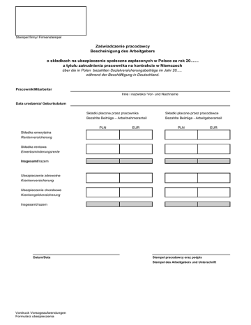 Stempel firmy/ Firmenstempel Zaświadczenie pracodawcy Bescheinigung des Arbeitgebers o składkach na ubezpieczenie społeczne zapłaconych w Polsce za rok 20....... z tytułu zatrudnienia pracownika na kontrakcie w Niemczech über die in Polen bezahlten Sozialversicherungsbeiträge im Jahr 20..... während der Beschäftigung in Deutschland. Pracownik/Mitarbeiter Imie i nazwisko/ Vor- und Nachname Data urodzenia/ Geburtsdatum Składki płacone przez pracownika Składki płacone przez pracodawce Bezahlte Beiträge – Arbeitnehmeranteil Bezahlte Beiträge - Arbeitgeberanteil PLN EUR PLN EUR Składka emerytalna Rentenversicherung Składka rentowa Erwerbsminderungsrente Insgesamt/razem Ubezpieczenie zdrowotne Krankenversicherung Ubezpieczenie chorobowe Krankengeldversicherung Insgesamt/razem Datum/Data Stempel pracodawcy oraz podpis Stempel des Arbeitgebers und Unterschrift Vordruck Vorsogeaufwendungen Formularz ubezpieczenia