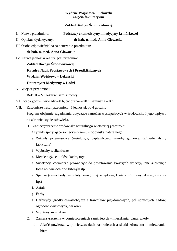 Wydział Wojskowo – Lekarski Zajęcia fakultatywne Zakład Biologii Środowiskowej I. Nazwa przedmiotu: Podstawy ekomedycyny i medycyny komórkowej II. Opiekun dydaktyczny: dr hab. n. med. Anna Głowacka III. Osoba odpowiedzialna za nauczanie przedmiotu: dr hab. n. med. Anna Głowacka IV. Nazwa jednostki realizującej przedmiot Zakład Biologii Środowiskowej Katedra Nauk Podstawowych i Przedklinicznych Wydział Wojskowo – Lekarski Uniwersytet Medyczny w Łodzi V. Miejsce przedmiotu: Rok III – VI, lekarski sem. zimowy VI. Liczba godzin: wykłady – 0 h, ćwiczenie – 20 h, seminaria – 0 h VII. Zasadnicze treści przedmiotu: 5 jednostek po 4 godziny Program obejmuje zagadnienia dotyczące zagrożeń występujących w środowisku i jego wpływu na zdrowie i życie człowieka. 1. Zanieczyszczenie środowiska naturalnego w otwartej przestrzeni Czynniki sprzyjające zanieczyszczeniu środowiska naturalnego a. Zakłady przemysłowe (metalurgia, papiernictwo, wyroby gumowe, rafinerie, dymy fabryczne) b. Wybuchy wulkaniczne c. Metale ciężkie – ołów, kadm, rtęć d. Substancje chemiczne prowadzące do powstawania kwaśnych deszczy, inne substancje lotne np. wielochlorki bifenylu itp. e. Spaliny (samochody, samoloty, smog, olej napędowy, kosiarki do trawy, skutery śnieżne itp.) f. Asfalt g. Farby h. Herbicydy (środki chwastobójcze z trawników przydomowych, pól uprawnych, sadów, ogrodów kwiatowych, parków) i. Wyziewy ze ścieków 2. Zanieczyszczenia w pomieszczeniach zamkniętych – mieszkania, biura, szkoły a. Jakość powietrza w pomieszczeniach zamkniętych a skutki zdrowotne – mieszkania, biura b. Jakość powietrza w szkołach – zła lokalizacja, niewłaściwa konserwacja i utrzymanie budynku, pracownie chemiczne, plastyczne i zajęć technicznych, sale gimnastyczne, sale komputerowe, itp. c. Źródła zanieczyszczeń powietrza emitujące cząsteczki stałe (np. kominki, piece węglowe, palenie papierosów itp.) d. Lotne i półlotne substancje chemiczne (np. rozpuszczalniki, płyny do czyszczenia mebli, formaldehyd itp.) e. Czynniki zakaźne i alergizujące (np. roztocze, bakterie, wirusy, karaluchy, grzyby, pyłki) 3. Czynniki sprzyjające powstawaniu „zespołu chorego budynku” a. Systemy wentylacyjne b. Wadliwe projekty architektoniczne c. Złe usytuowanie budynków d. Dywany, wykładziny, tapety e. Środki czystości f. Insektycydy g. Komputery h. Rośliny doniczkowe i. Materiały biurowe 4. Medycyna komórkowa. a. Czym jest medycyna komórkowa b. Co to są komórkowe składniki odżywcze c. Czy komórkowe składniki odżywcze są lekarstwem. d. Czym jest synergia składników odżywczych i jakie ma znaczenie dla zdrowia? e. Zagrożenia dla zdrowia występujące w codziennej diecie − Żywność modyfikowana genetycznie, funkcjonalna − Ukryte i alergizujące składniki pokarmów − Dodatki do żywności (symbole na opakowaniach i etykietkach artykułów ) − Zawartość pestycydów w żywności f. 5. Żywność ekologiczna, organiczna, tradycyjna kontra żywność wysokoprzetworzona Profilaktyka chorób środowiskowych a. Bezpieczny dom dla alergika b. Szczególne zasady postępowania. Indywidualna zmiana stylu życia c. Stosowanie bezpiecznych dla człowieka i przyjaznych dla środowiska produktów d. Organizowanie bezpiecznego i zdrowego otoczenia e. Eliminowanie stresorów chemicznych, fizycznych, biologicznych i psychologicznych VIII. Celem nauczania przedmiotu będzie poznanie i zrozumienie środowiskowych aspektów zdrowia i choroby wg czterech głównych zasad medycyny ekologicznej. Należą do nich: • Całkowite obciążenie organizmu wynikające z przebywania w zanieczyszczonym środowisku • Zjawisko maskowania (adaptacja, tolerancja, uzależnienie) • Dwufazowość – reakcje nietrwałe, reakcje utrwalone • Zróżnicowanie biochemiczne - podstawa indywidualnej podatności na działanie różnych czynników środowiska • Zapoznanie studentów z podstawowymi zasadami profilaktyki chorób środowiskowych • Nabycie umiejętność postrzegania pacjenta i jego choroby z perspektywy środowiska przyszły lekarz widzi pacjenta na tle jego mieszkania, miejsca pracy, szkoły, spożywanej żywności i życiowych problemów • Kształtowanie postaw i zachowań prozdrowotnych i proekologicznych wśród przyszłych lekarzy • Zapoznanie z naturalnymi komórkowymi składnikami odżywczymi koniecznymi dla zachowania zdrowia; rola mikroelementów i zagrożeń związanych z ich niedoborem; synergia komórkowych składników odżywczych przy zakłóceniach układu krążenia, przemian tłuszczowych i , przemian węglowodanów i zwyrodnieniach komórek; IX. Wyniki nauczania przedmiotu W wyniku realizacji treści nauczania w zakresie wiedzy student: • Zna źródła i czynniki sprzyjające zanieczyszczeniu środowiska naturalnego • Zna wpływ zanieczyszczeń środowiska na życie i zdrowie człowieka • Zna konsekwencje wynikające ze stosowanego samoleczenia dla zdrowia człowieka i środowiska • Zna ukryte i alergizujące składniki pokarmów • Zna wartość zdrowej żywności W zakresie umiejętności student: • Umie przeprowadzić wywiad zgodnie z zasadami medycyny ekologicznej na temat choroby środowiskowej (będzie doszukiwał się czynników środowiskowe, które mogą być przyczyną zmian chorobowych • Będzie jako „doktor” (docere – łac. uczyć) pacjenta jak zachować zdrowie i jak unikać czynników chorobotwórczych występujących w środowisku, jak walczyć o zdrowe otoczenie • Umie zorganizować bezpieczne, zdrowe otoczenie (sypialnia, łazienka, pralnia, garaż, kuchnia) • Umie rozróżnić symptomy i choroby związane ze złą jakością powietrza w pomieszczeniach mieszkalnych • Umie wybrać alternatywne produkty higieny osobistej i alternatywne środki czystości do użytku domowego • Umie samodzielnie sporządzić naturalne środki do czyszczenia mebli, pielęgnacji skóry i włosów oraz do odstras