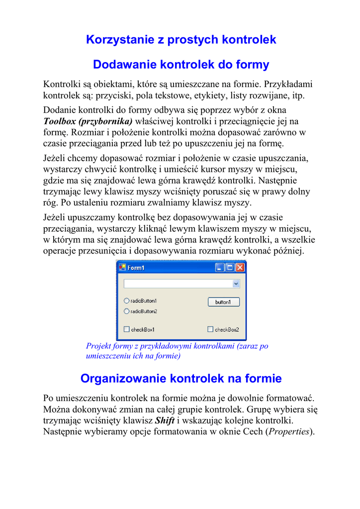 Korzystanie z prostych kontrolek Dodawanie kontrolek do formy Kontrolki są obiektami, które są umieszczane na formie. Przykładami kontrolek są: przyciski, pola tekstowe, etykiety, listy rozwijane, itp. Dodanie kontrolki do formy odbywa się poprzez wybór z okna Toolbox (przybornika) właściwej kontrolki i przeciągnięcie jej na formę. Rozmiar i położenie kontrolki można dopasować zarówno w czasie przeciągania przed lub też po upuszczeniu jej na formę. Jeżeli chcemy dopasować rozmiar i położenie w czasie upuszczania, wystarczy chwycić kontrolkę i umieścić kursor myszy w miejscu, gdzie ma się znajdować lewa górna krawędź kontrolki. Następnie trzymając lewy klawisz myszy wciśnięty poruszać się w prawy dolny róg. Po ustaleniu rozmiaru zwalniamy klawisz myszy. Jeżeli upuszczamy kontrolkę bez dopasowywania jej w czasie przeciągania, wystarczy kliknąć lewym klawiszem myszy w miejscu, w którym ma się znajdować lewa górna krawędź kontrolki, a wszelkie operacje przesunięcia i dopasowywania rozmiaru wykonać później. Projekt formy z przykładowymi kontrolkami (zaraz po umieszczeniu ich na formie) Organizowanie kontrolek na formie Po umieszczeniu kontrolek na formie można je dowolnie formatować. Można dokonywać zmian na całej grupie kontrolek. Grupę wybiera się trzymając wciśnięty klawisz Shift i wskazując kolejne kontrolki. Następnie wybieramy opcje formatowania w oknie Cech (Properties). Rodzaje kontrolek Podstawowe: Button standardowy przycisk Przycisk RadioButton pozwala na wybór opcji ComboBox rozwijana lista pozycji lista zwijana PictureBox umożliwia wstawianie na formę grafiki służy do umieszczania tekstu na formie. Etykieta Label LinkLabel pozwala na tworzenie linków. ListBox nierozwijana lista pozycji ListView lista pozycji z ikonami. TextBox służy do wprowadzania tekstu do programu Podaj wartość . CheckBox pozwala na włącznia/wyłącznie różnych opcji pole wyboru Właściwości Poniższe zestawienie zawiera najczęściej używane właściwości kontrolek (dostępnych z okna Properties): Właściwość Name AutoSize BackColor Cursor Opis Nazwa obiektu utworzonej kontrolki, którego będziemy używać w kodzie programu. Określa, czy kontrolka będzie automatycznie dopasowywana do kontekstu (np.: im dłuższy tekst tym większy rozmiar kontrolki). Określa kolor tła danej kontrolki. Określa rodzaj kursora myszy, jaki pojawi się, gdy znajdzie się on w obszarze kontrolki. Dock Określa rodzaj zakotwiczenia kontrolki (np.: wypełnienie całego wnętrza). Enabled Określa, czy kontrolka jest dostępna (aktywna). Font Określa czcionkę i jej cechy używaną przez kontrolkę Określa kolor tekstu i grafiki używany przez kontrolkę. ForeColor Location Określa położenie lewej i górnej krawędzi kontrolki. MaximumSize Size Text Określa maksymalny rozmiar kontrolki. Określa rozmiar kontrolki w pikselach. Określa tekst jaki zawiera kontrolka (np.: etykieta, przycisk). Visible Określa, czy kontrolka jest widoczna po wyświetleniu formy. Metody Poniższe zestawienie zawiera najczęściej używane metody dla kontrolek: Metoda Focus Hide Opis Sprawia, że kontrolka uzyskuje fokus (jest wyróżnioną jako jedyna na formie) Ukrywa kontrolkę. Refresh Wymusza odświeżenie kontrolki i wszystkich innych kontrolek, dla których dana kontrolka jest macierzysta. Show Pokazuje kontrolkę. Update Wymusza odświeżenie obszaru kontrolki.