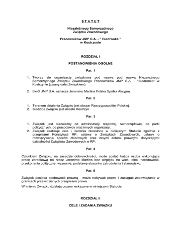 STATUT Niezależnego Samorządnego Związku Zawodowego Pracowników JMP S.A. - " Biedronka " w Kostrzynie ROZDZIAŁ I POSTANOWIENIA OGÓLNE Par. 1 1. Tworzy się organizację związkową pod nazwą pod nazwą Niezależnego Samorządnego Związku Zawodowego Pracowników JMP S.A. - "Biedronka" w Kostrzynie (zwany dalej Związkiem). 2. Skrót JMP S.A. oznacza Jeronimo Martins Polska Spółka Akcyjna. Par. 2 1. Terenem działania Związku jest obszar Rzeczypospolitej Polskiej. 2. Siedzibą związku jest miasto Kostrzyn Par. 3 1. Związek jest niezależny od administracji rządowej, samorządowej, od partii politycznych, od pracodawcy oraz innych organizacji. 2. Związek realizuje cele i zadania określone w niniejszym Statucie zgodnie z przepisami Konstytucji RP, ustawy o Związkach Zawodowych, ustawy o rozwiązywaniu sporów zbiorowych oraz innymi aktami prawnymi dotyczącymi działalności Związków Zawodowych w RP. Par. 4 Członkiem Związku, na zasadzie dobrowolności, może zostać każda osoba wykonująca pracę zarobkową na rzecz Jeronimo Martins bez względu na wiek, płeć, narodowość, przekonania polityczne, wyznanie, podstawę stosunku zatrudnienia i stanowisko. Par. 5 Związek posiada osobowość prawną - może nabywać prawa i zaciągać zobowiązanie w granicach przewidzianych przepisami prawa. W imieniu Związku działają organy wskazane w niniejszym Statucie. ROZDZIAŁ II CELE I ZADANIA ZWIĄZKU Par. 6 Celem Związku jest obrona praw, godności i interesów pracowników w tym: 1. Obrona praw pracowniczych w zakresie wykonywanej pracy zawodowej, wynagrodzenia, 2. Ochrona warunków socjalno - bytowych oraz bezpieczeństwo i higiena pracy 3. Harmonizowanie prawidłowego działania zakładu pracy z interesami pracowników, 4. Kształtowanie etyki zawodowej i sumiennego stosunku do obowiązków pracowniczych, 5. Obrona interesów zawodowych, materialnych, socjalnych i kulturalnych pracowników oraz ich rodzin Par. 7 Do zakresu działania Związku należy realizacja zadań statutowych w szczególności: 1. Reprezentowanie interesów swoich członków wobec kierownictwa JMP SA, organów administracji państwowej i gospodarczej, organizacji społecznych, samorządowych i politycznych. 2. Kontrola nad przestrzeganiem przepisów prawa pracy, udzielanie pomocy prawnej oraz podejmowanie interwencji i mediacji w przypadku indywidualnych spraw wynikających ze stosunku pracy. 3. Zajmowanie stanowiska w indywidualnych sprawach pracowniczych w zakresie unormowanych w przepisach prawa pracy. 4. Zapewnienie członkom i ich rodzinom możliwości korzystania z odpowiedniego udziału w podziale Zakładowego Funduszu Świadczeń Socjalnych. 5. Partnerskie współdziałanie z kierownictwem zakładu pracy w rozwijaniu działalności kulturalno - oświatowej i tworzeniu warunków do odpoczynku po pracy, jak również podejmowaniu inicjatyw w tym zakresie. 6. Współuczestnictwo w działaniach dla poprawy opieki lekarskiej i ochrony zdrowia pracowników i ich rodzin. Par. 8 Do osiągnięcia powyższych celów i zadań Związek dąży przez : 1. Partnerskie współdziałanie z kierownictwem zakładu pracy oraz innymi związkami zawodowymi działającymi w JMP SA. 2. Udział w opracowywaniu założeń lub projektów wewnętrznych aktów prawnych oraz decyzji dotyczących praw i interesów pracowniczych, a także opiniowanie przyjętych opracowań. 3. Rozwiązywanie powstałych sporów w drodze negocjacji oraz przez zawieranie porozumień. 4. Prowadzenie działalności gospodarczej dla uzyskania środków przeznaczonych na realizację zadań statutowych. Par. 9 W razie sporu zbiorowego Związkowi przysługuje prawo do podjęcia stosownej formy protestu z zachowaniem przepisów ustawy o związkach zawodowych. Par. 10 W szczególnych przypadkach Związek może podjąć się obrony indywidualnych praw pracownika niezrzeszonego w Związku, jeżeli pracownik zwróci się z pisemnym wnioskiem o taką pomoc. ROZDZIAŁ III CZŁONKOWIE ZWIĄZKU ICH PRAWA I OBOWIĄZKI Par. 11 1. Członkostwo Związku nabywa się z dniem zatwierdzenia członkostwa w Związku przez Zarząd Związku. Zarząd zatwierdza członkostwo w związku na podstawie złożonej przez kandydata na członka Związku pisemnej deklaracji członkostwa. 2. Dowodem przynależności do Związku jest ważna legitymacja związkowa wydana przez Zarząd Związku. Par. 12 Członkostwo Związku ustaje w wyniku: 1. Dobrowolnego wystąpienia, 2. Skreślenia z listy członków na wskutek: nie opłacania składek przez okres 3 miesięcy, 3. Wykluczenia ze Związku. Wykluczenie dokonuje się na mocy uchwały Zarządu Związku podjętej większością 2/3 głosów. Przyczyną wykluczenia ze Związku może być rażące naruszenie przez Członka Związku obowiązków wynikających z niniejszego statutu albo działania na szkodę Związku. Uchwała o wykluczeniu podejmowana jest na wniosek Członka Zarządu Związku 4. Zgonu Par. 13 Członek Związku ma prawo: 1. Uczestniczyć w ogólnych zebraniach Związku, 2. Wybierać i odwoływać członków władz Związku oraz być wybieranym do tych organów z zastrzeżeniem, że bierne prawo wyborcze posiadają członkowie legitymujący się co najmniej 2 letnim nieprzerwanym stażem członkowskim 3. Korzystać z porad i pomocy prawnej Związku w ochronie swoich praw i interesów pracowniczych, 4. Korzystać z pomocy socjalnej i materialnej Związku, 5. Oceniać i poddawać krytyce działalność każdego członka Związku i organów Związku, wnioskować o zmianę organów lub odwołanie członków tych organów z pełnionych funkcji. 6. Być na bieżąco informowanym o wszelkich decyzjach i innych działaniach władz Związku, 7. Brać udział w zebraniach, podczas których władze Związku podejmują uchwały dotyczące jego osoby, 8. Występować z wnioskami i postulatami do władz Związku, 9. Brać udział w formach protestu organizowanych przez Związek. Par. 14 Członek Związku obowiązany jest: 1. Brać udzia