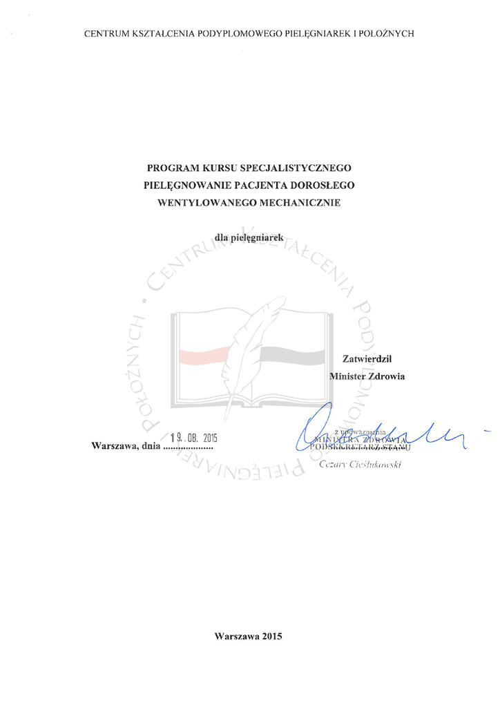 CENTRUM KSZTAŁCENIA PODYPLOMOWEGO PIELĘGNIAREK I POŁOŻNYCH PROGRAM PRZYGOTOWANY PRZEZ ZESPÓŁ PROGRAMOWY W SKŁADZIE 1 1. dr n. med. Aleksandra Gutysz-Wojnicka – Przewodnicząca Zespołu; Katedra Pielęgniarstwa Wydział Nauk Medycznych Uniwersytet Warmińsko-Mazurski w Olsztynie 2. dr n. med. Małgorzata Knap – Oddział Anestezjologii i Intensywnej Terapii, Wojewódzki Szpital Specjalistyczny im. św. Rafała w Czerwonej Górze; Zakład Medycyny Ratunkowej Wydział Nauk o Zdrowiu, Uniwersytet Jana Kochanowskiego w Kielcach 3. dr n. med. Iwona Trojanowska – Oddział Kliniczny Anestezjologii, Intensywnej Terapii i Leczenia Bólu, Szpital Kliniczny im. H. Święcickiego UM im. K. Marcinkowskiego w Poznaniu RECENZENT PROGRAMU dr hab. n. med. Danuta Dyk – Konsultant Krajowy w dziedzinie pielęgniarstwa anestezjologicznego i intensywnej opieki, Zakład Pielęgniarstwa Anestezjologicznego i Intensywnej Opieki, Uniwersytet Medyczny im. K. Marcinkowskiego w Poznaniu 1 Powołany Zarządzeniem Dyrektora Centrum Kształcenia Podyplomowego Pielęgniarek i Położnych Nr 51A/14 z dnia 9 lipca 2014 r. w sprawie powołania Zespołu do spraw Opracowania Programu Kształcenia Podyplomowego Pielęgniarek i Położnych. str. 2 CENTRUM KSZTAŁCENIA PODYPLOMOWEGO PIELĘGNIAREK I POŁOŻNYCH 1. ZAŁOŻENIA ORGANIZACYJNO-PROGRAMOWE Rodzaj kształcenia Kurs specjalistyczny jest to rodzaj kształcenia, który zgodnie z ustawą z dnia 15 lipca 2011 r. o zawodach pielęgniarki i położnej (Dz. U. z 2014 r., poz. 1435, z późn. zm.) ma na celu uzyskanie przez pielęgniarkę lub położną wiedzy i umiejętności do wykonywania określonych czynności zawodowych przy udzielaniu świadczeń pielęgnacyjnych, zapobiegawczych, diagnostycznych, leczniczych lub rehabilitacyjnych. Efekty kształcenia wskazane w programie kursu specjalistycznego Pielęgnowanie pacjenta dorosłego wentylowanego mechanicznie, dla pielęgniarek są dla organizatora i uczestnika kształcenia obowiązkowym elementem programu. Osiągnięcie wskazanych efektów kształcenia gwarantuje, że każdy uczestnik kursu specjalistycznego będzie posiadać takie same kwalifikacje, niezależnie od miejsca ukończenia kształcenia, podmiotu organizującego kształcenie oraz systemu kształcenia. Cel kształcenia Przygotowanie pielęgniarki do samodzielnego udzielania świadczeń zdrowotnych w zakresie pielęgnowania pacjenta dorosłego wentylowanego mechanicznie w warunkach stacjonarnej opieki zdrowotnej i w warunkach domowych. Czas trwania kształcenia Łączna liczba godzin przeznaczonych na realizację programu kursu specjalistycznego w kontakcie z wykładowcą/opiekunem stażu wynosi 105 godzin dydaktycznych: zajęcia teoretyczne – 56 godzin, zajęcia praktyczne – 49 godzin. Organizator kształcenia w porozumieniu z kierownikiem, ma prawo dokonać modyfikacji czasu trwania zajęć w wymiarze nie większym niż 10%. Oznacza to, że 90% czasu przeznaczonego na realizację poszczególnych modułów nie podlega zmianie. Wskazane 10%, co stanowi nie więcej niż 10 godzin, może być wykorzystane na samokształcenie. Sposób organizacji Za przebieg i organizację kursu specjalistycznego odpowiedzialny jest organizator kształcenia. Planując realizację kształcenia, organizator powinien: 1. Opracować regulamin organizacyjny kursu specjalistycznego, który w szczególności określa: organizację; zasady i sposób naboru osób; prawa i obowiązki osób uczestniczących; zakres obowiązków kadry dydaktycznej prowadzącej nauczanie teoretyczne i praktyczne; zasady przeprowadzenia egzaminu końcowego. 2. Powołać kierownika kursu specjalistycznego. Do zadań kierownika kursu oprócz zadań określonych w przepisach Ministra Zdrowia z tego zakresu powinno należeć: współdecydowanie o doborze kadry dydaktycznej; przedstawienie uczestnikom kursu: celu, programu i organizacji kształcenia; ocenianie placówek szkolenia praktycznego wg specyfiki i organizacji zajęć; pomaganie w rozwiązywaniu problemów; udzielanie indywidualnych konsultacji uczestnikom kursu; zbieranie i analizowanie opinii o przebiegu kursu. 3. Przeprowadzić postępowanie kwalifikacyjne. 4. Powołać wykładowców posiadających kwalifikacje określone w programie kursu. str. 3 CENTRUM KSZTAŁCENIA PODYPLOMOWEGO PIELĘGNIAREK I POŁOŻNYCH 5. Powołać w uzgodnieniu z kierownikiem kursu opiekunów szkolenia praktycznego, którzy powinni być merytorycznymi pracownikami placówek, w których odbywa się szkolenie praktyczne. Do zadań opiekuna szkolenia praktycznego należy: instruktaż wstępny (zapoznanie z celem szkolenia praktycznego z organizacją pracy, wyposażeniem placówki, jej personelem, zakresem udzielanych świadczeń i in.); instruktaż bieżący (organizacja i prowadzenie zajęć, kontrola nad ich prawidłowym przebiegiem, pomoc w rozwiązywaniu problemów i in.); instruktaż końcowy (omówienie i podsumowanie zajęć, zaliczenie świadczeń zdrowotnych określonych w programie kształcenia, ocena uzyskanych wiadomości i umiejętności). 6. Zapewnić bazę dydaktyczną do szkolenia teoretycznego, dostosowaną do liczby uczestników kursu. 7. Zapewnić środki dydaktyczne, o których mowa w programie poszczególnych modułów. 8. Dobrać placówki stażowe zgodnie z planem nauczania, w których możliwe będzie zdobywanie umiejętności niezbędnych do wykonywania określonych świadczeń zdrowotnych. 9. Posiadać wewnętrzny system monitorowania jakości kształcenia. Sposób sprawdzania efektów kształcenia W toku realizacji programu przewiduje się ocenianie: 1. Bieżące – rozumiane jako zaliczanie poszczególnych modułów (sprawdzenie stopnia opanowania wiedzy i umiejętności będących przedmiotem nauczania teoretycznego i praktycznego, w tym świadczeń zdrowotnych przewidzianych w programie kształcenia). 2. Końcowe – zgodnie z ustawą z dnia 15 lipca 2011 r. o zawodach pielęgniarki i położnej (Dz. U. z 2014 r., poz. 1435, z późn. zm