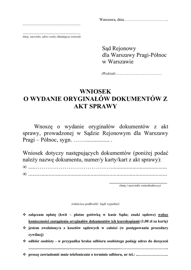 Warszawa, dnia…………………………….. ............................................................ ............................................................ (imię, nazwisko, adres osoby składającej wniosek) Sąd Rejonowy dla Warszawy Pragi-Północ w Warszawie (Wydział):…………………………………….. WNIOSEK O WYDANIE ORYGINAŁÓW DOKUMENTÓW Z AKT SPRAWY Wnoszę o wydanie oryginałów dokumentów z akt sprawy, prowadzonej w Sądzie Rejonowym dla Warszawy Pragi – Północ, sygn. ……................. . Wniosek dotyczy następujących dokumentów (poniŜej podać naleŜy nazwę dokumentu, numer/y karty/kart z akt sprawy): • .....…………………………………....................................... • ................................................................................................ ____________________ (imię i nazwisko wnioskodawcy) (właściwe podkreślić bądź wypełnić) załączam opłatę (kwit – płatne gotówką w kasie Sądu; znaki sądowe) wobec konieczności zastąpienia oryginałów dokumentów ich kserokopiami (1,00 zł za kartę) jestem zwolniony/a z kosztów sądowych w całości (w postępowaniu procedury cywilnej) odbiór osobisty - w przypadku braku odbioru osobistego podaję adres do doręczeń ...............................................................................................……………………………….. proszę zawiadomić mnie telefonicznie o terminie odbioru, nr tel.: ...…………………..