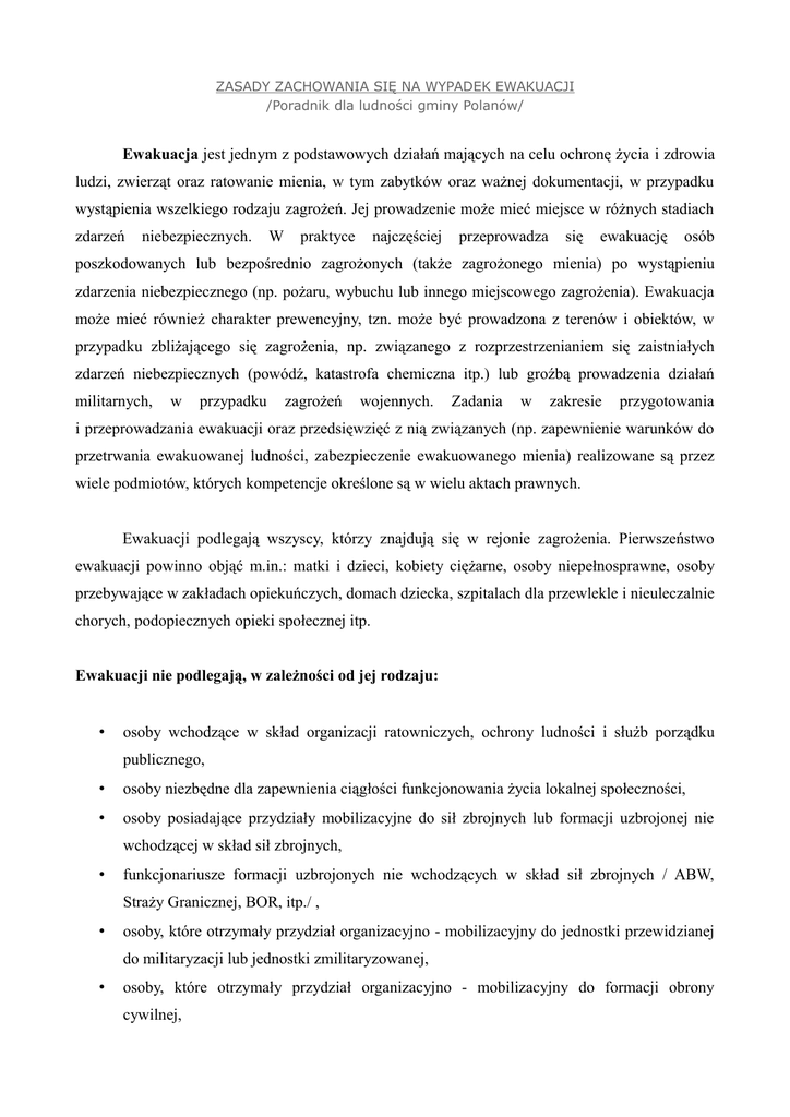ZASADY ZACHOWANIA SIĘ NA WYPADEK EWAKUACJI /Poradnik dla ludności gminy Polanów/ Ewakuacja jest jednym z podstawowych działań mających na celu ochronę życia i zdrowia ludzi, zwierząt oraz ratowanie mienia, w tym zabytków oraz ważnej dokumentacji, w przypadku wystąpienia wszelkiego rodzaju zagrożeń. Jej prowadzenie może mieć miejsce w różnych stadiach zdarzeń niebezpiecznych. W praktyce najczęściej przeprowadza się ewakuację osób poszkodowanych lub bezpośrednio zagrożonych (także zagrożonego mienia) po wystąpieniu zdarzenia niebezpiecznego (np. pożaru, wybuchu lub innego miejscowego zagrożenia). Ewakuacja może mieć również charakter prewencyjny, tzn. może być prowadzona z terenów i obiektów, w przypadku zbliżającego się zagrożenia, np. związanego z rozprzestrzenianiem się zaistniałych zdarzeń niebezpiecznych (powódź, katastrofa chemiczna itp.) lub groźbą prowadzenia działań militarnych, w przypadku zagrożeń wojennych. Zadania w zakresie przygotowania i przeprowadzania ewakuacji oraz przedsięwzięć z nią związanych (np. zapewnienie warunków do przetrwania ewakuowanej ludności, zabezpieczenie ewakuowanego mienia) realizowane są przez wiele podmiotów, których kompetencje określone są w wielu aktach prawnych. Ewakuacji podlegają wszyscy, którzy znajdują się w rejonie zagrożenia. Pierwszeństwo ewakuacji powinno objąć m.in.: matki i dzieci, kobiety ciężarne, osoby niepełnosprawne, osoby przebywające w zakładach opiekuńczych, domach dziecka, szpitalach dla przewlekle i nieuleczalnie chorych, podopiecznych opieki społecznej itp. Ewakuacji nie podlegają, w zależności od jej rodzaju: • osoby wchodzące w skład organizacji ratowniczych, ochrony ludności i służb porządku publicznego, • osoby niezbędne dla zapewnienia ciągłości funkcjonowania życia lokalnej społeczności, • osoby posiadające przydziały mobilizacyjne do sił zbrojnych lub formacji uzbrojonej nie wchodzącej w skład sił zbrojnych, • funkcjonariusze formacji uzbrojonych nie wchodzących w skład sił zbrojnych / ABW, Straży Granicznej, BOR, itp./ , • osoby, które otrzymały przydział organizacyjno - mobilizacyjny do jednostki przewidzianej do militaryzacji lub jednostki zmilitaryzowanej, • osoby, które otrzymały przydział organizacyjno - mobilizacyjny do formacji obrony cywilnej, • osoby niezbędne w danym rejonie, ze względu na realizację zadań przez siły zbrojne. Ewakuacja polega na przemieszczeniu się ludności, zwierząt i transporcie mienia z rejonów, w których występują zagrożenia do miejsc bezpiecznych. Z uwagi na uwarunkowania związane z rodzajem i skalą zagrożenia możemy wyróżnić ewakuację I, II i III stopnia. Ewakuacja I stopnia polega na niezwłocznym przemieszczeniu ludności, zwierząt, mienia z obszarów/miejsc, w których wystąpiło nagłe, nieprzewidziane bezpośrednie zagrożenie poza strefę zagrożenia. Realizuje się ją natychmiast po zaistnieniu zagrożenia dla życia, zdrowia, i mienia. Organizuje się ją na polecenie wójta, burmistrza /prezydenta miasta/. Ewakuację może także zarządzić osoba kierująca akcją ratunkową na terenie objętym tą akcją. Kierujący akcją ratowniczą zobowiązany jest każdorazowo powiadomić właściwy organ administracji samorządowej o podjętej takiej decyzji, podając w szczególności: 1. rejon, teren, obiekty lub zespół budynków dla którego zarządził ewakuację, 2. rodzaj zagrożenia, który był czynnikiem determinującym ogłoszenie ewakuacji, 3. liczbę ewakuowanych, 4. miejsce do którego dokonano ewakuacji. Ewakuacja II stopnia polega na uprzednio przygotowanym planowym przemieszczeniu ludności, zwierząt, mienia z rejonów przyległych do zakładów, obiektów hydrotechnicznych, ze stref zalewowych oraz rejonów przyległych do innych obiektów stanowiących potencjalne zagrożenie dla ludności, zwierząt lub mienia w przypadku ich uszkodzenia lub awarii. Realizuje się ją w sytuacji wystąpienia symptomów takiego zagrożenia. Ewakuacja III stopnia polega na uprzednio przygotowanym przemieszczeniu ludności, zwierząt, mienia, podczas podwyższania stanu gotowości obronnej państwa. Prowadzona jest w czasie zagrożenia bezpieczeństwa państwa i wojny. W ramach ewakuacji I, II i III stopnia należy przewidzieć zarówno ewakuację zorganizowaną, jak i samoewakuację. Samoewakuacja polega na przemieszczeniu się ludności z rejonów w których może wystąpić lub wystąpiło bezpośrednie zagrożenie dla życia i zdrowia poza strefę zagrożenia,. Prowadzona jest przede wszystkim w oparciu o własne możliwości (transportowe, zakwaterowania, itd.). W przypadku ewakuacji I i II stopnia decyzję o jej przeprowadzeniu, w zależności od rodzaju i skali zagrożenia podejmują: • wójt (burmistrz, prezydent miasta), starosta, wojewoda z obszarów bezpośrednio zagrożonych; • organy kierujące działaniami w celu zapobieżenia skutkom klęski żywiołowej lub ich usunięcia, w zależności od obszaru objętego klęską są to: ◦ wójt (burmistrz, prezydent miasta) – jeżeli stan klęski żywiołowej wprowadzono tylko na obszarze gminy, ◦ starosta – jeżeli stan klęski żywiołowej wprowadzono na obszarze więcej niż jednej gminy wchodzącej w skład powiatu, ◦ wojewoda – jeżeli stan klęski żywiołowej wprowadzono na obszarze więcej niż jednego powiatu wchodzącego w skład województwa, – minister właściwy do spraw wewnętrznych lub inny (właściwy) minister – jeżeli stan klęski żywiołowej wprowadzono na obszarze więcej niż jednego województwa, • wojewoda w przypadku zdarzeń radiacyjnych o zasięgu wojewódzkim, • minister właściwy do spraw wewnętrznych w przypadku zdarzeń radiacyjnych o zasięgu krajowym, • osoba kierująca akcją ratunkową; w tym przypadku zakres oraz sposób organizacji działań określa organ władzy publicznej (nie dotyczy II stopnia ewakuacji). Do o