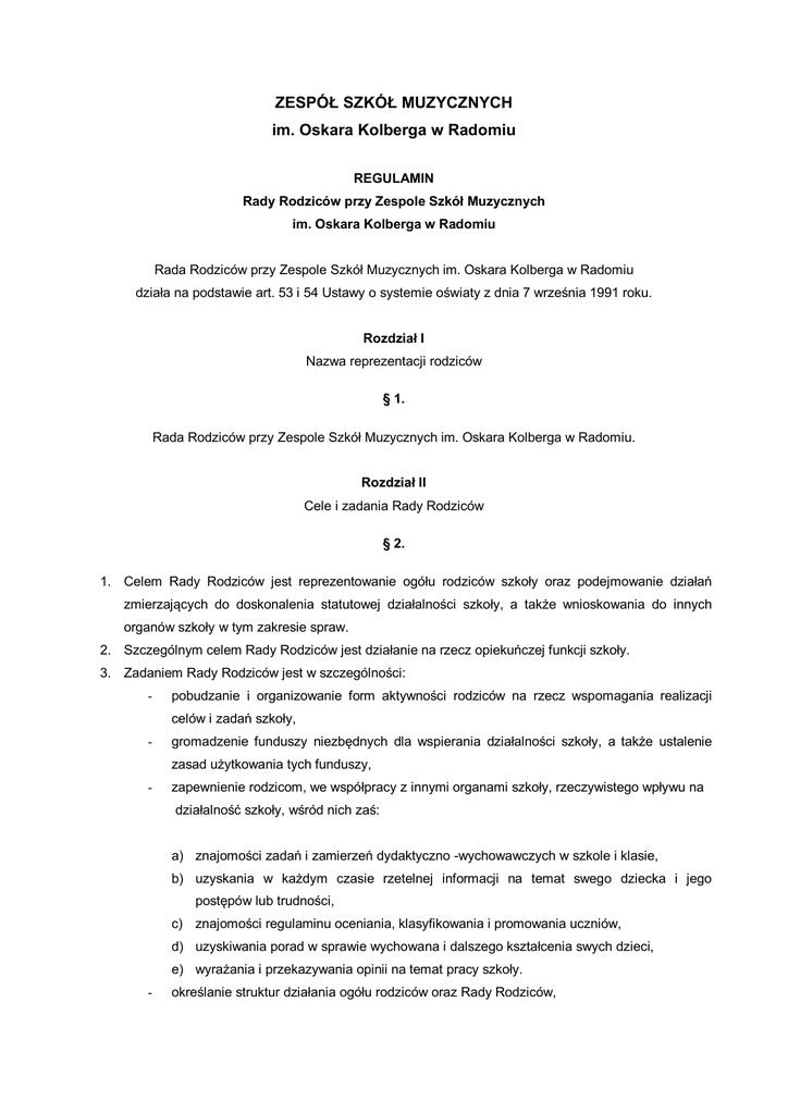 ZESPÓŁ SZKÓŁ MUZYCZNYCH im. Oskara Kolberga w Radomiu REGULAMIN Rady Rodziców przy Zespole Szkół Muzycznych im. Oskara Kolberga w Radomiu Rada Rodziców przy Zespole Szkół Muzycznych im. Oskara Kolberga w Radomiu działa na podstawie art. 53 i 54 Ustawy o systemie oświaty z dnia 7 września 1991 roku. Rozdział I Nazwa reprezentacji rodziców § 1. Rada Rodziców przy Zespole Szkół Muzycznych im. Oskara Kolberga w Radomiu. Rozdział II Cele i zadania Rady Rodziców § 2. 1. Celem Rady Rodziców jest reprezentowanie ogółu rodziców szkoły oraz podejmowanie działań zmierzających do doskonalenia statutowej działalności szkoły, a także wnioskowania do innych organów szkoły w tym zakresie spraw. 2. Szczególnym celem Rady Rodziców jest działanie na rzecz opiekuńczej funkcji szkoły. 3. Zadaniem Rady Rodziców jest w szczególności: - pobudzanie i organizowanie form aktywności rodziców na rzecz wspomagania realizacji celów i zadań szkoły, - gromadzenie funduszy niezbędnych dla wspierania działalności szkoły, a także ustalenie zasad użytkowania tych funduszy, - zapewnienie rodzicom, we współpracy z innymi organami szkoły, rzeczywistego wpływu na działalność szkoły, wśród nich zaś: a) znajomości zadań i zamierzeń dydaktyczno -wychowawczych w szkole i klasie, b) uzyskania w każdym czasie rzetelnej informacji na temat swego dziecka i jego postępów lub trudności, c) znajomości regulaminu oceniania, klasyfikowania i promowania uczniów, d) uzyskiwania porad w sprawie wychowana i dalszego kształcenia swych dzieci, e) wyrażania i przekazywania opinii na temat pracy szkoły. - określanie struktur działania ogółu rodziców oraz Rady Rodziców, - uchwalenie z Radą Pedagogiczną, a) programu wychowawczego szkoły, b) programu profilaktyki dostosowanego do potrzeb rozwojowych uczniów, - opiniowanie programu i harmonogramu poprawy efektywności kształcenia i wychowania, - opiniowanie projektu planu finansowego składanego przez dyrektora szkoły, - opiniowanie podjęcia i prowadzenia w szkole działalności przez stowarzyszenia i inne organizacje, - udział przedstawiciela Rady Rodziców w komisji konkursowej powołanej w celu wyboru dyrektora szkoły, - wnioskowanie o ocenę pracy nauczyciela, - przedstawienie opinii na temat oceny dorobku zawodowego nauczyciela stażysty, kontraktowego i mianowanego za okres stażu. Rozdział III Organizacja działania ogółu rodziców i Rady Rodziców. § 3. 1. Najwyższą władzą ogółu rodziców jest Prezydium Rady Rodziców uczniów szkoły. 2. Podstawowym ogniwem organizacyjnym ogółu rodziców szkoły jest zebranie rodziców klasy. Zebranie rodziców wybiera spośród siebie „klasową radę rodziców” składającą z przynajmniej trzech osób, tak aby można było utworzyć funkcję przewodniczącego, skarbnika i sekretarza. 3. Wszyscy członkowie klasowych rad rodziców tworzą Radę Rodziców szkoły. 4. W zebraniu plenarnym Rady Rodziców biorą udział przedstawiciele rad klasowych i obecne Prezydium Rady Rodziców wraz z Komisją Rewizyjną. 5. Plenarne zebranie Rady Rodziców szkoły wybiera spośród siebie: - prezydium (zarząd) Rady, jako wewnętrzny organ kierujący pracami Rady Rodziców oraz, - komisję rewizyjną, jako organ kontrolny Rady Rodziców. Prezydium Rady Rodziców składa się z przynajmniej siedmiu członków, tak aby można było wyłonić funkcje: przewodniczącego, wiceprzewodniczącego, sekretarza, skarbnika oraz członków prezydium. Prezydium dokonuje swego ukonstytuowania na swoim pierwszym posiedzeniu. 6. Komisja rewizyjna składa się co najmniej z trzech osób, nie więcej jednak niż z pięciu osób. Co najmniej jeden członek komisji rewizyjnej powinien być dobrze zorientowany w przepisach prawa finansowego i rachunkowości. Członkowie komisji rewizyjnej wybierają przewodniczącego i zastępcę przewodniczącego na pierwszym swoim posiedzeniu. 7. Prezydium Rady Rodziców może tworzyć stałe lub doraźne komisje i zespoły robocze spośród członków, członków Rady Rodziców i spośród innych rodziców i osób współdziałających z rodzicami spoza szkoły (jako ekspertów) - dla wykonania określonych zadań. 8. Prezydium Rady Rodziców reprezentowane jest poprzez przewodniczącego Rady Rodziców. §4 Kadencja Rady Rodziców i jej organów trwa rok od 01 października do 30 września. Rozdział IV Tryb Podejmowania uchwał przez Radę Rodziców i jego organy wewnętrzne. §5 1. Uchwały podejmuje się zwykłą większością głosów regulaminowego składu danego organu. 2. Listę posiedzenia danego organu ustala każdorazowo sekretarz organu lub przewodniczący. 3. Uchwały są protokołowane w protokolarzu Rady Rodziców szkoły. Klasowe rady rodziców decydują samodzielnie, czy protokołować uchwały. Za protokolarz Rady Rodziców i jego prawidłowe prowadzenie odpowiada sekretarz prezydium Rady Rodziców. Rozdział V Wybory do organów Rady Rodziców §6 1. Wybory do Rady Rodziców, (klasowej rady rodziców), prezydium Rady i do komisji rewizyjnej odbywają się w głosowaniu tajnym. 2. Lista kandydatów do danego organu nie może być mniejsza od liczby miejsc ustalonych dla danego organu. Zgłoszeni kandydaci muszą wyrazić ustnie lub pisemnie ( jeśli nie mogą wziąć udziału w zebraniu wyborczym) swoją zgodę na kandydowanie. 3. Wybrani zostają ci kandydaci, którzy uzyskali 50 % oraz jeden głos uczestników prawomocnego zebrania wyborczego. 4. Przy równej ilości uzyskanych głosów zarządza się ponowne głosowanie. 5. Nowo wybrane organy mają obowiązek ukonstytuowania się na pierwszym swoim posiedzeniu. 6. Ustala się następujący porządek obrad plenarnego zebrania sprawozdawczo -wyborczego Rady Rodziców: - otwarcie obrad, - wybór przewodniczącego i sekretarza, - zatwierdzenie porządku obrad, - zatwierdzenie regulaminu obrad, - wybór komisji: a) mandatowej i wyborczej, b) uchwał i wniosków (wybory do tej funkcji s