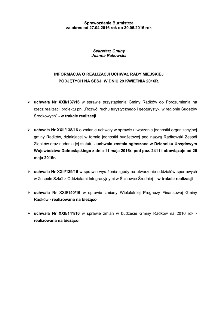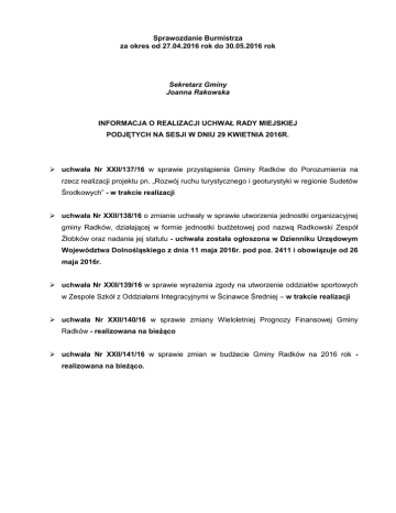 Sprawozdanie Burmistrza za okres od 27.04.2016 rok do 30.05