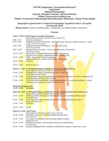 XXVIII Sympozjum: „Szczepienia Ochronne” organizator Oddział Immunologii Instytut „Pomnik-Centrum” Zdrowia Dziecka Polskie Towarzystwo Pediatryczne Polskie Towarzystwo Immunologii Doświadczalnej i Klinicznej - Sekcja Wakcynologii Sympozjum organizowane w ramach Europejskiego Tygodnia na Rzecz Szczepień 23 kwiecień, 2010 Miejsce obrad: Centrum Konferencyjno – Kongresowe, ul. Bobrowiecka 9, Warszawa Program Sesja I: 9:00 - 10:45 Program szczepień ochronnych Przewodniczą: Ewa Bernatowska, Teresa Jackowska 9:00 - 9:10 Otwarcie sympozjum 9:10 - 9:30 Program Szczepień Ochronnych - profilaktyki ospy wietrznej u zdrowych dzieci i z grup ryzyka. Teresa Jackowska, 9:30 - 9:50 Program Szczepień Ochronnych – nowe kierunki zmian Paweł Grzesiowski 9:50 - 10:10 Bezpieczeństwo szczepień – nowe i stare adiuwanty i konserwanty Ewa Bernatowska 10:10 - 10:25 Planowanie i realizacja Programu Szczepień Ochronnych Dagmara Korbasińska, Departament Matki i Dziecka, MZ 10:25 - 10:35 WHO – Europejski Tydzień Szczepień Paulina Miśkiewicz, dyrektor biura WHO w Warszawie 10:35 - 10:45 Dyskusja 10:45 - 11:00 Przerwa kawowa Sesja II : 11:00 - 12:10 Epidemiologia i profilaktyka zakaŜeń pneumokokowych Przewodniczą: Ewa Bernatowska, Paweł Grzesiowski 11:00 - 11:30 Epidemiologia zakaŜeń pneumokokowych w Niemczech Prof. Mark van der Linden 11:30 - 11:50 Epidemiologia zakaŜeń pneumokokowych, pokrycie serotypowe nowych szczepionek oraz antybiotykooporność Paweł Grzesiowski 11:50 - 12:10 Nowe moŜliwości profilaktyki choroby pneumokokowej w codziennej praktyce u dzieci zdrowych oraz w grupach ryzyka Ewa Bernatowska Dyskusja okrągłego stołu: 12:10 - 13:00 Dyskusja Sesja III: 13:00 - 13:50 Epidemiologia, profilaktyka i leczenie zakaŜeń bakteriami otoczkowymi Przewodniczą: Andrzej Radzikowski, Ryszard Konior 13:00 - 13:20 Kliniczne aspekty inwazyjnych zakaŜeń u dzieci, efekty działań profilaktycznych Ryszard Konior, 13:20 - 13:40 Nowe wytyczne terapii najczęstszych zakaŜeń układu oddechowego u dzieci Andrzej Radzikowski 13:40 - 13:50 Dyskusja 13:50 - 14:30 Lunch Sesja IV: 14:30 - 16:30 Varia Przewodniczą: Ewa Bernatowska i Piotr Albrecht 14:30 - 14:50 Standardy szczepień w chorobach układu pokarmowego Piotr Albrecht 14:50 - 15:10 Co nowego w profilaktyce kleszczowego zapalenia mózgu Małgorzata Pac 15:10 - 15:30 Profilaktyka zakaŜeń wirusem grypy sezonowej i pandemicznej Ewa Duszczyk 15:30 - 16:30 Dyskusja Okrągłego Stołu z udziałem wykładowców; pytania i odpowiedzi z sali.