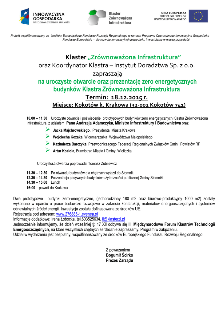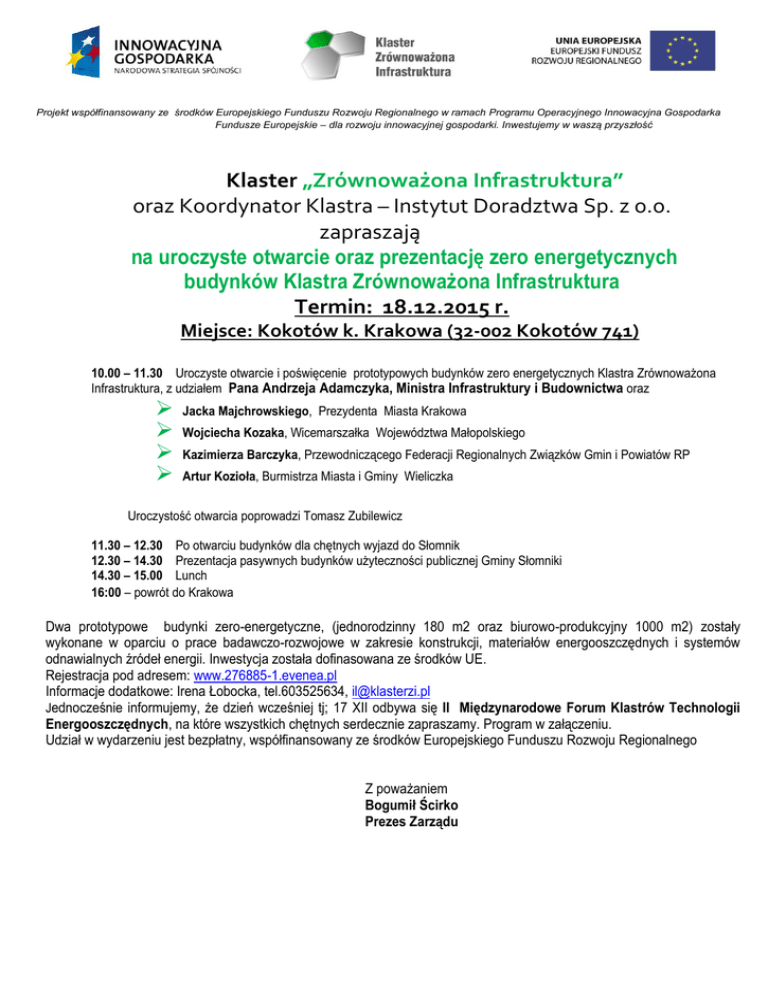 Projekt współfinansowany ze środków Europejskiego Funduszu Rozwoju Regionalnego w ramach Programu Operacyjnego Innowacyjna Gospodarka Fundusze Europejskie – dla rozwoju innowacyjnej gospodarki. Inwestujemy w waszą przyszłość Klaster „Zrównoważona Infrastruktura” oraz Koordynator Klastra – Instytut Doradztwa Sp. z o.o. zapraszają na uroczyste otwarcie oraz prezentację zero energetycznych budynków Klastra Zrównoważona Infrastruktura Termin: 18.12.2015 r. Miejsce: Kokotów k. Krakowa (32-002 Kokotów 741) 10.00 – 11.30 Uroczyste otwarcie i poświęcenie prototypowych budynków zero energetycznych Klastra Zrównoważona Infrastruktura, z udziałem Pana Andrzeja Adamczyka, Ministra Infrastruktury i Budownictwa oraz Jacka Majchrowskiego, Prezydenta Miasta Krakowa Wojciecha Kozaka, Wicemarszałka Województwa Małopolskiego Kazimierza Barczyka, Przewodniczącego Federacji Regionalnych Związków Gmin i Powiatów RP Artur Kozioła, Burmistrza Miasta i Gminy Wieliczka Uroczystość otwarcia poprowadzi Tomasz Zubilewicz 11.30 – 12.30 Po otwarciu budynków dla chętnych wyjazd do Słomnik 12.30 – 14.30 Prezentacja pasywnych budynków użyteczności publicznej Gminy Słomniki 14.30 – 15.00 Lunch 16:00 – powrót do Krakowa Dwa prototypowe budynki zero-energetyczne, (jednorodzinny 180 m2 oraz biurowo-produkcyjny 1000 m2) zostały wykonane w oparciu o prace badawczo-rozwojowe w zakresie konstrukcji, materiałów energooszczędnych i systemów odnawialnych źródeł energii. Inwestycja została dofinasowana ze środków UE. Rejestracja pod adresem: www.276885-1.evenea.pl Informacje dodatkowe: Irena Łobocka, tel.603525634, [email protected] Jednocześnie informujemy, że dzień wcześniej tj; 17 XII odbywa się II Międzynarodowe Forum Klastrów Technologii Energooszczędnych, na które wszystkich chętnych serdecznie zapraszamy. Program w załączeniu. Udział w wydarzeniu jest bezpłatny, współfinansowany ze środków Europejskiego Funduszu Rozwoju Regionalnego Z poważaniem Bogumił Ścirko Prezes Zarządu Projekt współfinansowany ze środków Europejskiego Funduszu Rozwoju Regionalnego w ramach Programu Operacyjnego Innowacyjna Gospodarka Fundusze Europejskie – dla rozwoju innowacyjnej gospodarki. Inwestujemy w waszą przyszłość II Międzynarodowe Forum Klastrów Technologii Energooszczędnych PROGRAM WYDARZENIA: 17 grudnia 2015r. Sala Konferencyjna Hotelu Novum, ul. Grunwaldzka 15h, 32-005 Niepołomice k. Krakowa 10.00-10.30 - Powitanie Uczestników: Roman Ptak – Burmistrz Miasta Niepołomice, Kazimierz Barczyk – Przewodniczący Federacji Regionalnych Związków Gmin i Powiatów RP, Bogumił Ścirko - Prezes Zarządu Instytutu Doradztwa (Koordynator Klastra Zrównoważona Infrastruktura) Prowadzenie konferencji: Tomasz Zubilewicz – prezenter pogody w polskiej telewizji; od roku 2011 w TVN METEO ukazuje się ekologiczny magazyn Tomasza Zubilewicza pod nazwą „Dobre Klimaty”. Autor popularyzuje wśród widzów kwestie energooszczędności i budowy domów pasywnych jako sposób na ochronę klimatu. Program przybliża ponadto zalety Odnawialnych Źródeł Energii jako sposobów na tanią zieloną energię. 10.30-12.30 - Prezentacja wyników realizacji projektu „Zrównoważona Infrastruktura – rozwój technologii autonomicznego budownictwa i nowoczesnych rozwiązań automatyki użytkowej”, w tym: Budynki zero energetyczne Klastra Zrównoważona Infrastruktura – dostępna cenowo alternatywa dla tradycyjnego budownictwa [Tomasz Pyszczek – Klaster ZI, Architektura Pasywna] Inteligencja budynków – autorski system zarządzania budynkami opracowany w ramach Klastra [ dr Tomasz Orzechowski – AGH, Klaster ZI, Sensinum Sp. z o.o.] Mobilne Laboratorium Innowacyjnego Budownictwa – nowoczesne metody diagnostyki energetycznej budynków [Magdalena Szczerba – Klaster ZI] Prezentacja wyników badań przemysłowych i prac rozwojowych w ramach projektu Budowanie sieci współpracy na rzecz promocji technologii energooszczędnych [Jarosław Kotyza, Paweł Jastrzębski, Piotr Jasion – AGH, Laboratorium Odnawialnych Źródeł Energii w Miękini] Działania Klastra Zrównoważona Infrastruktura na rzecz poprawy efektywności energetycznej –materiał filmowy 12.30 – 12.45 – Przerwa Kawowa 12.45 – 13.45 Panel dyskusyjny I – Temat: wyzwania i szanse dla klastrów budowlanych i ekoenergetycznych w kontekście rozwoju rynku budownictwa energooszczędnego i pasywnego (Prawodawstwo i zmiany legislacyjne w procesie rozwoju rynku technologii energooszczędnych i OZE w Polsce i w krajach Europy Zachodniej, dyrektywa budynkowa, ustawa o OZE/ ISE, środki zewnętrzne na poprawę efektywności energetycznej) – MODERACJA: Krzysztof Szczotka Podlaski Klaster Budownictwa Pasywnego Dr Grzegorz Wisz - Podkarpacki Klaster Energii Odnawialnej Andrzej Zarazka - Sądecki Klaster Energii Odnawialnej Dariusz Miziński - Klaster Inteligentne Budownictwo Projekt współfinansowany ze środków Europejskiego Funduszu Rozwoju Regionalnego w ramach Programu Operacyjnego Innowacyjna Gospodarka Fundusze Europejskie – dla rozwoju innowacyjnej gospodarki. Inwestujemy w waszą przyszłość 13.45 – 14.45 Polski Instytut Budownictwa Pasywnego i Energii Odnawialnej Jan Szuro - Urząd Dozoru Technicznego Eurocolor Sp. z o.o. – polski producent stolarki energooszczędnej TermoOrganika Sp. z o.o. – polski producent materiałów dociepleniowych Grupa Silikaty Sp. z o.o. – polski producent energooszczędnych materiałów konstrukcyjnych Katarzyna Wojda - Bjerg Architektur (Dania) Viktor Kulynycz – Grupa Budownictwa Energetycznego Budkontrakt (Ukraina) Panel dyskusyjny II – Temat: Wsparcie regionalne i centralne środowisk klastrowych oraz internacjonalizacja klastrów w nowej perspektywie na lata 2014-2020. Dobre praktyki współpracy nauki z biznesem – wnioski i rekomendacje – MODERACJA: Edyta Pęcherz Jakub Szymański - Urząd Marszałkowski Województwa Małopo
