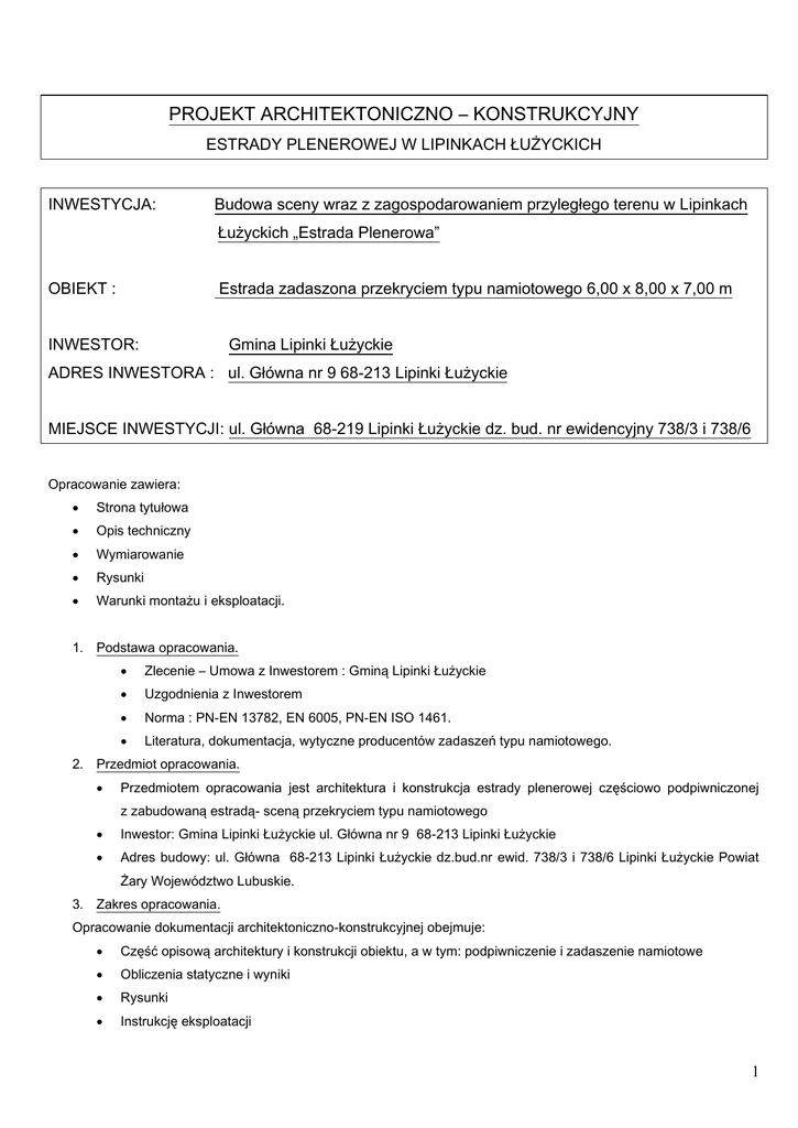 PROJEKT ARCHITEKTONICZNO – KONSTRUKCYJNY ESTRADY PLENEROWEJ W LIPINKACH ŁUŻYCKICH INWESTYCJA: Budowa sceny wraz z zagospodarowaniem przyległego terenu w Lipinkach Łużyckich „Estrada Plenerowa” OBIEKT : Estrada zadaszona przekryciem typu namiotowego 6,00 x 8,00 x 7,00 m INWESTOR: Gmina Lipinki Łużyckie ADRES INWESTORA : ul. Główna nr 9 68-213 Lipinki Łużyckie MIEJSCE INWESTYCJI: ul. Główna 68-219 Lipinki Łużyckie dz. bud. nr ewidencyjny 738/3 i 738/6 Opracowanie zawiera: Strona tytułowa Opis techniczny Wymiarowanie Rysunki Warunki montażu i eksploatacji. 1. Podstawa opracowania. Zlecenie – Umowa z Inwestorem : Gminą Lipinki Łużyckie Uzgodnienia z Inwestorem Norma : PN-EN 13782, EN 6005, PN-EN ISO 1461. Literatura, dokumentacja, wytyczne producentów zadaszeń typu namiotowego. 2. Przedmiot opracowania. Przedmiotem opracowania jest architektura i konstrukcja estrady plenerowej częściowo podpiwniczonej z zabudowaną estradą- sceną przekryciem typu namiotowego Inwestor: Gmina Lipinki Łużyckie ul. Główna nr 9 68-213 Lipinki Łużyckie Adres budowy: ul. Główna 68-213 Lipinki Łużyckie dz.bud.nr ewid. 738/3 i 738/6 Lipinki Łużyckie Powiat Żary Województwo Lubuskie. 3. Zakres opracowania. Opracowanie dokumentacji architektoniczno-konstrukcyjnej obejmuje: Część opisową architektury i konstrukcji obiektu, a w tym: podpiwniczenie i zadaszenie namiotowe Obliczenia statyczne i wyniki Rysunki Instrukcję eksploatacji 1 4. Normy Warunki techniczne wykonania i odbioru robót budowlano-montażowych Słupy, rygle, płatwie - EN 6005, PN-EN ISO 1461. Obiekty, namioty, bezpieczeństwo - PN-EN 13782 5. Charakterystyka obiektu. Posadowiony bezpośrednio na gruncie obiekt częściowo podpiwniczony zawierający pomieszczenie techniczne estrady plenerowej, niepalny, wykonany w technologiach żelbetu i murarskich przekryty płytą żelbetową opartą na ścianach nośnych stanowiącą podłogę estrady, na której zamontowane zostanie przekrycie namiotowe Jednonawowy obiekt namiotowy z dachem półkolistym o nachyleniu ( łuku) około 20 stopni pokryty materiałem PCW o gramaturze 650 gr./m2 ( sklasyfikowanym pod względem stopnia palności jako niezapalny atestem wydanym przez jednostkę certyfikującą. Zadaszenie założone na konstrukcję kratownicową wykonaną z lekkich profili aluminiowych. „Ściany” w formie siatek kotarowych A-203 B1. Obiekt namiotowy całkowicie prefabrykowany z możliwością demontażu i ponownego montażu Ściany zewnętrzne przyziemia pokryte zostaną warstwą tynku polimerowego cienkowarstwowego, skraje płyty obłożone opierzeniem metaloplastycznym (lub tynkiem ozdobnym), posadzka estrady wyszlifowana i zagruntowana 2- krotnie środkiem impregnacyjnym do betonu. Wnętrze części technicznej ( ściany i sufit) pokryte tynkiem cementowo- wapiennym rodzaj III, a posadzka cementowa zatarta na gładko. Wewnątrz pomieszczenia technicznego wykonane zostaną instalacje elektroenergetyczne: oświetlenia, sterowania, zabezpieczenia oraz tablice rozdzielcze do obsługi terenu „Estrady Plenerowej”. Przewiduje się również urządzenie 2-ch zaworów czerpalnych wody do celów porządkowych wg odrębnego opracowania. Wymiary podstawowe: a) pomieszczenie techniczne podpiwniczone - szerokość 8,50 m - długość ( głębokość bez wsporników) 6,10 m - wysokość nad poziomem terenu 1,20 m - wysokość w świetle 2,35 m - wysunięcie wspornikowe podłogi estrady 2,40 m - wysunięcie wspornikowe podestu wejściowego 1,40 m - wysunięcie wspornikowe zadaszenia bramy do pomieszczenia 1,20 m b) zadaszenie namiotowe - szerokość 8,00 m - głębokość 6,00 m - wysokość słupów 7,00 m - strzałka dachu 1,25 m - wysokość na wiatr 6,75 m. c) ogólnie: - powierzchnia zabudowy - kubatura 61,33 m2 385,44 m3. 2 6. Założenia architektoniczno- konstrukcyjne. Część podpiwniczona – pomieszczenie techniczne Projektowany obiekt oparty zostanie bezpośrednio na gruncie za pośrednictwem ław żelbetowych oraz stóp żelbetowych dla słupków podestu klatki schodowej wejściowej na scenę. Na fundamentach wykonane zostaną ściany nośne z bloczków betonowych na zaprawie cementowej. Część podziemna zabezpieczona zostanie przeciwwilgociowo poprzez naniesienie powłok 2-krotnie z mas bitumicznych dla izolacji pionowej z przyklejeniem 1 w-wy papy termozgrzewalnej gr. 4,2 mm. Izolacje poziomą wykonać należy z 2-ch warstw papy termozgrzewalnej ( 2,8 mm + 4,2 mm ) po uprzednim zagruntowaniu podłoża betonowego. Na ścianach nośnych oparta zostanie płyta estrady – sceny wykonana z żelbetu wykonywanego w technologii „ na mokro” bezpośrednio w miejscu wbudowania. Na podłożu z żelbetowej płyty wykonana zostanie izolacja przeciwwilgociowa z papy termozgrzewalnej w formie 2-ch warstw papy grubości 4,2 mm założona po uprzednim zagruntowaniu podłoża betonowego warstwą bitumu powłokowego. Na izolacji założona zostanie warstwa posadzki betonowej – jastrych zbrojony siatką o oczkach 10 x 10 cm średnicy 6 mm zagładzony maszynowo na gładko, ze spadkiem około 0,5% od środka na zewnątrz krawędzi posadzki estrady. Część zadaszona – namiot Projektowane zadaszenie namiotowe zamontowane zostanie do podłoża żelbetowego gotowej posadzki sceny przy pomocy typowych kotew wklejanych Fischer. Stopy stalowe wym. 600 x 600 mm jako podstawa słupów wym. 290/290 mm kratownicowych aluminiowych posadowione zostaną na gotowej połaci sceny z warstwą folii izolującej o gr. 2,00 mm. Zadaszenie z PCW w formie plandeki montowane będzie przy pomocy wciągarek łańcuchowych o udźwigu 0,5 t. „Ściany” zabezpieczone zostaną poprzez zamontowanie siatek A-203 B1. Słupy odciążone (zabezpieczone) przeciwwiatrowo zostaną poprzez zamontowanie odciągów montowanych do 4-ch żelbetowych wsporników posadowionych w gruncie w odległości ok. 4,50 m w przekątnych zadaszenia. 7. Układ stężeń. Słupy nośne konstrukcji zadaszenia 