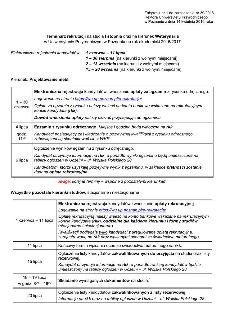 Załącznik nr 1 do zarządzenia nr 39/2016 Rektora Uniwersytetu Przyrodniczego w Poznaniu z dnia 14 kwietnia 2016 roku Terminarz rekrutacji na studia I stopnia oraz na kierunek Weterynaria w Uniwersytecie Przyrodniczym w Poznaniu na rok akademicki 2016/2017 Elektroniczna rejestracja kandydatów: 1 czerwca – 11 lipca 1 – 30 sierpnia (na kierunki z wolnymi miejscami) 2 – 13 września (na kierunki z wolnymi miejscami) 15 – 20 września (na kierunki z wolnymi miejscami) Kierunek: Projektowanie mebli Elektroniczna rejestracja kandydatów i wnoszenie opłaty za egzamin z rysunku odręcznego. 1 – 30 czerwca Logowanie na stronie https://wu.up.poznan.pl/e-rekrutacja/ Opłatę za egzamin z rysunku należy wnieść na konto bankowe wskazane na rekrutacyjnym koncie kandydata (rkk). Dowód wniesienia opłaty należy okazać przystępując do egzaminu. 4 lipca Egzamin z rysunku odręcznego. Miejsce i godzina będą widoczne na rkk. godz. 1100 Kandydaci posiadający zaświadczenie o pozytywnej kwalifikacji z rysunku odręcznego zobowiązani są skontaktować się z WKR. Ogłoszenie wyników egzaminu z rysunku odręcznego. 6 lipca Kandydat otrzymuje informację na rkk, a ponadto wyniki egzaminu będą umieszczone na tablicy ogłoszeń w Uczelni – ul. Wojska Polskiego 28. Kandydatom, którzy uzyskają pozytywny wynik z egzaminu, w zakładce płatności zostanie dodana opłata rekrutacyjna. uwaga: kolejne terminy – wspólne z pozostałymi kierunkami Wszystkie pozostałe kierunki studiów, stacjonarne i niestacjonarne Elektroniczna rejestracja kandydatów i wnoszenie opłaty rekrutacyjnej. Logowanie na stronie https://wu.up.poznan.pl/e-rekrutacja/ 1 czerwca – 11 lipca Opłatę rekrutacyjną należy wnieść na konto bankowe wskazane na rekrutacyjnym koncie kandydata (rkk), oddzielne dla każdego kierunku i formy studiów (stacjonarne i niestacjonarne). Kwalifikacji podlegają tylko kandydaci z uregulowaną opłatą rekrutacyjną, zarejestrowaną na rkk oraz wpisanymi ocenami ze świadectwa maturalnego. 11 lipca 15 lipca 18 – 19 lipca w godz. 800 – 1600 20 lipca Końcowy termin wpisania ocen ze świadectwa maturalnego na rkk. Ogłoszenie listy kandydatów zakwalifikowanych do przyjęcia na studia oraz listy rezerwowej. Kandydat otrzymuje informację na rkk, a ponadto ranking kandydatów będzie umieszczony na tablicy ogłoszeń w Uczelni – ul. Wojska Polskiego 28. Składanie wymaganych dokumentów na studia.* Ogłoszenie listy kandydatów zakwalifikowanych z listy rezerwowej. Informacja na rkk oraz na tablicy ogłoszeń w Uczelni – ul. Wojska Polskiego 28. 21 lipca w godz. 900 – 1400 22 lipca 22 – 26 lipca Składanie wymaganych dokumentów na studia.* Informacja o wolnych miejscach. Każdy nieprzyjęty kandydat otrzyma na rkk możliwość wyboru innego kierunku, na którym są wolne miejsca. Kwalifikacja w tym trybie nie wymaga dodatkowej opłaty rekrutacyjnej. 27 lipca 28 lipca w godz. 900 – 1400 29 lipca Ogłoszenie wykazu kandydatów zakwalifikowanych z listy rezerwowej oraz kandydatów zakwalifikowanych na kierunki z wolnymi miejscami. Składanie wymaganych dokumentów na studia.* Wysyłanie decyzji. I I rekrut acja na ki erunki z w ol nymi mi ejscami Elektroniczna rejestracja kandydatów i wnoszenie opłaty rekrutacyjnej. 1 – 30 sierpnia Logowanie na stronie https://wu.up.poznan.pl/e-rekrutacja/ Opłatę rekrutacyjną należy wnieść na konto bankowe wskazane na rekrutacyjnym koncie kandydata (rkk), oddzielne dla każdego kierunku i formy studiów (stacjonarne i niestacjonarne). Dowód wniesienia opłaty rekrutacyjnej należy okazać wraz ze składanymi dokumentami. Ogłoszenie listy kandydatów zakwalifikowanych do przyjęcia na studia. 31 sierpnia 1 września w godz. 900 – 1400 2 września Kandydat otrzymuje informację na rkk, a ponadto ranking kandydatów będzie umieszczony na tablicy ogłoszeń w Uczelni – ul. Wojska Polskiego 28 Składanie wymaganych dokumentów na studia.* Wysyłanie decyzji kandydatom zarejestrowanym w II rekrutacji. I I I rekrut acja na ki erunki z w ol nymi mi ejscami Elektroniczna rejestracja kandydatów i wnoszenie opłaty rekrutacyjnej. Logowanie na stronie https://wu.up.poznan.pl/e-rekrutacja/ 2 – 13 września Opłatę rekrutacyjną należy wnieść na konto bankowe wskazane na rekrutacyjnym koncie kandydata (rkk), oddzielne dla każdego kierunku i formy studiów (stacjonarne i niestacjonarne). Dowód wniesienia opłaty rekrutacyjnej należy okazać wraz ze składanymi dokumentami. Ogłoszenie listy kandydatów zakwalifikowanych do przyjęcia na studia. 14 września 15 września w godz. 900 – 1400 16 września Kandydat otrzymuje informację na rkk, a ponadto ranking kandydatów będzie umieszczony na tablicy ogłoszeń w Uczelni – ul. Wojska Polskiego 28 Składanie wymaganych dokumentów na studia.* Wysyłanie decyzji kandydatom zarejestrowanym w III rekrutacji. I V rekrut acja na ki erunki z w ol nymi mi ejscami Elektroniczna rejestracja kandydatów i wnoszenie opłaty rekrutacyjnej. Logowanie na stronie https://wu.up.poznan.pl/e-rekrutacja/ 15 – 20 września Opłatę rekrutacyjną należy wnieść na konto bankowe wskazane na rekrutacyjnym koncie kandydata (rkk), oddzielne dla każdego kierunku i formy studiów (stacjonarne i niestacjonarne). Dowód wniesienia opłaty rekrutacyjnej należy okazać wraz ze składanymi dokumentami. Ogłoszenie listy kandydatów zakwalifikowanych do przyjęcia na studia. 21 września 22 września w godz. 900 – 1400 23 września * Kandydat otrzymuje informację na rkk, a ponadto ranking kandydatów będzie umieszczony na tablicy ogłoszeń w Uczelni – ul. Wojska Polskiego 28 Składanie wymaganych dokumentów na studia.* Wysyłanie decyzji kandydatom zarejestrowanym w IV rekrutacji. Dopuszcza się przesłanie dokumentów pocztą. Decyduje data wpływu do Uczelni, zgodnie z terminarzem.
