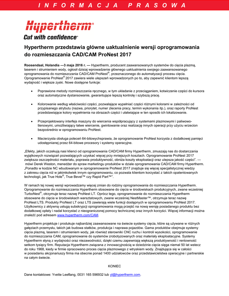 I N F O R M A C J A P R A S O W A Hypertherm przedstawia główne uaktualnienie wersji oprogramowania do rozmieszczania CAD/CAM ProNest 2017 Roosendaal, Holandia —3 maja 2016 r. — Hypertherm, producent zaawansowanych systemów do cięcia plazmą, laserem i strumieniem wody, ogłosił dzisiaj wprowadzenie głównego uaktualnienia swojego zaawansowanego ® oprogramowania do rozmieszczania CAD/CAM ProNest , przeznaczonego do automatyzacji procesu cięcia. ® Oprogramowanie ProNest 2017 zawiera wiele ulepszeń wprowadzonych po to, aby zapewnić klientom lepszą wydajność i większe zyski. Nowe dostępne funkcje: Poprawione metody rozmieszczania ręcznego, w tym układanie z przeciąganiem, kotwiczenie części do kursora oraz automatyczne dystansowanie, gwarantujące lepszą kontrolę i szybszą pracę. Kolorowanie według właściwości części, pozwalające wypełniać części różnymi kolorami w zależności od przypisanego atrybutu (nazwa, priorytet, numer zlecenia pracy, termin wykonania itp.), oraz raporty ProNest przedstawiające kolory wypełnienia na obrazach części i ułatwiające w ten sposób ich lokalizowanie. Przeprojektowany interfejs maszyny do wiercenia współpracujący z systemami plazmowymi i paliwowotlenowymi, umożliwiający łatwe wiercenie, gwintowanie oraz realizację innych operacji przy użyciu wrzecion bezpośrednio w oprogramowaniu ProNest. Macierzysta obsługa poleceń 64-bitowychsprawia, że oprogramowanie ProNest korzysta z dodatkowej pamięci udostępnianej przez 64-bitowe procesory i systemy operacyjne. „Efekty, jakich oczekują nasi klienci od oprogramowania CAD/CAM firmy Hypertherm, zmuszają nas do dostarczania wyjątkowych rozwiązań pozwalających uzyskać więcej przy mniejszych kosztach. Oprogramowanie ProNest 2017 zwiększa oszczędności materiału, poprawia produktywność, obniża koszty eksploatacji oraz ulepsza jakość części”. — mówi Derek Weston, menedżer do spraw marketingu produktów w dziale oprogramowania CAD/CAM firmy Hypertherm. „Ponadto w kodzie NC wbudowanym w oprogramowanie ProNest 2017 znajduje się więcej specjalistycznej wiedzy z zakresu cięcia niż w jakimkolwiek innym oprogramowaniu, co pozwala klientom korzystać z takich opatentowanych ® technologii, jak True Hole , True Bevel™ czy Rapid Part™”. W ramach tej nowej wersji wprowadzamy więcej zmian do rodziny oprogramowania do rozmieszczania Hypertherm. Oprogramowanie do rozmieszczania Hypertherm stosowane do cięcia w środowiskach produkcyjnych, zwane wcześniej ® TurboNest , otrzymuje teraz nazwę ProNest LT. Oprócz tego, oprogramowanie do rozmieszczania Hypertherm stosowane do cięcia w środowiskach warsztatowych, zwane wcześniej NestMaster™, otrzymuje teraz nazwę ProNest LTS. Produkty ProNest LT oraz LTS zawierają wiele funkcji dostępnych w oprogramowaniu ProNest 2017. Użytkownicy z aktywną usługą subskrypcji oprogramowania mogą przejść na nową wersję posiadanego produktu bez dodatkowej opłaty i nadal korzystać z nieograniczonej pomocy technicznej oraz innych korzyści. Więcej informacji można znaleźć pod adresem www.hypertherm.com/CAM. Hypertherm projektuje i produkuje najbardziej zaawansowane na świecie systemy cięcia, które są używane w różnych gałęziach przemysłu, takich jak budowa statków, produkcja i naprawa pojazdów. Gama produktów obejmuje systemy cięcia plazmą, laserem i strumieniem wody, jak również sterowniki CNC ruchu i kontroli wysokości, oprogramowanie do rozmieszczania CAM, oprogramowanie do systemów zrobotyzowanych oraz materiały eksploatacyjne. Systemy Hypertherm słyną z wydajności oraz niezawodności, dzięki czemu zapewniają większą produktywność i rentowność setkom tysięcy firm. Reputacja Hypertherm związana z innowacyjnością w dziedzinie cięcia sięga niemal 50 lat wstecz do roku 1968, kiedy w firmie opracowano proces cięcia plazmowego z wtryskiem wody. Znajdująca się w całości w posiadaniu akcjonariuszy firma ma obecnie ponad 1400 udziałowców oraz przedstawicielstwa operacyjne i partnerskie na całym świecie. KONIEC Dane kontaktowe: Yvette Leeflang, 0031 165 596932 lub [email protected].