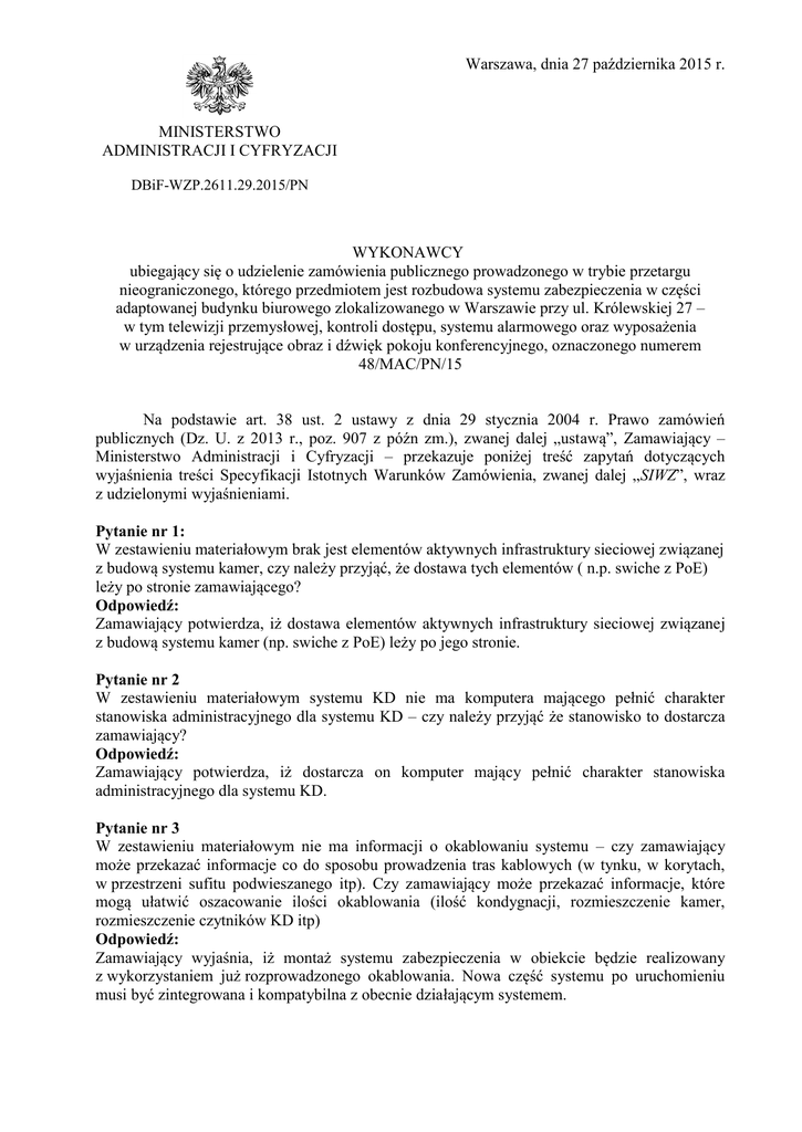 Warszawa, dnia 27 października 2015 r. MINISTERSTWO ADMINISTRACJI I CYFRYZACJI DBiF-WZP.2611.29.2015/PN WYKONAWCY ubiegający się o udzielenie zamówienia publicznego prowadzonego w trybie przetargu nieograniczonego, którego przedmiotem jest rozbudowa systemu zabezpieczenia w części adaptowanej budynku biurowego zlokalizowanego w Warszawie przy ul. Królewskiej 27 – w tym telewizji przemysłowej, kontroli dostępu, systemu alarmowego oraz wyposażenia w urządzenia rejestrujące obraz i dźwięk pokoju konferencyjnego, oznaczonego numerem 48/MAC/PN/15 Na podstawie art. 38 ust. 2 ustawy z dnia 29 stycznia 2004 r. Prawo zamówień publicznych (Dz. U. z 2013 r., poz. 907 z późn zm.), zwanej dalej „ustawą”, Zamawiający – Ministerstwo Administracji i Cyfryzacji – przekazuje poniżej treść zapytań dotyczących wyjaśnienia treści Specyfikacji Istotnych Warunków Zamówienia, zwanej dalej „SIWZ”, wraz z udzielonymi wyjaśnieniami. Pytanie nr 1: W zestawieniu materiałowym brak jest elementów aktywnych infrastruktury sieciowej związanej z budową systemu kamer, czy należy przyjąć, że dostawa tych elementów ( n.p. swiche z PoE) leży po stronie zamawiającego? Odpowiedź: Zamawiający potwierdza, iż dostawa elementów aktywnych infrastruktury sieciowej związanej z budową systemu kamer (np. swiche z PoE) leży po jego stronie. Pytanie nr 2 W zestawieniu materiałowym systemu KD nie ma komputera mającego pełnić charakter stanowiska administracyjnego dla systemu KD – czy należy przyjąć że stanowisko to dostarcza zamawiający? Odpowiedź: Zamawiający potwierdza, iż dostarcza on komputer mający pełnić charakter stanowiska administracyjnego dla systemu KD. Pytanie nr 3 W zestawieniu materiałowym nie ma informacji o okablowaniu systemu – czy zamawiający może przekazać informacje co do sposobu prowadzenia tras kablowych (w tynku, w korytach, w przestrzeni sufitu podwieszanego itp). Czy zamawiający może przekazać informacje, które mogą ułatwić oszacowanie ilości okablowania (ilość kondygnacji, rozmieszczenie kamer, rozmieszczenie czytników KD itp) Odpowiedź: Zamawiający wyjaśnia, iż montaż systemu zabezpieczenia w obiekcie będzie realizowany z wykorzystaniem już rozprowadzonego okablowania. Nowa część systemu po uruchomieniu musi być zintegrowana i kompatybilna z obecnie działającym systemem. Pytanie nr 4 W związku z uruchomieniem postępowania o udzielenie zamówienia publicznego nr 48/MAC/PN/15, na rozbudowę systemu zabezpieczenia w części adaptowanej budynku biurowego zlokalizowanego w Warszawie przy ul. Królewskiej 27 – w tym telewizji przemysłowej, kontroli dostępu, systemu alarmowego oraz wyposażenia w urządzenia rejestrujące obraz i dźwięk pokoju konferencyjnego, zwracam się z wnioskiem o umożliwienie dokonania wizji lokalnej pomieszczeń objętych przedmiotem zamówienia. Powyższe wynika z faktu, iż zamówienie dotyczy nie tylko dostawy urządzeń, ale także ich instalacji (z robotami budowlanymi), integracji i uruchomienia a nie dostarczyliście Państwo projektów. Brak ten uniemożliwia przygotowanie konkurencyjnej oferty i jednocześnie preferuje potencjalnego wykonawcę który zna tą lokalizację – proponuję termin wizji 28.10.br. Wnoszę jednocześnie o zmianę terminu składania ofert o czas niezbędny do przygotowania tejże oferty z uwzględnieniem informacji pozyskanych podczas przeprowadzonej wizji lokalnej. Odpowiedź: Zamawiający nie dopuszcza wizji lokalnej w adaptowanej części budynku biurowego zlokalizowanego w Warszawie przy ul. Królewskiej 27. Montaż systemu zabezpieczenia w obiekcie będzie realizowany z wykorzystaniem już rozprowadzonego okablowania. Instalacja systemu zabezpieczenia będzie odbywała się etapami i będzie rozciągnięta w czasie, zatem Wykonawca będzie miał odpowiednią ilość czasu na zapoznanie się z parametrami obiektu. Ponadto, Zamawiający dokonuje na podstawie art. 38 ust. 4 ustawy, zmiany zapisów Rozdziału XIV pkt 2.2. SIWZ poprzez zastąpienie zapisów „2.2 Sposób obliczenia punktów w odniesieniu do kryterium ,,rozdzielczość kamer” (R) Przez kryterium „rozdzielczość kamer” Zamawiający rozumie rozdzielczość kamer wyrażoną wartością Mpx wskazaną przez Wykonawcę w Formularzu ofertowym. Zamawiający przyzna punkty w przedmiotowym kryterium w następujący sposób: kamera o rozdzielczości 2 Mpx – 0 pkt Kamera o rozdzielczości większej niż 2 Mpx, a mniejszej niż 3 Mpx – 3 pkt Kamera o rozdzielczości 3 Mpx lub większej, a mniejszej niż 5 Mpx – 7 pkt Kamera o rozdzielczości 5 Mpx i więcej – 10 pkt W przypadku, gdy Wykonawca w Formularzu ofertowym nie wskaże liczby Mpx lub wskazana liczba będzie mniejsza niż 2 Mpx, wówczas jego oferta zostanie odrzucona.” na „2.2 Sposób obliczenia punktów w odniesieniu do kryterium ,,rozdzielczość kamer” (R) Przez kryterium „rozdzielczość kamer” Zamawiający rozumie rozdzielczość kamer wyrażoną wartością Mpx wskazaną przez Wykonawcę w Formularzu ofertowym. Zamawiający przyzna punkty w przedmiotowym kryterium w następujący sposób: Kamera o rozdzielczości 2 Mpx – 0 pkt Kamera o rozdzielczości większej niż 2 Mpx, a mniejszej niż 3 Mpx – 5 pkt Kamera o rozdzielczości 3 Mpx lub większej– 10 pkt W przypadku, gdy Wykonawca w Formularzu ofertowym nie wskaże liczby Mpx lub wskazana liczba będzie mniejsza niż 2 Mpx, wówczas jego oferta zostanie odrzucona.” Z uwagi na zmianę sposobu obliczania punktów w odniesieniu do kryterium „rozdzielczość kamer” oraz uwzględniając czas niezbędny do przygotowania ofert, Zamawiający dokonuje zmiany terminu: 1) składania ofert z dnia 29.10.2015 r. godz. 11:00 na dzień 02.11.2015 r. godz. 11:00. 2) otwarcia ofert z dnia 29.10.2015 r. godz. 11:30 na dzień 02.11.2015 r. godz. 11:30. Miejsce składania i otwarcia ofert pozostaje bez zmian. Strona 2 z 2