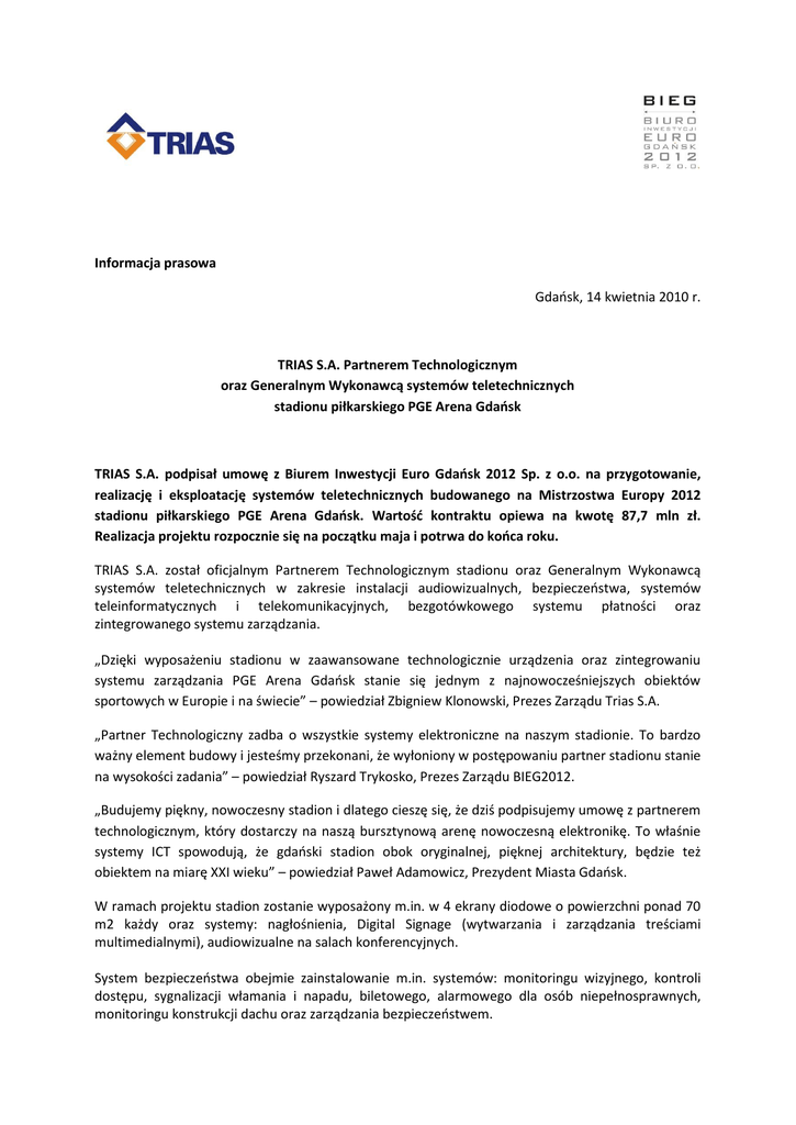 Informacja prasowa Gdaosk, 14 kwietnia 2010 r. TRIAS S.A. Partnerem Technologicznym oraz Generalnym Wykonawcą systemów teletechnicznych stadionu piłkarskiego PGE Arena Gdaosk TRIAS S.A. podpisał umowę z Biurem Inwestycji Euro Gdaosk 2012 Sp. z o.o. na przygotowanie, realizację i eksploatację systemów teletechnicznych budowanego na Mistrzostwa Europy 2012 stadionu piłkarskiego PGE Arena Gdaosk. Wartośd kontraktu opiewa na kwotę 87,7 mln zł. Realizacja projektu rozpocznie się na początku maja i potrwa do kooca roku. TRIAS S.A. został oficjalnym Partnerem Technologicznym stadionu oraz Generalnym Wykonawcą systemów teletechnicznych w zakresie instalacji audiowizualnych, bezpieczeostwa, systemów teleinformatycznych i telekomunikacyjnych, bezgotówkowego systemu płatności oraz zintegrowanego systemu zarządzania. „Dzięki wyposażeniu stadionu w zaawansowane technologicznie urządzenia oraz zintegrowaniu systemu zarządzania PGE Arena Gdaosk stanie się jednym z najnowocześniejszych obiektów sportowych w Europie i na świecie” – powiedział Zbigniew Klonowski, Prezes Zarządu Trias S.A. „Partner Technologiczny zadba o wszystkie systemy elektroniczne na naszym stadionie. To bardzo ważny element budowy i jesteśmy przekonani, że wyłoniony w postępowaniu partner stadionu stanie na wysokości zadania” – powiedział Ryszard Trykosko, Prezes Zarządu BIEG2012. „Budujemy piękny, nowoczesny stadion i dlatego cieszę się, że dziś podpisujemy umowę z partnerem technologicznym, który dostarczy na naszą bursztynową arenę nowoczesną elektronikę. To właśnie systemy ICT spowodują, że gdaoski stadion obok oryginalnej, pięknej architektury, będzie też obiektem na miarę XXI wieku” – powiedział Paweł Adamowicz, Prezydent Miasta Gdaosk. W ramach projektu stadion zostanie wyposażony m.in. w 4 ekrany diodowe o powierzchni ponad 70 m2 każdy oraz systemy: nagłośnienia, Digital Signage (wytwarzania i zarządzania treściami multimedialnymi), audiowizualne na salach konferencyjnych. System bezpieczeostwa obejmie zainstalowanie m.in. systemów: monitoringu wizyjnego, kontroli dostępu, sygnalizacji włamania i napadu, biletowego, alarmowego dla osób niepełnosprawnych, monitoringu konstrukcji dachu oraz zarządzania bezpieczeostwem. Instalacje teleinformatyczne i telekomunikacyjne obejmą m.in.: infrastrukturę sieci LAN, węzły Centrum Przetwarzania Danych, infrastrukturę dostępu bezprzewodowego WLAN, system zarządzania urządzeniami sieciowymi, system komunikacji głosowej, wideo oraz call center. Dodatkowo umowa obejmuje zaprojektowanie i wykonanie systemu zegara centralnego, systemu do realizacji przekazu TV z wydarzeo na stadionie, systemów teletechnicznych na zewnątrz obiektu (wyposażenie toru wrotkarskiego, nagłośnienie wokół stadionu oraz oświetlenie specjalne). Wdrożone zostaną również systemy: zarządzania nieruchomością (Facility Management) oraz parkingowy. „Wygranie przetargu na tak prestiżowy projekt, to dla nas wielkie wyzwanie. Przy jego realizacji wykorzystamy zdobywane przez lata doświadczenie. Chcąc zapewnid najwyższą jakośd usług do współpracy zaprosiliśmy kompetentnych podwykonawców i dostawców. Jednym z największych jest Siemens Sp. z o.o.” – dodał Zbigniew Klonowski, Prezes Zarządu Trias S.A. *** TRIAS S.A. TRIAS S.A. to firma z ponad 10-cio letnim doświadczeniem na rynku multimediów. Spółka jest liderem w branży Event Engineering i Audio Video Integration. Firma zajmuje się dostarczaniem kompleksowych rozwiązao z zakresu multimediów i oświetlenia oraz tworzeniem i integracją systemów teletechnicznych. Działania Event Engineering obejmują multimedialno-oświetleniową obsługę wydarzeo o różnym rozmiarze i charakterze, takich jak: uroczystości paostwowe i religijne, wydarzenia sportowe, festiwale, koncerty, produkcje telewizyjne, imprezy korporacyjne, itp. Firma dostarczała rozwiązania do oprawy m.in. takich wydarzeo jak: festiwale piosenki w Opolu i Sopocie, Top Trendy, Przystanek Woodstock, Gala Telekamer, Fryderyków, Wiktorów i Złotych Kaczek, pielgrzymki Jana Pawła II w Polsce i na Ukrainie, Puchar Świata w skokach narciarskich w Zakopanem. Zapewniliśmy też kompleksową obsługę multimedialną polskim pawilonom na Targach EXPO w Hanowerze, Aichi w Japonii oraz w Saragossie w Hiszpanii. W ramach Audio Video Integration firma tworzy i integruje systemy teletechniczne w zakresie stałych instalacji audiowizualnych, systemów bezpieczeostwa, teleinformatycznych, telekomunikacyjnych, bezgotówkowych systemów płatności oraz systemu zarządzania obiektem. Flagowym projektem firmy z dziedziny AV Integration jest przygotowywany na Mistrzostwa Europy w piłce nożnej EURO 2012 stadion PGE Arena Gdaosk. Wcześniejsze realizacje firmy w branży stałych instalacji audiowizualnych znajdują się w obiektach sportowych, halach koncertowych, centrach handlowych i targowych, studiach telewizyjnych i produkcyjnych, centrach konferencyjno-szkoleniowych oraz sieciach reklamowych, m.in.: na Giełdzie Papierów Wartościowych, w Pałacu Prezydenckim, Muzeum Powstania Warszawskiego, na Uniwersytecie Mikołaja Kopernika i w Centrum Sztuki Współczesnej w Toruniu, na Akademii Medycznej w Warszawie, w Hali Sportowej Arena Łódź, a także Hali Widowiskowo-Sportowej „Spodek”, gdzie odbywały się np. Mistrzostwa Europy w Koszykówce Mężczyzn EuroBasket 2009 oraz Mistrzostwa Europy Kobiet w Siatkówce. BIEG 2012 Spółka Biuro Inwestycji Euro Gdaosk 2012 Sp. z o.o. została zawiązana przez Prezydenta Miasta Gdaoska w dniu 23 października 2007r. Spółka ta jest spółką celową w rozumieniu ustawy z dnia 7 września 2007r. o przygotowaniu finałowego turnieju Mistrzostw Europy w Piłce Nożnej UEFA EURO 2012 (Dz. U. z 2007r. nr 173 poz. 1219). Przedmiotem jej działania jest przygotowanie, koordynowanie i realizacja budowy stadionu piłkarskiego w Gdaosku. Główną intenc