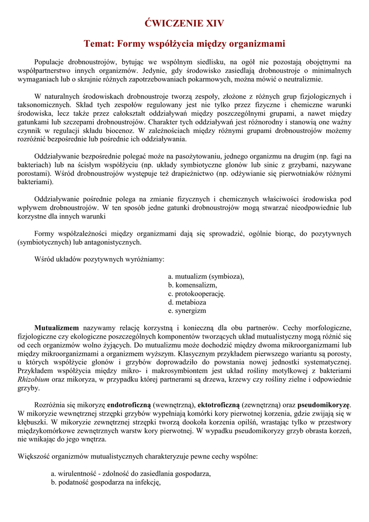 ĆWICZENIE XIV Temat: Formy współżycia między organizmami