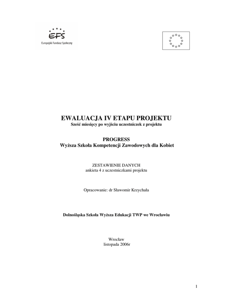 EWALUACJA IV ETAPU PROJEKTU Sześć miesięcy po wyjściu uczestniczek z projektu PROGRESS Wyższa Szkoła Kompetencji Zawodowych dla Kobiet ZESTAWIENIE DANYCH ankieta 4 z uczestniczkami projektu Opracowanie: dr Sławomir Krzychała Dolnośląska Szkoła Wyższa Edukacji TWP we Wrocławiu Wrocław listopada 2006r 1 1 Uwagi wstępne Analiza efektów projektu PROGRESS opracowana została na podstawie standaryzowanej ankiety telefonicznej, przeprowadzonej w listopadzie 2006 roku. Wywiad przeprowadzono z 56 uczestniczkami projektu, pytając je o: Podjęcie pracy lub samozatrudnienia Miejsce pracy i stanowisko Podjęcie kształcenia (studia, szkolenia) Podjęcie wolontariatu lub działalności w organizacji pozarządowej Plany (zawodowe) na najbliższą przyszłość Ocenę projektu PROGRESS z perspektywy czasu • • • • • • Grupę kobiet uczestniczących w badaniach ewaluacyjnych telefonicznych można w zasadzie traktować jako reprezentatywną dla wszystkich uczestniczek projektu, jej struktura statusu zarejestrowania w powiatowym urzędzie pracy przed podjęciem projektu (por. Tabela 1) oraz procentowy udział osób studiujących (por. Tabela 2) są zbliżone do danych dla całej grupy. Te warunki brzegowe uzasadniają zatem procentowe uogólnienie danych uzyskanych w badaniu telefonicznym. Tabela 1: Status zarejestrowania w PUP uczestniczki badania telefonicznego wszystkie uczestniczki projektu 9,26% 5,10% 37,04% 42,86% 3 nie zarejestrowana 29,63% 28,57% 4 bezrobotna (mniej ni 12 miesięcy) 24,07% 23,47% uczestniczki badania telefonicznego wszystkie uczestniczki projektu zarejestrowane w Powiatowym Urzędzie Pracy 1 poszukująca pracy 2 długotrwale bezrobotna (powyżej 12 miesięcy) Tabela 2: Odsetek osób studiujących studentki studiów zaocznych 1 nie 70,91% 67,33% 2 tak 29,09% 32,67% 2 2. Podjęcie pracy lub samozatrudnienia 41,8% uczestniczek projektu PROGRESS podjęło pracę lub jakąkolwiek formę samozatrudnienia po ukończeniu projektu PROGRESS (por. Tabela 3). Najwięcej osób podejmujących pracę, to osoby nie zarejestrowane w PUP, w tym głównie studentki – dwie trzecie kobiet studiujących zaocznie podjęło prace (por. Tabela 4). Wnioskować możemy, ze doświadczenia i umiejętności wyniesione z projektu PROGRESS pozwalają tym osobom nie tylko szybciej i skuteczniej poszukiwać pracy, ale również sprawniej łączyć edukację akademicką z pracą zawodową. Wskazać możemy również na inną grupę beneficjentek projektu: 45% osób długotrwale bezrobotnych znalazło pracę po ukończeniu projektu PROGRESS i jest to odsetek nieco wyższy, aniżeli średnia dla całej grupy, w tym również osób aktywnie poszukujących pracy już przed rozpoczęciem projektu (40%). Osoby, które najdłużej pozostawały w stanie bezrobocia, zdołały przełamać bariery bezradności, jaka charakteryzuje wiele osób długotrwale bezrobotnych, podjęły skuteczna próbę podjęcia pracy zawodowej. Uzyskany efekt nie może być tłumaczony jedynie zmianami strukturalnymi rynku pracy, gdyż według danych Dolnośląskiego Wojewódzkiego Urzędu Pracy, w okresie 09.2005-09.2006 tylko 19,2% długotrwale bezrobotnych zostało wyrejestrowanych z PUP (dane MPiPS-1 źródło: www.dwup.pl). Uzyskany efekt 45% łączy się jednoznacznie ze skutecznością projektu PROGRESS, nie tylko w efektywnym poszukiwaniu pracy, ale również w pobudzaniu przygaszonej gotowości do wyjścia z bezrobocia i przyjęcia postawy aktywnego poszukiwania pracy. Tabela 3: Status zarejestrowania w PUP osób podejmujących pracę. zarejestrowane w Powiatowym Urzędzie Pracy podjęcie pracy lub samozatrudnienia poszukująca pracy 40,00% długotrwale bezrobotna (powyżej 12 miesięcy) 45,00% nie zarejestrowana 50,00% bezrobotna (mniej niż 12 miesięcy) 23,08% wszystkie osoby 41, 82% 3 Tabela 4: Studentki podejmujące pracę zawodową studentki studiów zaocznych podjęcie pracy lub samozatrudnienia nie 33,33% tak 62,50% wszystkie osoby 41,82% Zastanawiać może nas stosunkowo niski wskaźnik zatrudnienia osób z krótkotrwałym doświadczeniem bezrobocia (23% - jest to i tak wskaźnik wyższy od danych dla kobiet bezrobotnych z województwa dolnośląskiego, których liczba bezrobotnych w skali roku zmniejsza się o 13,3%; dane MPiPS-1). Wynikać może to po części z przyczyn pozazawodowych lub ze świadomego oczekiwania na rozpoczęcie działalności gospodarczej lub podjęcie zatrudnienia w późniejszym czasie, które podają osoby badane z tej grupy w opisie swoich planów zawodowych: • • • • • • • • • • • • aplikacje do nowopowstałych zakładów pracy w strefie ekonomicznej brak planów kurs komputerowy, praca otwarcie na wiosnę własnego zakładu krawieckiego, sklepu nieokreślone od stycznia 2007 poszukiwanie pracy w kierunku pedagog szkolny, staż związany z edukacją praca po studiach praca w handlu, kurs z audytu energetycznego praca w przyszłym roku praca w zawodzie realizacja stażu, ukończenie studiów rekonwalescencja po chorobie Przytoczmy tu również pozostałe wypowiedzi odnośnie planów, w tym również planów zawodowych, osób jeszcze nie zatrudnionych: • • • • • • • • • • • • działalność gospodarcza w przyszłym roku dziecko podjęcie działalności gospodarczej - reklama podjęcie pracy (7 osób) podjęcie pracy na cały etat podjęcie pracy na umowę o pracę podjęcie pracy w administracji państwowej, pisanie projektów podjęcie pracy w kwiaciarni, ewentualnie założenie własnej działalności gospodarczej poszukiwanie pracy rozwijanie się w resocjalizacji praca w służbach mundurowych- wojsku, straży granicznej studia podyplomowe, praca 4 • • • • w 2007r. kurs projektowania wnętrz, założenie działalności złożenie aplikacji - praca biurowa utrzymanie się na stanowisku obecnym, rozwój zawodowy zrobienie czegoś konkretnego, obrona Przedstawione wypowiedzi zawierają albo skonkretyzowane kierunki poszu