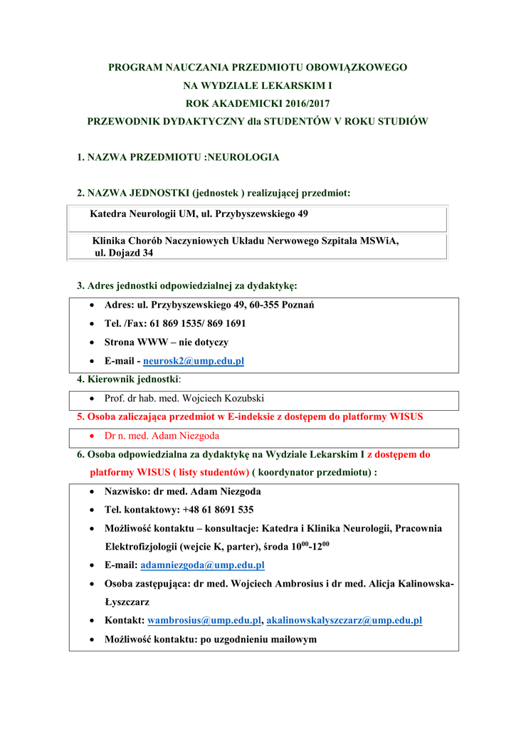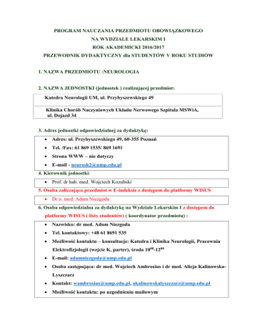 PROGRAM NAUCZANIA PRZEDMIOTU OBOWIĄZKOWEGO NA WYDZIALE LEKARSKIM I ROK AKADEMICKI 2016/2017 PRZEWODNIK DYDAKTYCZNY dla STUDENTÓW V ROKU STUDIÓW 1. NAZWA PRZEDMIOTU :NEUROLOGIA 2. NAZWA JEDNOSTKI (jednostek ) realizującej przedmiot: Katedra Neurologii UM, ul. Przybyszewskiego 49 Klinika Chorób Naczyniowych Układu Nerwowego Szpitala MSWiA, ul. Dojazd 34 3. Adres jednostki odpowiedzialnej za dydaktykę: Adres: ul. Przybyszewskiego 49, 60-355 Poznań Tel. /Fax: 61 869 1535/ 869 1691 Strona WWW – nie dotyczy E-mail - [email protected] 4. Kierownik jednostki: Prof. dr hab. med. Wojciech Kozubski 5. Osoba zaliczająca przedmiot w E-indeksie z dostępem do platformy WISUS Dr n. med. Adam Niezgoda 6. Osoba odpowiedzialna za dydaktykę na Wydziale Lekarskim I z dostępem do platformy WISUS ( listy studentów) ( koordynator przedmiotu) : Nazwisko: dr med. Adam Niezgoda Tel. kontaktowy: +48 61 8691 535 Możliwość kontaktu – konsultacje: Katedra i Klinika Neurologii, Pracownia Elektrofizjologii (wejcie K, parter), środa 1000-1200 E-mail: [email protected] Osoba zastępująca: dr med. Wojciech Ambrosius i dr med. Alicja KalinowskaŁyszczarz Kontakt: [email protected], [email protected] Możliwość kontaktu: po uzgodnieniu mailowym 7. Miejsce przedmiotu w programie studiów: Rok: V Semestr: zimowy i letni 8. Liczba godzin ogółem : 95 liczba pkt.ECTS: 8 Semestr zimowy/letni liczba godzin Jednostki uczestniczące w nauczaniu przedmiotu W Ć Ćwiczenia kategoria S Katedra Neurologii UM, ul. Przybyszewskiego 49 30 43 C 15 Klinika Chorób Naczyniowych Układu Nerwowego Szpitala MSWiA 0 7 C 0 Razem: 30 50 C 15 9. SYLABUS SYLABUS Nazwa przedmiotu/modułu Wydział Nazwa kierunku studiów Poziom kształcenia Forma studiów Język przedmiotu Neurologia Lekarski I LEKARSKI wyższy magisterski dzienne stacjonarne Polski obowiązkowy √ Rodzaj przedmiotu fakultatywny 1 2 3 4 5 6 7 8 9√ 10 √ 11 12 Rok studiów/semestr I II III IV V √ VI Liczba godzin zajęć dydaktycznych z podziałem na formy prowadzenia zajęć 95, w tym: Założenia i cele przedmiotu Na zakończenie kursu student powinien posiadać następujące umiejętności: 1. Ocena skarg neurologicznych pacjenta poprzez zebranie wywiadu oraz wykonanie badania neurologicznego. 2. Zrozumienie patofizjologii podstawowych schorzeń neurologicznych oraz zastosowanie tej wiedzy w kontekście diagnostyki i leczenia pacjentów. 3. Lokalizacja anatomiczna objawów neurologicznych i przeprowadzenie diagnostyki różnicowej. 4. Zastosowanie adekwatnych narzędzi diagnostycznych w ocenie typowych objawów i skarg neurologicznych . 5. Leczenie typowych chorób neurologicznych, w szczególności stanów nagłych. 30- wykłady, 15 - seminaria, 50– ćwiczenia, .... – fakultety Symbol efektów kształcenia zgodnie ze standardami OPIS KIERUNKOWYCH EFEKTÓW KSZTAŁCENIA 1. 2. 2. E.W1 3. EW14 3. a) b) c) d) e) f) g) h) i) j) 1. E.U1. 2. E.U3. 3. E.U7. 4. E.U12 5. E.U14. 6. E.U16. 7. E.U16. 8. E.U20. 9. EU21. 10. E.U24. 11. EU38. WIEDZA (ZGODNIE ZE SZCZEGÓŁOWYMI EFEKTAMI KSZTAŁCENIA) Znajomość anatomii, fizjologii i patofizjologii układu nerwowego. Znajomość epidemiologii oraz środowiskowych czynników ryzyka najczęstszych schorzeń neurologicznych. Znajomość przyczyn, objawów, procesu diagnostycznego oraz terapeutycznego podstawowych schorzeń układu nerwowego, w tym: Bóle głowy: migrena, bóle głowy typu napięciowego, bóle trójdzielnoautonomiczne, neuralgia trójdzielna oraz nerwu językowo-gardłowego Choroby naczyniowe ośrodkowego układu nerwowego (OUN): udar niedokrwienny i krwotoczny mózgu, krwotok podpajęczynówkowy. Padaczka. Neuroinfekcje: zapalenie opon mózgowo-rdzeniowych, neuroborelioza, kiła OUN, choroby prionowe, herpetyczne zapalenie mózgu. Choroby demielinizacyjne OUN: stwardnienie rozsiane oraz choroba Devica. Zaburzenia ruchowe: zespół parkinosnowski (szczególnie choroba Parkinsona), pląsawica Huntingtona, choroba Wilsona, drżenie samoistne, dystonie. Otępienia: choroba Alzheimera, otępienie czołowo-skroniowe, otępienie z ciałami Lewy’ego, otępienie naczyniopochodne. Chorby układu nerwowo-mięśniowego: polineuropatie (w tym zespół Guillain-Barre, CIDP, MMN), miastenia, zespół miasteniczny, miopatie, dystrofie mięśniowe. Zespoły z uwięźnięcia: rwa kulszowa i ramienna. Stwardnienie zanikowe boczne jako choroba neuronu ruchowego. UMIEJĘTNOŚCI (ZGODNIE ZE SZCZEGÓŁOWYMI EFEKTAMI KSZTAŁCENIA) 1. Przeprowadzenie badania podmiotowego u dorosłego pacjenta z objawami/skargami neurologicznymi. 2. Przeprowadzenie badania neurologicznego dorosłego pacjenta. 3. Ocena ogólnego stanu pacjenta, w tym stanu świadomości (m. in. przy użyciu skali Glasgow). 4. Postawienie rozpoznania wstępnego/lokalizacyjnego i przeprowadzenie diagnostyki różnicowej w typowych schorzeniach neurologicznych osób dorosłych. 5. Rozpoznanie schorzeń neurologicznych stanowiących bezpośrednie zagrożenie życia. 6. Zaplanowanie adekwatnych badań diagnostycznych celem potwierdzenia typowych schorzeń neurologicznych. 7. Zaplanowanie schematu leczenia oraz profilaktyki typowych schorzeń neurologicznych. 8. Kwalifikacja pacjenta do leczenia szpitalnego/ambulatoryjnego w zależności od objawów neurologicznych. 9. Określenie rokowania w chorobach układu nerwowego. 10. Interpretacja podstawowych badań laboratoryjnych (np. badanie płynu mózgowo-rdzeniowego), neuroobrazowych ( tomografia komputerowa, rezonans magnetyczny głowy i rdzenia kręgowego) i neuroelektrofizjologicznych (EEG, ENG, EMG), ultrasonograficznych (usg tętnic szyjnych i kręgowych) w kontekście chorób układu nerwowego. 11. Prowadzenie podstawowej dokumentacji medycznej pacjenta neurologicznego (historia choroby). Metody weryfikacji osiągnięcia zamierzonych efektów kształcenia: Weryfikacja ustna w czasie seminariów i ćwiczeń, w kontekście konkretnych przypadków klinicznych Zaliczenie końcowe ćwiczeń (praktyczne), seminariów