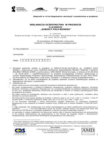 Załącznik nr 14 do Regulaminu rekrutacji i uczestnictwa w projekcie DEKLARACJA UCZESTNICTWA W PROJEKCIE w projekcie „KOBIECY PULS BIZNESU” w ramach Regionalnego Programu Operacyjnego Województwa Podkarpackiego na lata 2014-2020 Oś priorytetowa VII Regionalny rynek pracy Działanie 7.3 Wsparcie rozwoju przedsiębiorczości Ja niżej podpisana zamieszkała ………………………………………………………………………………….………………..…… (imię i nazwisko) …………………………………….………………………………………………………………..……… (adres zamieszkania) PESEL 1. Wyrażam gotowość udziału w projekcie nr RPPK.07.03.00-18-0128/15, pt. „KOBIECY PULS BIZNSU”, realizowanym przez CENTRUM DORADCZO SZKOLENIOWE PROJEKT MARIUSZ I DOROTA GOLIŃSCY SPÓŁKA JAWNA w partnerstwie z AMD GROUP Michał Drymajło, w okresie od 01.09.2016 r. do 30.05.2018 r., współfinansowanym ze środków Europejskiego Funduszu Społecznego w ramach Regionalnego Programu Operacyjnego Województwa Podkarpackiego na lata 2014–2020, Oś Priorytetowa VII Regionalny rynek pracy, Działanie 7.3 Wsparcie rozwoju przedsiębiorczości. 2. Oświadczam, że na dzień przystąpienia do projektu spełniam kryteria kwalifikacyjne zawarte w Regulaminie rekrutacji i uczestnictwa 3. Oświadczam że:        Jestem osobą fizyczną zamierzającą rozpocząć prowadzenie działalności gospodarczej, Nie byłam zarejestrowana w Ewidencji Działalności Gospodarczej, Krajowym Rejestrze Sądowym, Centralnej Ewidencji i Informacji o Działalności Gospodarczej i nie prowadzę działalności na podstawie odrębnych przepisów (w tym m.in. działalność adwokacką, komorniczą lub oświatową) w okresie 12 miesięcy poprzedzających dzień przystąpienia do projektu Nie byłam karana za przestępstwo skarbowe oraz korzystam w pełni z praw publicznych i posiadam pełną zdolność do czynności prawnych, Nie byłam karana karą zakazu dostępu do środków, o których mowa w art. 5 ust. 3 pkt 1 i 4 ustawy z dnia 27 sierpnia 2009 r. o finansach publicznych (dalej „ufp”) (Dz. U. Nr 157, poz. 1240, z późn. zm.) 1 że nie korzystam równolegle z innych bezzwrotnych środków publicznych na rozpoczęcie działalności gospodarczej w tym zwłaszcza ze środków Funduszu Pracy, PFRON oraz w ramach Działania 7.3 RPO WP 20142020, w ciągu bieżącego roku podatkowego oraz dwóch poprzedzających go latach podatkowych otrzymałem(am) w wysokości ……………….. / nie otrzymałem(am) pomoc de minimis. Wartość pomocy nie przekroczyła kwoty 200 000 euro lub 100 000 euro w przypadku działalność w sektorze transportu drogowego towarów2. nie pozostaje w związku małżeńskim lub faktycznym pożyciu albo w stosunku pokrewieństwa lub powinowactwa w linii prostej, pokrewieństwa lub powinowactwa w linii bocznej do drugiego stopnia z Beneficjentem (Projektodawcą), i/lub pracownikiem Beneficjenta (projektodawcy) lub wykonawcy. 1 Kara zakazu dostępu do w/w środków została uregulowana w art. 12 ust.1 pkt 1 ustawy z dnia 15 czerwca 2012 r. o skutkach powierzenia wykonywania pracy cudzoziemcom przebywającym wbrew przepisom na terytorium Rzeczypospolitej Polskiej (Dz. U. z dnia 6 lipca 2012 r. , poz.769). 2 W przypadku otrzymania pomocy publicznej należy dołączyć odpowiednie zaświadczenie z instytucji, która jej udzieliła. Biuro projektu: ul. Piłsudskiego 34, 35-001 Rzeszów (C.H. EUROPA II - 4 piętro) tel.: 17 779 01 88, e-mail: [email protected] www.cdsprojekt.pl, www.amd-group.pl 1                  nie łączył i nie łączy mnie z Beneficjentem (Projektodawcą), i/lub pracownikiem Beneficjenta (projektodawcy), lub wykonawcy związek z tytułu przysposobienia, opieki lub kurateli. nie pozostaję /nie pozostawałam w ciągu ostatnich dwóch lat w stosunku pracy lub innym (umowa zlecenie, umowa o dzieło lub inne) z Beneficjentem, Partnerem Beneficjenta lub wykonawcą, nie zamierzam rozpocząć działalności gospodarczej prowadzonej wcześniej przez członka rodziny3 z wykorzystaniem zasobów materialnych (pomieszczenia, sprzęt itp.) stanowiących zaplecze dla tej działalności, w przypadku gdy członek rodziny zaprzestał prowadzenia działalności gospodarczej nie później niż miesiąc przed dniem złożenia przeze mnie Formularza rekrutacyjnego` nie zamierzam prowadzić działalności gospodarczej jednocześnie o tym samym profilu co przedsiębiorstwo prowadzone przez członka mojej rodziny i pod tym samym adresem, z wykorzystaniem pomieszczeń w których jest prowadzona działalność. w przypadku rozpoczęcia przeze mnie działalności gospodarczej będzie ona zarejestrowana na terenie województwa podkarpackiego przez min. 12 mc. i prowadzona zgodnie z definicją określoną w art. 2 Ustawy z dnia 2 lipca 2004r. o swobodzie działalności gospodarczej (Dz. U. z 2010r. Nr 220, poz. 1447 z późn. zm.). nie jestem w stanie faktycznie rozpocząć prowadzenia działalności gospodarczej bez uzyskania wsparcia ze środków Europejskiego Funduszu Społecznego zostałam poinformowana, że projekt jest współfinansowany ze środków Unii Europejskiej w ramach Europejskiego Funduszu Społecznego, zobowiązuję się do udziału w badaniach ankietowych związanych z realizacją projektu w jego trakcie i po zakończeniu wyrażam dobrowolną zgodę na gromadzenie, przetwarzanie i przekazywanie moich danych osobowych zawartych w niniejszym formularzu (zgodnie z Ustawą z dnia 29 sierpnia 1997 r. o ochronie danych osobowych Dz. U. z 2014 r., POZ. 1182 z późniejszymi zmianami) do celów związanych z przeprowadzeniem rekrutacji, szkolenia, monitoringu i ewaluacji projektu, a także w zakresie niezbędnym do wywiązania się Beneficjenta projektu z obowiązków sprawozdawczych wobec Wojewódzkiego Urzędu Pracy w Rzeszowie. Moja zgoda obejmuje również przetwarzanie danych w przyszłości, pod warunkiem, że nie zostanie zmieniony cel