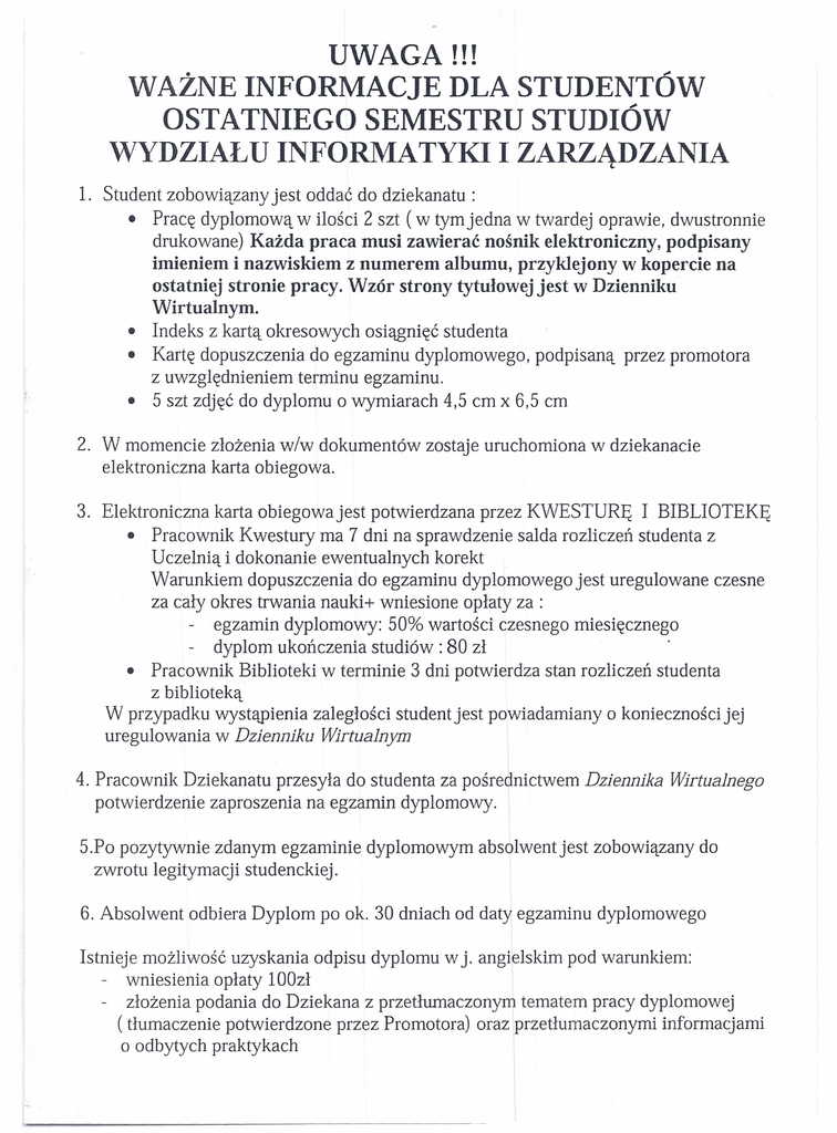 UWAGA !!! WAŻNE INFORMACJE DLA STUDENTÓW OSTATNIEGO SEMESTRU STUDIÓW WYDZIAŁU INFORMATYKI I ZARZĄDZANIA 1. Student zobowiązany jest oddać do dziekanatu: • Pracę dyplomową w ilości 2 szt (w tymjedna w twardej oprawie, dwustronnie drukowane) Każda praca musi zawierać nośnik elektroniczny, podpisany imieniem i nazwiskiem z numerem albumu, przyklejony w kopercie na ostatniej stronie pracy. Wzór strony tytułowej jest w Dzienniku Wirtualnym. • • Indeks z kartą okresowych osiągnięć studenta Kartę dopuszczenia do egzaminu dyplomowego', podpisaną z uwzględnieniem terminu egzaminu. • 5 szt zdjęć do dyplomu o wymiarach 4,5 cm x 6,5 cm przez promotora 2. W momencie złożenia w/w dokumentów zostaje uruchomiona w dziekanacie elektroniczna karta obiegowa. 3. Elektroniczna karta obiegowajest potwierdzana przez KWESTURĘ I BIBLIOTEKĘ • Pracownik Kwestury ma 7 dni na sprawdzenie salda rozliczeń studenta z Uczelnią i dokonanie ewentualnych korekt Warunkiem dopuszczenia do egzaminu dyplomowego jest uregulowane czesne za cały okres trwania nauki+ wniesione opłaty za : - egzamin dyplomowy: 50% wartości czesnego miesięcznego - dyplom ukończenia studiów: 80 zł . • Pracownik Biblioteki w terminie 3 dni potwierdza stan rozliczeń studenta z biblioteką W przypadku wystąpienia zaległości student jest powiadamiany o konieczności jej uregulowania w Dzienniku Wirtualnym 4. Pracownik Dziekanatu przesyła do studenta za pośrednictwem Dziennika Wirtualnego potwierdzenie zaproszenia na egzamin dyplomowy. 5.Po pozytywnie zdanym egzaminie dyplomowym absolwent jest zobowiązany do zwrotu legitymacji studenckiej. 6. Absolwent odbiera Dyplom po ok. 30 dniach od daty egzaminu dyplomowego Istnieje możliwość uzyskania odpisu dyplomu w j. angielskim pod warunkiem: - wniesienia opłaty 100zł - złożenia podania do Dziekana z przetłwnaczonym tematem pracy dyplomowej ( tłumaczenie potwierdzone przez Promotora) oraz przetłumaczonymi informacjami o odbytych praktykach
