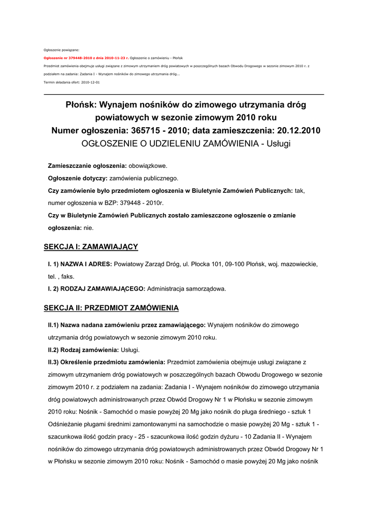 Ogłoszenie powiązane: Ogłoszenie nr 379448-2010 z dnia 2010-11-23 r. Ogłoszenie o zamówieniu - Płońsk Przedmiot zamówienia obejmuje usługi związane z zimowym utrzymaniem dróg powiatowych w poszczególnych bazach Obwodu Drogowego w sezonie zimowym 2010 r. z podziałem na zadania: Zadania I - Wynajem nośników do zimowego utrzymania dróg... Termin składania ofert: 2010-12-01 Płońsk: Wynajem nośników do zimowego utrzymania dróg powiatowych w sezonie zimowym 2010 roku Numer ogłoszenia: 365715 - 2010; data zamieszczenia: 20.12.2010 OGŁOSZENIE O UDZIELENIU ZAMÓWIENIA - Usługi Zamieszczanie ogłoszenia: obowiązkowe. Ogłoszenie dotyczy: zamówienia publicznego. Czy zamówienie było przedmiotem ogłoszenia w Biuletynie Zamówień Publicznych: tak, numer ogłoszenia w BZP: 379448 - 2010r. Czy w Biuletynie Zamówień Publicznych zostało zamieszczone ogłoszenie o zmianie ogłoszenia: nie. SEKCJA I: ZAMAWIAJĄCY I. 1) NAZWA I ADRES: Powiatowy Zarząd Dróg, ul. Płocka 101, 09-100 Płońsk, woj. mazowieckie, tel. , faks. I. 2) RODZAJ ZAMAWIAJĄCEGO: Administracja samorządowa. SEKCJA II: PRZEDMIOT ZAMÓWIENIA II.1) Nazwa nadana zamówieniu przez zamawiającego: Wynajem nośników do zimowego utrzymania dróg powiatowych w sezonie zimowym 2010 roku. II.2) Rodzaj zamówienia: Usługi. II.3) Określenie przedmiotu zamówienia: Przedmiot zamówienia obejmuje usługi związane z zimowym utrzymaniem dróg powiatowych w poszczególnych bazach Obwodu Drogowego w sezonie zimowym 2010 r. z podziałem na zadania: Zadania I - Wynajem nośników do zimowego utrzymania dróg powiatowych administrowanych przez Obwód Drogowy Nr 1 w Płońsku w sezonie zimowym 2010 roku: Nośnik - Samochód o masie powyżej 20 Mg jako nośnik do pługa średniego - sztuk 1 Odśnieżanie pługami średnimi zamontowanymi na samochodzie o masie powyżej 20 Mg - sztuk 1 szacunkowa ilość godzin pracy - 25 - szacunkowa ilość godzin dyżuru - 10 Zadania II - Wynajem nośników do zimowego utrzymania dróg powiatowych administrowanych przez Obwód Drogowy Nr 1 w Płońsku w sezonie zimowym 2010 roku: Nośnik - Samochód o masie powyżej 20 Mg jako nośnik do pługa średniego - sztuk 1 Odśnieżanie pługami średnimi zamontowanymi na samochodzie o masie powyżej 20 Mg - sztuk 2 - szacunkowa ilość godzin pracy - 25 - szacunkowa ilość godzin dyżuru - 10 Zadanie III - Wynajem nośników do zimowego utrzymania dróg powiatowych administrowanych przez Obwód Drogowy Nr 1 w Płońsku w sezonie zimowym 2010 roku: Nośnik Równiarka wyposażona w dwustronny pług średni - sztuk 1 Odśnieżanie równiarką wyposażoną w dwustronny pług średni - sztuk 1 - szacunkowa ilość godzin pracy - 20 - szacunkowa ilość godzin dyżuru - 10 Zadanie IV - Wynajmem nośników do zimowego utrzymania dróg powiatowych administrowanych przez Obwód Drogowy Nr 1 w Płońsku w sezonie zimowym 2010 roku: Nośnik Ciągnik o mocy 60 KM jako nośnik pługa lekkiego - sztuk 1 Odśnieżanie pługiem lekkim zamontowanym na ciągniku o mocy 60 KM - sztuk 1 - szacunkowa ilość godzin pracy - 25 szacunkowa ilość godzin dyżuru - 10 Zadanie V - Wynajmem nośników do zimowego utrzymania dróg powiatowych administrowanych przez Obwód Drogowy Nr 1 w Płońsku w sezonie zimowym 2010 roku: Nośnik - Ciągnik o mocy 60 KM jako nośnik pługa lekkiego - sztuk 1 Odśnieżanie pługiem lekkim zamontowanym na ciągniku o mocy 60 KM - sztuk 1 - szacunkowa ilość godzin pracy - 25 szacunkowa ilość godzin dyżuru - 10 Zadanie VI - Wynajmem nośników do zimowego utrzymania dróg powiatowych administrowanych przez Obwód Drogowy Nr 1 w Płońsku w sezonie zimowym 2010 roku: Nośnik - Ciągnik o mocy 80-90 KM jako nośnik pługa średniego - sztuk 1 Odśnieżanie pługiem średnim zamontowanym na ciągniku o mocy 80-90 KM - sztuk 1 - szacunkowa ilość godzin pracy - 25 - szacunkowa ilość godzin dyżuru - 10 Zadanie VII - Wynajmem nośników do zimowego utrzymania dróg powiatowych administrowanych przez Obwód Drogowy Nr 1 w Płońsku w sezonie zimowym 2010 roku: Nośnik - Ciągnik o mocy 80-90 KM jako nośnik pługa średniego - sztuk 1 Odśnieżanie pługiem średnim zamontowanym na ciągniku o mocy 80-90 KM - sztuk 1 - szacunkowa ilość godzin pracy - 25 - szacunkowa ilość godzin dyżuru - 10 Zadanie VIII - Wynajmem nośników do zimowego utrzymania dróg powiatowych administrowanych przez Obwód Drogowy Nr 1 w Płońsku w sezonie zimowym 2010 roku: Nośnik - Ciągnik o mocy 80-90 KM jako nośnik pługa średniego - sztuk 1 Odśnieżanie pługiem średnim zamontowanym na ciągniku o mocy 80-90 KM - sztuk 1 szacunkowa ilość godzin pracy - 25 - szacunkowa ilość godzin dyżuru -10 Zadanie IX - Wynajmem nośników do zimowego utrzymania dróg powiatowych administrowanych przez Obwód Drogowy Nr 1 w Płońsku w sezonie zimowym 2010 roku: Nośnik - Ciągnik o mocy 80-90 KM jako nośnik pługa średniego - sztuk 1 Odśnieżanie pługiem średnim zamontowanym na ciągniku o mocy 80-90 KM sztuk 1 - szacunkowa ilość godzin pracy - 25 - szacunkowa ilość godzin dyżuru - 10 Zadanie X Wynajmem nośników do zimowego utrzymania dróg powiatowych administrowanych przez Obwód Drogowy Nr 1 w Płońsku w sezonie zimowym 2010 roku: Nośnik - Ciągnik o mocy 60 KM z rozsypywaczem RCW - 3 i pługiem lekkim - sztuk 1 Uszorstnienie nawierzchni przy użyciu rozsypywacza RCW - 3 współpracującego z ciągnikiem o mocy 60 KM z zamontowanym pługiem lekkim - sztuk 1 - szacunkowa ilość godzin pracy - 30 - szacunkowa ilość godzin dyżuru - 10 Zadanie XI - Wynajem nośników do zimowego utrzymania dróg powiatowych administrowanych przez Obwód Drogowy Nr 2 w Raciążu w sezonie zimowym 2010 roku: Nośnik - Samochód o masie 10-12 Mg jako nośnik pod pług lekki - sztuk 1 Odśnieżanie pługiem lekkim zamontowanym na samochodzie o masie 10-12 Mg - sztuk 1 - szacunkowa ilość godzin pracy - 25 - szacunkowa ilość godzin dyżuru 10 Zadanie XII - Wyna