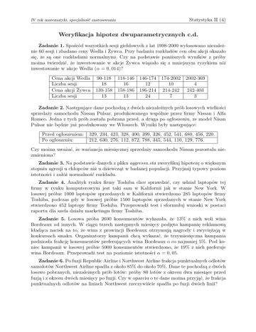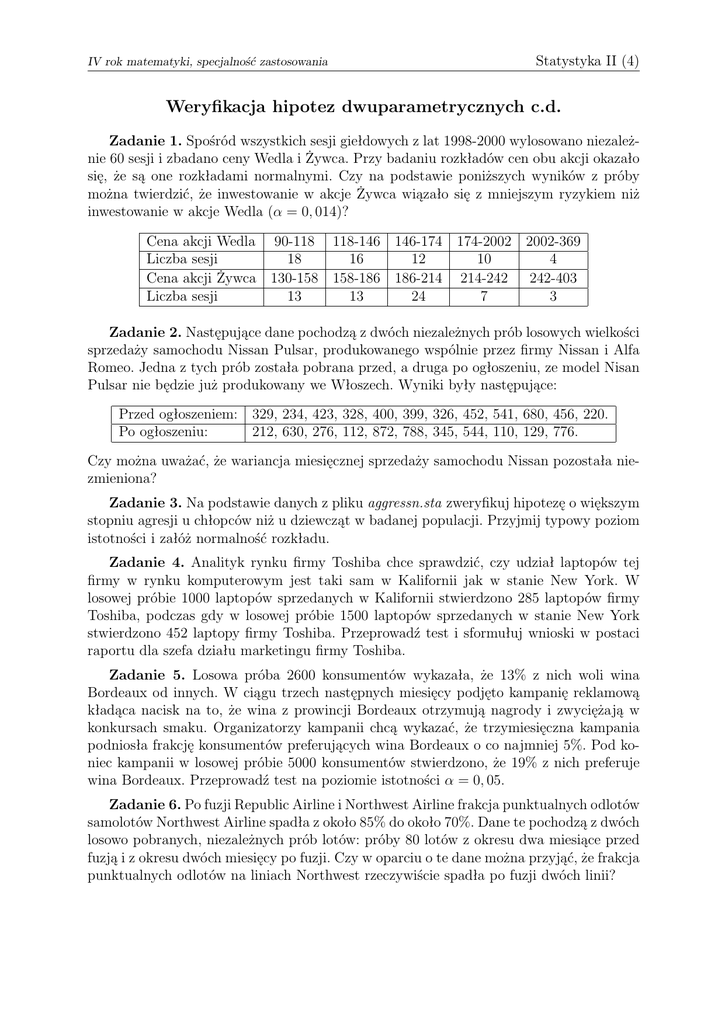 IV rok matematyki, specjalność zastosowania Statystyka II (4) Weryfikacja hipotez dwuparametrycznych c.d. Zadanie 1. Spośród wszystkich sesji giełdowych z lat 1998-2000 wylosowano niezależnie 60 sesji i zbadano ceny Wedla i Żywca. Przy badaniu rozkładów cen obu akcji okazało się, że są one rozkładami normalnymi. Czy na podstawie poniższych wyników z próby można twierdzić, że inwestowanie w akcje Żywca wiązało się z mniejszym ryzykiem niż inwestowanie w akcje Wedla (α = 0, 014)? Cena akcji Wedla 90-118 118-146 146-174 174-2002 2002-369 Liczba sesji 18 16 12 10 4 Cena akcji Żywca 130-158 158-186 186-214 214-242 242-403 Liczba sesji 13 13 24 7 3 Zadanie 2. Następujące dane pochodzą z dwóch niezależnych prób losowych wielkości sprzedaży samochodu Nissan Pulsar, produkowanego wspólnie przez firmy Nissan i Alfa Romeo. Jedna z tych prób została pobrana przed, a druga po ogłoszeniu, ze model Nisan Pulsar nie będzie już produkowany we Włoszech. Wyniki były następujące: Przed ogłoszeniem: Po ogłoszeniu: 329, 234, 423, 328, 400, 399, 326, 452, 541, 680, 456, 220. 212, 630, 276, 112, 872, 788, 345, 544, 110, 129, 776. Czy można uważać, że wariancja miesięcznej sprzedaży samochodu Nissan pozostała niezmieniona? Zadanie 3. Na podstawie danych z pliku aggressn.sta zweryfikuj hipotezę o większym stopniu agresji u chłopców niż u dziewcząt w badanej populacji. Przyjmij typowy poziom istotności i załóż normalność rozkładu. Zadanie 4. Analityk rynku firmy Toshiba chce sprawdzić, czy udział laptopów tej firmy w rynku komputerowym jest taki sam w Kalifornii jak w stanie New York. W losowej próbie 1000 laptopów sprzedanych w Kalifornii stwierdzono 285 laptopów firmy Toshiba, podczas gdy w losowej próbie 1500 laptopów sprzedanych w stanie New York stwierdzono 452 laptopy firmy Toshiba. Przeprowadź test i sformułuj wnioski w postaci raportu dla szefa działu marketingu firmy Toshiba. Zadanie 5. Losowa próba 2600 konsumentów wykazała, że 13% z nich woli wina Bordeaux od innych. W ciągu trzech następnych miesięcy podjęto kampanię reklamową kładąca nacisk na to, że wina z prowincji Bordeaux otrzymują nagrody i zwyciężają w konkursach smaku. Organizatorzy kampanii chcą wykazać, że trzymiesięczna kampania podniosła frakcję konsumentów preferujących wina Bordeaux o co najmniej 5%. Pod koniec kampanii w losowej próbie 5000 konsumentów stwierdzono, że 19% z nich preferuje wina Bordeaux. Przeprowadź test na poziomie istotności α = 0, 05. Zadanie 6. Po fuzji Republic Airline i Northwest Airline frakcja punktualnych odlotów samolotów Northwest Airline spadła z około 85% do około 70%. Dane te pochodzą z dwóch losowo pobranych, niezależnych prób lotów: próby 80 lotów z okresu dwa miesiące przed fuzją i z okresu dwóch miesięcy po fuzji. Czy w oparciu o te dane można przyjąć, że frakcja punktualnych odlotów na liniach Northwest rzeczywiście spadła po fuzji dwóch linii?