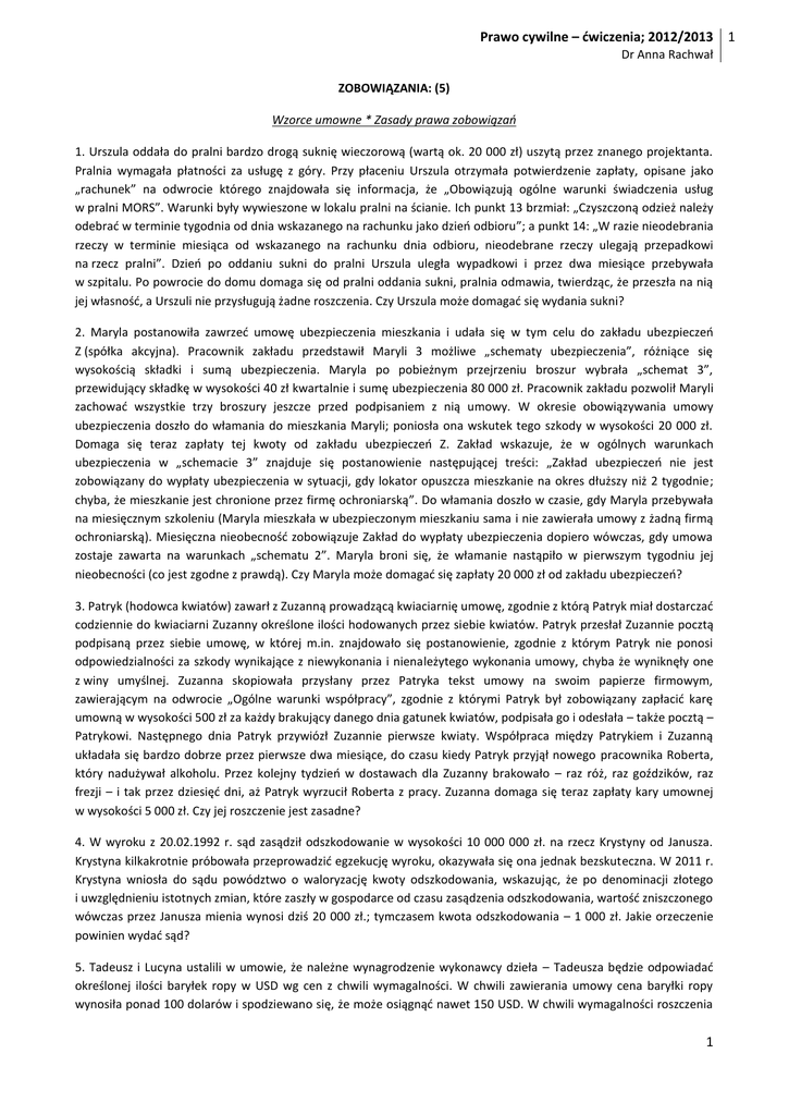 Prawo cywilne – ćwiczenia; 2012/2013 1 Dr Anna Rachwał ZOBOWIĄZANIA: (5) Wzorce umowne * Zasady prawa zobowiązań 1. Urszula oddała do pralni bardzo drogą suknię wieczorową (wartą ok. 20 000 zł) uszytą przez znanego projektanta. Pralnia wymagała płatności za usługę z góry. Przy płaceniu Urszula otrzymała potwierdzenie zapłaty, opisane jako „rachunek” na odwrocie którego znajdowała się informacja, że „Obowiązują ogólne warunki świadczenia usług w pralni MORS”. Warunki były wywieszone w lokalu pralni na ścianie. Ich punkt 13 brzmiał: „Czyszczoną odzież należy odebrać w terminie tygodnia od dnia wskazanego na rachunku jako dzień odbioru”; a punkt 14: „W razie nieodebrania rzeczy w terminie miesiąca od wskazanego na rachunku dnia odbioru, nieodebrane rzeczy ulegają przepadkowi na rzecz pralni”. Dzień po oddaniu sukni do pralni Urszula uległa wypadkowi i przez dwa miesiące przebywała w szpitalu. Po powrocie do domu domaga się od pralni oddania sukni, pralnia odmawia, twierdząc, że przeszła na nią jej własność, a Urszuli nie przysługują żadne roszczenia. Czy Urszula może domagać się wydania sukni? 2. Maryla postanowiła zawrzeć umowę ubezpieczenia mieszkania i udała się w tym celu do zakładu ubezpieczeń Z (spółka akcyjna). Pracownik zakładu przedstawił Maryli 3 możliwe „schematy ubezpieczenia”, różniące się wysokością składki i sumą ubezpieczenia. Maryla po pobieżnym przejrzeniu broszur wybrała „schemat 3”, przewidujący składkę w wysokości 40 zł kwartalnie i sumę ubezpieczenia 80 000 zł. Pracownik zakładu pozwolił Maryli zachować wszystkie trzy broszury jeszcze przed podpisaniem z nią umowy. W okresie obowiązywania umowy ubezpieczenia doszło do włamania do mieszkania Maryli; poniosła ona wskutek tego szkody w wysokości 20 000 zł. Domaga się teraz zapłaty tej kwoty od zakładu ubezpieczeń Z. Zakład wskazuje, że w ogólnych warunkach ubezpieczenia w „schemacie 3” znajduje się postanowienie następującej treści: „Zakład ubezpieczeń nie jest zobowiązany do wypłaty ubezpieczenia w sytuacji, gdy lokator opuszcza mieszkanie na okres dłuższy niż 2 tygodnie; chyba, że mieszkanie jest chronione przez firmę ochroniarską”. Do włamania doszło w czasie, gdy Maryla przebywała na miesięcznym szkoleniu (Maryla mieszkała w ubezpieczonym mieszkaniu sama i nie zawierała umowy z żadną firmą ochroniarską). Miesięczna nieobecność zobowiązuje Zakład do wypłaty ubezpieczenia dopiero wówczas, gdy umowa zostaje zawarta na warunkach „schematu 2”. Maryla broni się, że włamanie nastąpiło w pierwszym tygodniu jej nieobecności (co jest zgodne z prawdą). Czy Maryla może domagać się zapłaty 20 000 zł od zakładu ubezpieczeń? 3. Patryk (hodowca kwiatów) zawarł z Zuzanną prowadzącą kwiaciarnię umowę, zgodnie z którą Patryk miał dostarczać codziennie do kwiaciarni Zuzanny określone ilości hodowanych przez siebie kwiatów. Patryk przesłał Zuzannie pocztą podpisaną przez siebie umowę, w której m.in. znajdowało się postanowienie, zgodnie z którym Patryk nie ponosi odpowiedzialności za szkody wynikające z niewykonania i nienależytego wykonania umowy, chyba że wyniknęły one z winy umyślnej. Zuzanna skopiowała przysłany przez Patryka tekst umowy na swoim papierze firmowym, zawierającym na odwrocie „Ogólne warunki współpracy”, zgodnie z którymi Patryk był zobowiązany zapłacić karę umowną w wysokości 500 zł za każdy brakujący danego dnia gatunek kwiatów, podpisała go i odesłała – także pocztą – Patrykowi. Następnego dnia Patryk przywiózł Zuzannie pierwsze kwiaty. Współpraca między Patrykiem i Zuzanną układała się bardzo dobrze przez pierwsze dwa miesiące, do czasu kiedy Patryk przyjął nowego pracownika Roberta, który nadużywał alkoholu. Przez kolejny tydzień w dostawach dla Zuzanny brakowało – raz róż, raz goździków, raz frezji – i tak przez dziesięć dni, aż Patryk wyrzucił Roberta z pracy. Zuzanna domaga się teraz zapłaty kary umownej w wysokości 5 000 zł. Czy jej roszczenie jest zasadne? 4. W wyroku z 20.02.1992 r. sąd zasądził odszkodowanie w wysokości 10 000 000 zł. na rzecz Krystyny od Janusza. Krystyna kilkakrotnie próbowała przeprowadzić egzekucję wyroku, okazywała się ona jednak bezskuteczna. W 2011 r. Krystyna wniosła do sądu powództwo o waloryzację kwoty odszkodowania, wskazując, że po denominacji złotego i uwzględnieniu istotnych zmian, które zaszły w gospodarce od czasu zasądzenia odszkodowania, wartość zniszczonego wówczas przez Janusza mienia wynosi dziś 20 000 zł.; tymczasem kwota odszkodowania – 1 000 zł. Jakie orzeczenie powinien wydać sąd? 5. Tadeusz i Lucyna ustalili w umowie, że należne wynagrodzenie wykonawcy dzieła – Tadeusza będzie odpowiadać określonej ilości baryłek ropy w USD wg cen z chwili wymagalności. W chwili zawierania umowy cena baryłki ropy wynosiła ponad 100 dolarów i spodziewano się, że może osiągnąć nawet 150 USD. W chwili wymagalności roszczenia 1 Prawo cywilne – ćwiczenia; 2012/2013 2 Dr Anna Rachwał o wynagrodzenie okazało się, że baryłka ropy kosztuje niewiele ponad 50 USD. Tadeusz twierdzi, że ustalone na podstawie tej ceny wynagrodzenie nie pokryje nawet kosztów wykonania dzieła i domaga się ustalenia przez sąd wynagrodzenia na poziomie odpowiadającym prognozowanemu przy zawarciu umowy poziomie cen baryłek ropy. Jakie orzeczenie powinien wydać sąd? 6. Dorota (najemca lokalu niebędąca przedsiębiorcą) zawarła z Marcinem (wynajmującym) umowę najmu lokalu mieszkalnego za czynsz 1 000 USD miesięcznie. W umowie znajdowała się klauzula, zgodnie z którą płatność miała następować wyłącznie w USD. W chwili zawarcia umowy kurs USD wynosił 2,2 zł. Wskutek kryzysu gospodarczego kurs USD wzrósł do 3,5 zł. Dorota domaga się przed sądem obniżeni