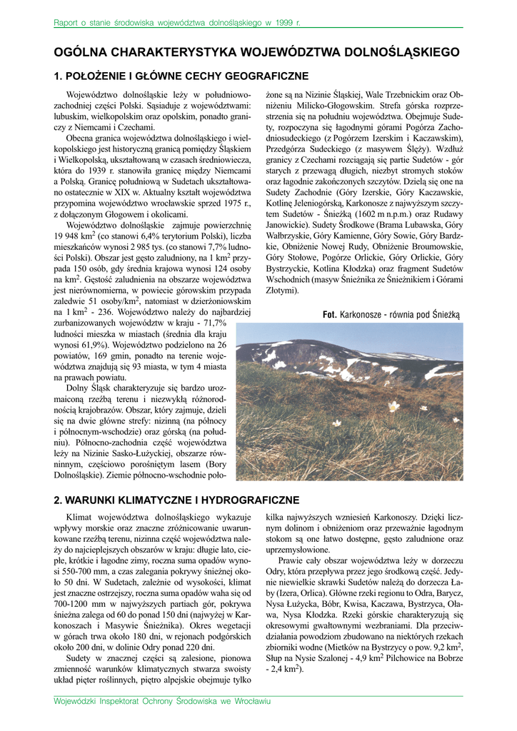 Raport o stanie rodowiska województwa dolnol¹skiego w 1999 r. OGÓLNA CHARAKTERYSTYKA WOJEWÓDZTWA DOLNOL¥SKIEGO 1. PO£O¯ENIE I G£ÓWNE CECHY GEOGRAFICZNE Województwo dolnol¹skie le¿y w po³udniowozachodniej czêci Polski. S¹siaduje z województwami: lubuskim, wielkopolskim oraz opolskim, ponadto graniczy z Niemcami i Czechami. Obecna granica województwa dolnol¹skiego i wielkopolskiego jest historyczn¹ granic¹ pomiêdzy l¹skiem i Wielkopolsk¹, ukszta³towan¹ w czasach redniowiecza, która do 1939 r. stanowi³a granicê miêdzy Niemcami a Polsk¹. Granicê po³udniow¹ w Sudetach ukszta³towano ostatecznie w XIX w. Aktualny kszta³t województwa przypomina województwo wroc³awskie sprzed 1975 r., z do³¹czonym G³ogowem i okolicami. Województwo dolnol¹skie zajmuje powierzchniê 19 948 km2 (co stanowi 6,4% terytorium Polski), liczba mieszkañców wynosi 2 985 tys. (co stanowi 7,7% ludnoci Polski). Obszar jest gêsto zaludniony, na 1 km2 przypada 150 osób, gdy rednia krajowa wynosi 124 osoby na km2. Gêstoæ zaludnienia na obszarze województwa jest nierównomierna, w powiecie górowskim przypada zaledwie 51 osoby/km2, natomiast w dzier¿oniowskim na 1 km2 - 236. Województwo nale¿y do najbardziej zurbanizowanych województw w kraju - 71,7% ludnoci mieszka w miastach (rednia dla kraju wynosi 61,9%). Województwo podzielono na 26 powiatów, 169 gmin, ponadto na terenie województwa znajduj¹ siê 93 miasta, w tym 4 miasta na prawach powiatu. Dolny l¹sk charakteryzuje siê bardzo urozmaicon¹ rzeb¹ terenu i niezwyk³¹ ró¿norodnoci¹ krajobrazów. Obszar, który zajmuje, dzieli siê na dwie g³ówne strefy: nizinn¹ (na pó³nocy i pó³nocnym-wschodzie) oraz górsk¹ (na po³udniu). Pó³nocno-zachodnia czêæ województwa le¿y na Nizinie Sasko-£u¿yckiej, obszarze równinnym, czêciowo poroniêtym lasem (Bory Dolnol¹skie). Ziemie pó³nocno-wschodnie po³o- ¿one s¹ na Nizinie l¹skiej, Wale Trzebnickim oraz Obni¿eniu Milicko-G³ogowskim. Strefa górska rozprzestrzenia siê na po³udniu województwa. Obejmuje Sudety, rozpoczyna siê ³agodnymi górami Pogórza Zachodniosudeckiego (z Pogórzem Izerskim i Kaczawskim), Przedgórza Sudeckiego (z masywem lê¿y). Wzd³u¿ granicy z Czechami rozci¹gaj¹ siê partie Sudetów - gór starych z przewag¹ d³ugich, niezbyt stromych stoków oraz ³agodnie zakoñczonych szczytów. Dziel¹ siê one na Sudety Zachodnie (Góry Izerskie, Góry Kaczawskie, Kotlinê Jeleniogórsk¹, Karkonosze z najwy¿szym szczytem Sudetów - nie¿k¹ (1602 m n.p.m.) oraz Rudawy Janowickie). Sudety rodkowe (Brama Lubawska, Góry Wa³brzyskie, Góry Kamienne, Góry Sowie, Góry Bardzkie, Obni¿enie Nowej Rudy, Obni¿enie Broumowskie, Góry Sto³owe, Pogórze Orlickie, Góry Orlickie, Góry Bystrzyckie, Kotlina K³odzka) oraz fragment Sudetów Wschodnich (masyw nie¿nika ze nie¿nikiem i Górami Z³otymi). Fot. Karkonosze - równia pod nie¿k¹ 2. WARUNKI KLIMATYCZNE I HYDROGRAFICZNE Klimat województwa dolnol¹skiego wykazuje wp³ywy morskie oraz znaczne zró¿nicowanie uwarunkowane rzeb¹ terenu, nizinna czêæ województwa nale¿y do najcieplejszych obszarów w kraju: d³ugie lato, ciep³e, krótkie i ³agodne zimy, roczna suma opadów wynosi 550-700 mm, a czas zalegania pokrywy nie¿nej oko³o 50 dni. W Sudetach, zale¿nie od wysokoci, klimat jest znaczne ostrzejszy, roczna suma opadów waha siê od 700-1200 mm w najwy¿szych partiach gór, pokrywa nie¿na zalega od 60 do ponad 150 dni (najwy¿ej w Karkonoszach i Masywie nie¿nika). Okres wegetacji w górach trwa oko³o 180 dni, w rejonach podgórskich oko³o 200 dni, w dolinie Odry ponad 220 dni. Sudety w znacznej czêci s¹ zalesione, pionowa zmiennoæ warunków klimatycznych stwarza swoisty uk³ad piêter rolinnych, piêtro alpejskie obejmuje tylko kilka najwy¿szych wzniesieñ Karkonoszy. Dziêki licznym dolinom i obni¿eniom oraz przewa¿nie ³agodnym stokom s¹ one ³atwo dostêpne, gêsto zaludnione oraz uprzemys³owione. Prawie ca³y obszar województwa le¿y w dorzeczu Odry, która przep³ywa przez jego rodkow¹ czêæ. Jedynie niewielkie skrawki Sudetów nale¿¹ do dorzecza £aby (Izera, Orlica). G³ówne rzeki regionu to Odra, Barycz, Nysa £u¿ycka, Bóbr, Kwisa, Kaczawa, Bystrzyca, O³awa, Nysa K³odzka. Rzeki górskie charakteryzuj¹ siê okresowymi gwa³townymi wezbraniami. Dla przeciwdzia³ania powodziom zbudowano na niektórych rzekach zbiorniki wodne (Mietków na Bystrzycy o pow. 9,2 km2, S³up na Nysie Szalonej - 4,9 km2 Pilchowice na Bobrze - 2,4 km2). Wojewódzki Inspektorat Ochrony rodowiska we Wroc³awiu Raport o stanie rodowiska województwa dolnol¹skiego w 1999 r. 3. LASY Wskanik zalesienia województwa wynosi 28,3% i jest zbli¿ony do redniej krajowej (28,4%). Ze wzglêdu na ¿yzne gleby wykorzystywane rolniczo najmniej lasów wystêpuje w powiecie strzeliñskim (8,5%) i wroc³awskim (10,8%). Najsilniej zalesione s¹ powiaty boles³awiecki (48,7%) i jeleniogórski (48,4%). Najwiêksze kompleksy lene to Bory Dolnol¹skie (na pó³nocnym wschodzie) oraz lasy na Wale Trzebnickim. W Sudetach dominuje drzewostan iglasty, wierkowy (ponad 80%), natomiast borowy na nizinach. Na terenie województwa znajduj¹ siê dwa parki narodowe: Karkonoski i Gór Sto³owych oraz kilka parków krajobrazowych: Dolina Bobru, Dolina Bystrzycy, Dolina Baryczy, Dolina Jezierzycy oraz Che³my i Rudawski. 4. GOSPODARKA WOJEWÓDZTWA DOLNOL¥SKIEGO 4.1. PRZEMYS£ Województwo dolnol¹skie ma charakter przemys³owo-rolniczy. Najwa¿niejszymi orodkami przemys³owymi s¹ Wroc³aw i okolice, Legnica, Wa³brzych, widnica, Jelenia Góra oraz Dzier¿oniów, Bielawa, Kamienna Góra, Bogatynia. G³ówne ga³êzie przemys³u to wydobycie wêgla brunatnego (Zag³êbie Turoszowskie) i miedzi (LGOM), hutnictwo miedzi i metali nie¿elaznych, przemys³ w³ókienniczy (bawe³niany, lniarski, jedwabniczy, dywany), rodków transportów (samochodowy, taboru kolejowego), energetyka (Elektrownia Turów w Bogatyni 