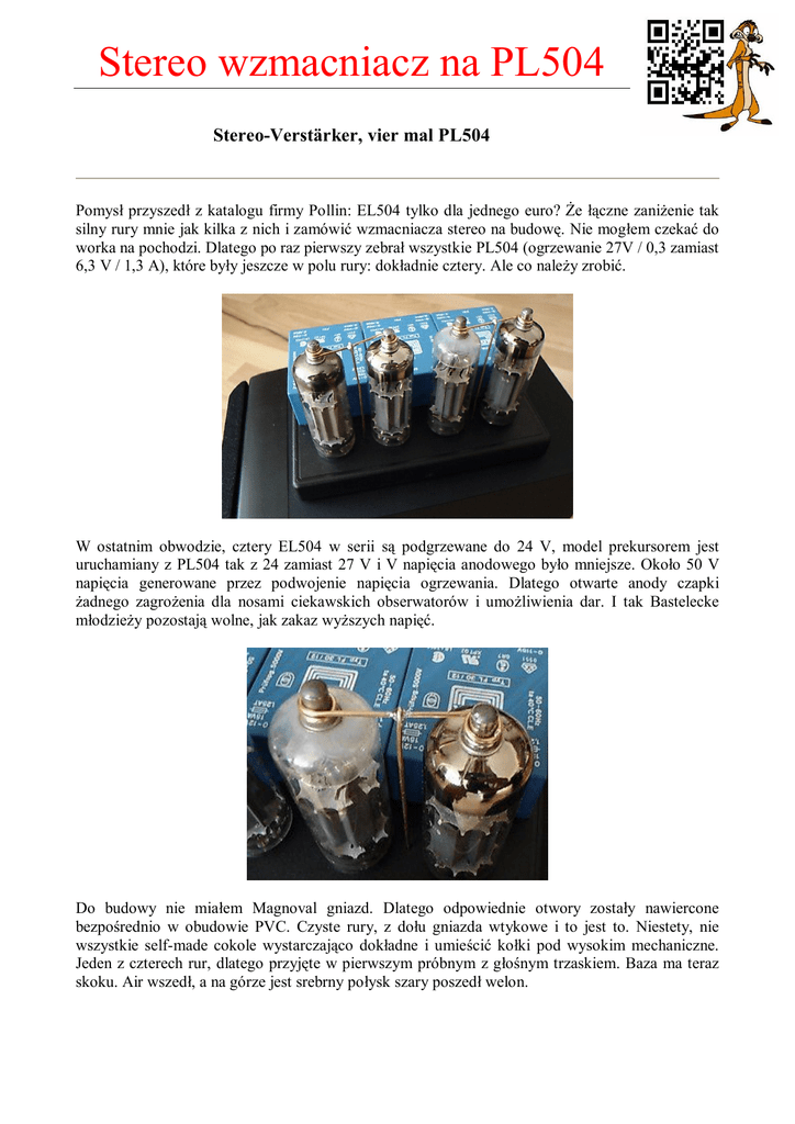 Stereo wzmacniacz na PL504 Stereo-Verstärker, vier mal PL504 Pomysł przyszedł z katalogu firmy Pollin: EL504 tylko dla jednego euro? Że łączne zaniżenie tak silny rury mnie jak kilka z nich i zamówić wzmacniacza stereo na budowę. Nie mogłem czekać do worka na pochodzi. Dlatego po raz pierwszy zebrał wszystkie PL504 (ogrzewanie 27V / 0,3 zamiast 6,3 V / 1,3 A), które były jeszcze w polu rury: dokładnie cztery. Ale co należy zrobić. W ostatnim obwodzie, cztery EL504 w serii są podgrzewane do 24 V, model prekursorem jest uruchamiany z PL504 tak z 24 zamiast 27 V i V napięcia anodowego było mniejsze. Około 50 V napięcia generowane przez podwojenie napięcia ogrzewania. Dlatego otwarte anody czapki żadnego zagrożenia dla nosami ciekawskich obserwatorów i umożliwienia dar. I tak Bastelecke młodzieży pozostają wolne, jak zakaz wyższych napięć. Do budowy nie miałem Magnoval gniazd. Dlatego odpowiednie otwory zostały nawiercone bezpośrednio w obudowie PVC. Czyste rury, z dołu gniazda wtykowe i to jest to. Niestety, nie wszystkie self-made cokole wystarczająco dokładne i umieścić kołki pod wysokim mechaniczne. Jeden z czterech rur, dlatego przyjęte w pierwszym próbnym z głośnym trzaskiem. Baza ma teraz skoku. Air wszedł, a na górze jest srebrny połysk szary poszedł welon. Szkoda, teraz są tylko trzy rurki. Ze względu na symetrię był na innym kanale stereo wziął również rury z serwisu odłączeniu od napięcia ogrzewania. Cały kombi jest teraz w grę tylko osób połowę. Ale dźwięk jest nadal świetnie! Na anodzie prąd do 100 mA na rury, oczywiście, już teraz można spodziewać się wiele. Schemat jednego kanału należy do klasy A Eintaktendstufe z dwóch równoległych rur.PL504 ma duże nachylenie. Dlatego, aby się tam dostać bez prekursora. Jednak, wzmacniacz ma tendencję do dzikich drgań i słychać było czasami w zakresie VHF.Tłumienia rezystor rany RF ssania zapewnia odpoczynek. Jako transformator wyjściowy do 30-watowy transformator zasilający została udowodniona.Okazuje stosunku 5 do 1 wpisuje się w niskim napięciu i niskiej impedancji rur. Wzmacniacz posiada także z tylko jedną lampę na kanał czysty dźwięk w pełnej skali. Dlatego nikt nie powinien źle mówić o wierszu, co PL504 lamp wyjściowych. Musi być naprawdę drogie EL34 nie zawsze!