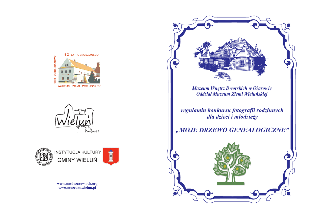 Muzeum Wnêtrz Dworskich w O¿arowie Oddzia³ Muzeum Ziemi Wieluñskiej regulamin konkursu fotografii rodzinnych dla dzieci i m³odzie¿y „MOJE DRZEWO GENEALOGICZNE” www.mwdozarow.ovh.org www.muzeum.wielun.pl ORGANIZATOR KONKURSU I UCZESTNICY Konkurs fotografii rodzinnych pt. "Moje drzewo genealogiczne" jest organizowany przez Muzeum Wnêtrz Dworskich w O¿arowie i adresujemy go do uczniów szkó³ podstawowych i gimnazjów. Konkurs rozgrywany bêdzie w dwóch kategoriach wiekowych: kategoria pierwsza - uczniowie klas IV–VI, kategoria druga - uczniowie gimnazjów. CELEM KONKURSU jest rozbudzenie zainteresowania u dzieci i m³odzie¿y w³asn¹ histori¹ rodzinn¹, poszerzenie ich wiedzy na ten temat oraz popularyzacja poszukiwañ genealogicznych, a tak¿e inspirowanie uczniów do podejmowania dzia³añ twórczych i rozwijanie kreatywnoœci i zdolnoœci. Ide¹ przewodni¹ konkursu jest odkrycie i g³êbsze uœwiadomienie sobie w³asnych korzeni i to¿samoœci. Mamy nadziejê, ¿e to wspólne odkrywanie wzbudzi u uczniów potrzebê pielêgnacji rodzinnych tradycji i szacunek dla naszej, polskiej przesz³oœci. Drog¹ do tego celu jest zebranie jak najpe³niejszej informacji o historii swojej rodziny dziêki rozmowie miêdzypokoleniowej - z rodzicami, dziadkami, pradziadkami, lub z innymi krewnymi przy rodzinnym albumie. Udzia³ w konkursie jest dobrowolny. Zg³oszeni uczestnicy przedstawi¹ opiekunom pisemn¹ zgodê rodziców na udostêpnienie swoich zdjêæ do konkursu, a tak¿e na pokazanie ich na wystawie w Muzeum. WYMAGANIA KONKURSOWE Udzia³ w konkursie "Moje drzewo genealogiczne" polega na opracowaniu przez ucznia (uczestnika konkursu) swojego drzewa genealogicznego. Probantem (osob¹ wywodz¹c¹ swoich przodków) jest opracowuj¹cy drzewo uczeñ. Rodowód mo¿e obejmowaæ albo rodzinê ze strony ojca albo ze strony matki. Drzewo genealogiczne mo¿e byæ opracowane w ró¿nych formach: · rodowodu - przedstawienie cz³onków rodziny, wywodz¹cych siê od wspólnego przodka, ale tylko w liniach mêskich (obejmuje wiêc osoby nosz¹ce to samo nazwisko). · tablicy potomków - przedstawienie osób, wywodz¹cych siê od jednego przodka, w liniach mêskich i ¿eñskich (obejmuje wiêc cz³onków rodziny, nosz¹cych ró¿ne nazwiska). · wywodu przodków - przedstawienie bezpoœrednich przodków opracowuj¹cego drzewo ucznia: dwoje dziadków, czworo pradziadków, oœmioro prapradziadków itd. W wywodzie przodków powinni byæ ujêci przodkowie zarówno ze strony ojca i ze strony matki. Opracowane drzewo genealogiczne mo¿e siêgaæ dowoln¹ iloœæ pokoleñ wstecz (np. do pradziadków lub praprapradziadków). Drzewo genealogiczne powinno byæ opracowane na podstawie wiedzy o rodzinie, jak¹ uczestnik konkursu zdoby³ w wywiadzie rodzinnym oraz na podstawie dokumentów, które posiada w domu. Uczestnicy konkursu przedstawi¹ zestaw min. kilkunastu zdjêæ (KOPIE ZDJÊÆ), które ukazuj¹: kilka pokoleñ, od jak najstarszych do dzisiejszych, wa¿ne osoby w rodzinie, ich miejsce zamieszkania lub pobytu poza ojczyzn¹, pracê zawodow¹, zwyczaje rodzinne, udzia³ w ¿yciu spo³ecznym, politycznym lub kulturalnym. Do ka¿dego zdjêcia nale¿y do³¹czyæ opis: podaæ imiê i nazwisko osób lub osoby przedstawianej. Opisy wszystkich zdjêæ razem powinny tworzyæ zarys historii rodziny. Do konkursu mo¿e przyst¹piæ ka¿dy uczeñ z klas IV – VI i gimnazjum, który z³o¿y prace w wyznaczonym terminie i przyniesienie lub przeœle j¹ do muzeum. - prace mog¹ byæ wykonane przez jednego lub kilku autorów (rodzeñstwo) - prace mog¹ byæ wykonane dowolna technik¹ (kredki, farby, wyklejanie, na papierze, drewnie, styropianie itp.). - du¿e znaczenie dla oceniaj¹cych prace bêdzie mia³a pomys³owoœæ, iloœæ i czytelnoœæ zawartych w drzewie informacji, oryginalnoœæ przedstawionej pracy o rodzinie, estetyka, pracoch³onnoœæ opracowanego pomys³u, stopieñ skomplikowania przedstawionego opracowania (np. po³¹czenie kilku technik). Mo¿e byæ ono uzupe³nione o dodatkowe elementy (np. widok w tle gniazda rodowego - miejscowoœci, z której wywodzi siê ród, zawody cz³onków rodziny, zdjêcia rodzinne, herby rodowe i inne), - praca winna zawieraæ imiê i nazwisko jej wykonawcy oraz opiekuna, klasê, adres i telefon szko³y. - na opakowaniu pracy winien byæ napis: "Konkurs - Moje drzewo genealogiczne". TERMIN NADSY£ANIA PRAC Prace konkursowe nale¿y nadsy³aæ lub dostarczyæ do dnia 20 lutego 2015 r. na adres: Muzeum Wnêtrz Dworskich w O¿arowie Oddzia³ Muzeum Ziemi Wieluñskiej 98-345 Mokrsko tel/fax (0-43) 841-17-24 Istnieje równie¿ mo¿liwoœæ pozostawienia prac w Muzeum Ziemi Wieluñskiej w Wieluniu. JURY KONKURSU z udzia³em specjalistów muzealnych dokona oceny nades³anych prac oraz wytypuje najlepsze z nich do nagród i wyró¿nieñ do 3 marca 2015r, po tym terminie nast¹pi zawiadomienie osób nagrodzonych i wyró¿nionych. Organizatorzy Konkursu informuj¹, i¿ prace plastyczne nades³ane na konkurs bêd¹ zwracane autorom prac po zakoñczeniu konkursu. Prace bêdzie mo¿na odbieraæ przez dwa miesi¹ce od dnia zakoñczenia wystawy pokonkursowej. Po tym terminie prace zostan¹ komisyjnie zniszczone.