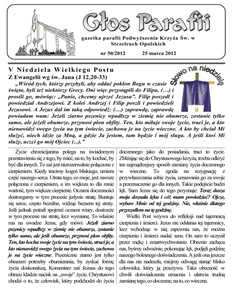 parafii pw. NSPJ w Raciborzu 1 gazetka parafii Podwyższenia Krzyża Św. w Strzelcach Opolskich nr 50/2012 25 marca 2012 V Niedziela Wielkiego Postu Z Ewangelii wg św. Jana (J 12,20-33) „Wśród tych, którzy przybyli, aby oddać pokłon Bogu w czasie święta, byli też niektórzy Grecy. Oni więc przystąpili do Filipa, (…) i prosili go, mówiąc: „Panie, chcemy ujrzeć Jezusa”. Filip poszedł i powiedział Andrzejowi. Z kolei Andrzej i Filip poszli i powiedzieli Jezusowi. A Jezus dał im taką odpowiedź: (…) zaprawdę, zaprawdę powiadam wam: Jeżeli ziarno pszenicy wpadłszy w ziemię nie obumrze, zostanie tylko samo, ale jeżeli obumrze, przynosi plon obfity. Ten, kto miłuje swoje życie, traci je, a kto nienawidzi swego życia na tym świecie, zachowa je na życie wieczne. A kto by chciał Mi służyć, niech idzie za Mną, a gdzie Ja jestem, tam będzie i mój sługa. A jeśli ktoś Mi służy, uczci go mój Ojciec (...).” Życie chrześcijanina polega na świadomym przestawieniu się z tego, by mieć, na to, by kochać, by być dla innych. To zaś jest nierozerwalnie połączone z cierpieniem. Kiedy tracimy kogoś bliskiego, umiera część naszego serca. Utrata tego, co moje, jest zawsze połączona z cierpieniem, a im większa to dla mnie wartość, tym większe cierpienie. Oczami doczesności dostrzegamy w tym procesie jedynie stratę. Buntuje się serce, często bezsilne, widząc bezsens tej straty. Jeśli jednak potrafi spojrzeć oczami wiary, dostrzeże w tym procesie nie stratę, lecz wymianę. To właśnie ma na uwadze Jezus, gdy mówi: Jeżeli ziarno pszenicy wpadłszy w ziemię nie obumrze, zostanie tylko samo, ale jeśli obumrze, przynosi plon obfity. Ten, kto kocha swoje życie na tym świecie, straci je, a kto nienawidzi swego życia na tym świecie, zachowa je na życie wieczne. Pszeniczne ziarno jest tylko obrazem potrzeby obumierania, by zyskać formę życia doskonalszą. Komentarz zaś Jezusa do tego obrazu kładzie nacisk na „swoje” życie. Chrystusowi chodzi o to, że człowiek, który podchodzi do życia doczesnego jako do posiadania, traci to życie. Zbliżając się do Chrystusowego krzyża, trzeba odkryć ten najmądrzejszy sposób zamiany życia doczesnego w wieczne. To zgoda na rezygnację z przywłaszczania sobie życia, uznawania go za swoje a przeznaczenie go dla innych. Takie podejście budzi lęk. Sam Jezus się do tego przyznaje: Teraz dusza moja doznała lęku i cóż mam powiedzieć? Ojcze, wybaw Mnie od tej godziny. Nie, właśnie dlatego przyszedłem na tę godzinę. Wielki Post wzywa do refleksji nad tajemnicą cierpienia i śmierci. Jezus nie odsłania tej tajemnicy, lecz wchodząc w nią zapewnia nas, że można cierpieniu i śmierci nadać sens. On sam to uczynił przez mękę i zmartwychwstanie. Obecnie zachęca nas, byśmy odważnie, pokonując lęk, podjęli godzinę naszego bolesnego doświadczenia. A jeśli ona jeszcze dla nas nie nadeszła, miejmy odwagę stanąć blisko człowieka, który ją przeżywa. Taka obecność w chwili doświadczenia umacnia i ułatwia trudną zamianę tego, co doczesne, na to, co wieczne. 2 Gazetka Parafii Podwyższenia Krzyża Świętego w Strzelcach Opolskich PONIEDZIAŁEK – 26.03.2012 – Uroczystość Zwiastowania Pańskiego 7.00 - Do B.Op. i Matki Bożej Uzdrowienia Chorych o łaskę zdrowia dla Zdzisławy 9.00 - Za + Jana Gruszka, matkę Amalię, ojca Alfreda i ++ z rodziny Gruszka, Warzecha i Szlisz. 18.00- Za + mamę Mariannę z ok. imienin, + ojca Stanisława, ++ Antoniego i Stefanię Polny oraz ++ z rodziny z obu stron. - Za + Antoniego Tomczyk w 2 rocz. śmierci. WTOREK – 27.03.2012 7.00 - Za + syna Eugeniusza i ++ z rodziny. 18.00 - Za + Alojzego Najuch (od mieszkańców z ul. Strzelców Bytomskich). - Do B.Op. i MBFat... z ok. urodzin i imienin Józefa i Wiktorii oraz o błog. Boże dla rodziny. ŚRODA – 28.03.2012 7.00 - Za + Jadwigę Ogaza, ++ rodziców i ++ z pokrew. . 8.15 - Droga krzyżowa dla dzieci. 18.00- Za + Mariannę Hetmańczyk (od mieszkańców z bloku przy ul. Gogolińskiej). - Za żyjących i zmarłych z rodziny. CZWARTEK – 29.03.2012 7.00 - Za + męża, ojca i dziadka Wawrzyńca w 7 rocz. śm., ++ rodziców, siostry, 2 szwagrów, ++ dziadków i dusze w czyśćcu. - Do B. Op. i MB Fat... w rodzinie Marii i Jerzego oraz o błog. Boże dla dzieci z rodzinami. 18.00 - Do B. Op. i MB Fat... z ok. 40 rocz. ur. córki Bogusi oraz o błog. Boże dla wnuków i zięcia. - Za + Ryszarda Koprek, ++ rodziców i braci oraz o błog. Boże i zdrowie w rodzinie. PIĄTEK – 30.03.2012 7.00 - Do B. Op. i MB Fat... z ok. ur. ks. Andrzeja. 18.00- Za + męża Henryka, ++ rodziców Pawła i Katarzynę i teściów Jana i Annę i ++ z rodziny. SOBOTA – 31.03.2012 7.00 - Za + Jana w rocz. śm. oraz wszystkich ++ z rodzin Tarsa i Gurba. 18.00 - Za + Marię Mróz w rocz. śm., + Edmunda Mróz, ++ z rodziny i pokrew. - Do B. Op. i MB Fat... w int. Antoniny z ok. 1 rocz. ur. i chrztu św. oraz o błog. Boże dla rodziców i rodziny. NIEDZIELA PALMOWA MĘKI PAŃSKIEJ – 01.04.2012 7.00 - Za + Gertrudę w 20 rocz. śm., + Mariana, Karola i ++ z rodziny. 8.30 - Za + Agnieszkę Szlisz, + męża Jana, zięcia Bernarda, ++ szwagierkę Agnieszkę Zwiór, jej męża Pawła i ++ z rodziny Szlisz, Warzecha, Gruszka. 10.00- Za + syna Adama, ++ rodziców z rodziny Wilczek i Zdobylak, siostrę Marię,+ Damiana i dusze w cz. - Za + Juliana Kotarzewskiego w 30 dniu po śm. 11.15- Do B. Op. i MB Fat... w int. Sylwii i Marcina z ok. r. ślubu oraz o błog. Boże dla całej rodz. 15.00 -Do B. Op. i MB Fat... z ok. 10 r. ślubu Anny i Krzysztofa oraz o błog. Boże dla całej rodz. 18.30 - Pokutna Droga Krzyżowa ze świecami. Gazetka parafii pw. Podwyższenia Krzyża Świętego w Strzelcach Opolskich 3 Dziś V Niedziela Wielkiego Postu. W ostatnich dwóch tygodniach Wielkiego Postu liturgia kieruje pobożność wiernych ku Męce Pańskiej. Zasłonięte krzyże przypominają nam cierpiącego nie