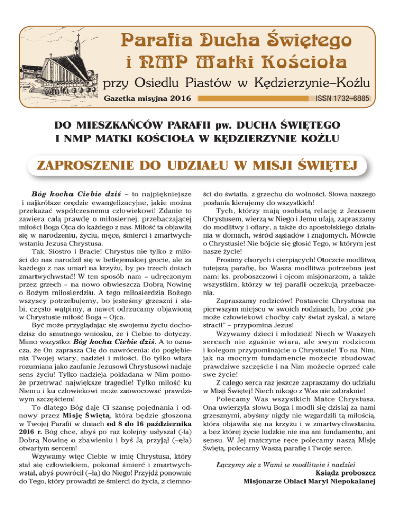 ul. Boles³awa Krzywoustego 2, 47–232 Kêdzierzyn–KoŸle 12 Gazetka misyjna 2016 str. 1 ISSN 1732–6885 DO MIESZKAŃCÓW PARAFII pw. DUCHA ŚWIĘTEGO I NMP MATKI KOŚCIOŁA W KĘDZIERZYNIE KOŹLU ZAPROSZENIE DO UDZIAŁU W MISJI ŚWIĘTEJ Bóg kocha Ciebie dziś – to najpiękniejsze i najkrótsze orędzie ewangelizacyjne, jakie można przekazać współczesnemu człowiekowi! Zdanie to zawiera całą prawdę o miłosiernej, przebaczającej miłości Boga Ojca do każdego z nas. Miłość ta objawiła się w narodzeniu, życiu, męce, śmierci i zmartwychwstaniu Jezusa Chrystusa. Tak, Siostro i Bracie! Chrystus nie tylko z miłości do nas narodził się w betlejemskiej grocie, ale za każdego z nas umarł na krzyżu, by po trzech dniach zmartwychwstać! W ten sposób nam – udręczonym przez grzech – na nowo obwieszcza Dobrą Nowinę o Bożym miłosierdziu. A tego miłosierdzia Bożego wszyscy potrzebujemy, bo jesteśmy grzeszni i słabi, często wątpimy, a nawet odrzucamy objawioną w Chrystusie miłość Boga – Ojca. Być może przyglądając się swojemu życiu dochodzisz do smutnego wniosku, że i Ciebie to dotyczy. Mimo wszystko: Bóg kocha Ciebie dziś. A to oznacza, że On zaprasza Cię do nawrócenia: do pogłębienia Twojej wiary, nadziei i miłości. Bo tylko wiara rozumiana jako zaufanie Jezusowi Chrystusowi nadaje sens życiu! Tylko nadzieja pokładana w Nim pomoże przetrwać największe tragedie! Tylko miłość ku Niemu i ku człowiekowi może zaowocować prawdziwym szczęściem! To dlatego Bóg daje Ci szansę pojednania i odnowy przez Misję Świętą, która będzie głoszona w Twojej Parafii w dniach od 8 do 16 października 2016 r. Bóg chce, abyś po raz kolejny usłyszał (-ła) Dobrą Nowinę o zbawieniu i byś Ją przyjął (–ęła) otwartym sercem! Wzywamy więc Ciebie w imię Chrystusa, który stał się człowiekiem, pokonał śmierć i zmartwychwstał, abyś powrócił (–ła) do Niego! Przyjdź ponownie do Tego, który prowadzi ze śmierci do życia, z ciemno- ści do światła, z grzechu do wolności. Słowa naszego posłania kierujemy do wszystkich! Tych, którzy mają osobistą relację z Jezusem Chrystusem, wierzą w Niego i Jemu ufają, zapraszamy do modlitwy i ofiary, a także do apostolskiego działania w domach, wśród sąsiadów i znajomych. Mówcie o Chrystusie! Nie bójcie się głosić Tego, w którym jest nasze życie! Prosimy chorych i cierpiących! Otoczcie modlitwą tutejszą parafię, bo Wasza modlitwa potrzebna jest nam: ks. proboszczowi i ojcom misjonarzom, a także wszystkim, którzy w tej parafii oczekują przebaczenia. Zapraszamy rodziców! Postawcie Chrystusa na pierwszym miejscu w swoich rodzinach, bo „cóż pomoże człowiekowi choćby cały świat zyskał, a wiarę stracił” – przypomina Jezus! Wzywamy dzieci i młodzież! Niech w Waszych sercach nie zgaśnie wiara, ale swym rodzicom i kolegom przypominajcie o Chrystusie! To na Nim, jak na mocnym fundamencie możecie zbudować prawdziwe szczęście i na Nim możecie oprzeć całe swe życie! Z całego serca raz jeszcze zapraszamy do udziału w Misji Świętej! Niech nikogo z Was nie zabraknie! Polecamy Was wszystkich Matce Chrystusa. Ona uwierzyła słowu Boga i modli się dzisiaj za nami grzesznymi, abyśmy nigdy nie wzgardzili tą miłością, która objawiła się na krzyżu i w zmartwychwstaniu, a bez której życie ludzkie nie ma ani fundamentu, ani sensu. W Jej matczyne ręce polecamy naszą Misję Świętą, polecamy Waszą parafię i Twoje serce. Łączymy się z Wami w modlitwie i nadziei Ksiądz proboszcz Misjonarze Oblaci Maryi Niepokalanej str. 2 Parafia Ducha Œwiêtego i NMP Matki Koœcio³a MODLITWA PRZED MISJĄ ŚWIĘTĄ Panie Jezu Chryste, Ty przyszedłeś na świat, by objawić miłość Boga Ojca. Prosimy Cię o Twoje błogosławieństwo na czas Misji Świętych. Użycz nam Twojej łaski, aby każdy z nas odnalazł i doświadczył Bożej miłości. Zachęceni Twoimi słowami: „proście a otrzymacie”, błagamy Cię o święte natchnienia, o serca otwarte na Twój głos oraz o dar szczerej skruchy. Przeniknij ogniem Ducha Świętego serca tych, którzy szukają miłości po omacku, którzy dotąd opierają się Twojej łasce i dopomóż im do nawrócenia. Wszystkich nas zapal duchem odwagi w zachęcaniu drugich do udziału w misjach parafialnych. Niech Duch Święty wspiera misjonarzy swym światłem, by słowo przez nich głoszone dawało zbawienny skutek. U stóp Twoich Matko Zbawiciela, Królowo naszych serc, składamy całą pracę misyjną w naszej parafii. Przyczyń się, prosimy, do nawrócenia grzeszników, wzmocnij słabych i wątpiących, zbliż nas wszystkich do Syna Twojego, Jezusa Chrystusa. Amen! „Zewsząd znosimy cierpienia, lecz nie poddajemy się zwątpieniu (…). Nosimy nieustannie w ciele naszym konanie Jezusa (…). Sądzę bowiem, że cierpień teraźniejszych nie można stawiać na równi z chwałą, która ma się w nas objawić” (św. Paweł). DRODZY CHORZY I SENIORZY PARAFII pw. DUCHA ŚWIĘTEGO I NMP MATKI KOŚCIOŁA Przed laty papież Pius XII, przemawiając w wigilię Bożego Narodzenia do wszystkich chorych i cierpiących na całym świecie, wypowiedział między innymi takie słowa: „Wy apostołowie cierpienia i ofiarnej modlitwy jesteście szczególniej powołani przez Opatrzność Bożą. Wy jesteście dzisiejszemu światu bardzo potrzebni, abyście, łącząc wasze ofiary, modlitwy i cierpienia z Chrystusową Ofiarą Krzyża, wypraszali światu miłosierdzie Boże, a łaskę nawrócenia dla grzeszników”. Jan Paweł II nazywał Was: „Skarbem Kościoła”, bo w swoim cierpieniu przypominacie Kościołowi cierpienie samego Chrystusa. W dniach od 8 do 16 października 2016 r. będzie miało miejsce w Waszej wspólnocie parafialnej doniosłe wydarzenie Boże – MISJA ŚWIĘTA, to znaczy dzieło duchowej odnowy i powrotu do Boga. Wy jesteście zawsze bliscy naszej kapłańskiej troskliwości! Jesteśmy