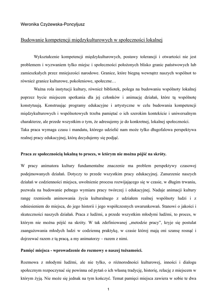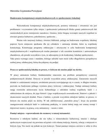 Weronika Czyżewska-Poncyljusz" " Budowanie kompetencji międzykulturowych w społeczności lokalnej " Wykształcenie kompetencji międzykulturowych, postawy tolerancji i otwartości nie jest problemem i wyzwaniem tylko miejsc i społeczności położonych blisko granic państwowych lub zamieszkałych przez mniejszości narodowe. Granice, które biegną wewnątrz naszych wspólnot to również granice kulturowe, pokoleniowe, społeczne… Ważna rola instytucji kultury, również bibliotek, polega na budowaniu wspólnoty lokalnej poprzez bycie miejscem spotkania dla jej członków i animację działań, które tą wspólnotę konstytuują. Konstruując programy edukacyjne i artystyczne w celu budowania kompetencji międzykulturowych i wspólnotowych trzeba pamiętać o ich szerokim kontekście i uniwersalnym charakterze, ale przede wszystkim o tym, że adresujemy je do konkretnej, lokalnej społeczności. Taka praca wymaga czasu i mandatu, którego udzielić nam może tylko długofalowa perspektywa realnej pracy edukacyjnej, którą decydujemy się podjąć. " Praca ze społecznością lokalną to proces, w którym nie można pójść na skróty. W pracy animatora kultury fundamentalne znaczenie ma problem perspektywy czasowej podejmowanych działań. Dotyczy to przede wszystkim pracy edukacyjnej. Zanurzenie naszych działań w codzienności miejsca, uwolnienie procesu rozwijającego się w czasie, w długim trwaniu, pozwala na budowanie pełnego wymiaru pracy twórczej i edukacyjnej. Nadaje animacji kultury rangę rzemiosła animowania życia kulturalnego z udziałem realnej wspólnoty ludzi i z odniesieniem do miejsca, do jego historii i jego współczesnych uwarunkowań. Stanowi o jakości i skuteczności naszych działań. Praca z ludźmi, a przede wszystkim młodymi ludźmi, to proces, w którym nie można pójść na skróty. W tak zdefiniowanej „metodzie pracy”, kryje się postulat zaangażowania młodych ludzi w codzienną praktykę, w czasie której mają oni szansę rosnąć i dojrzewać razem z tą pracą, a my animatorzy – razem z nimi. Pamięć miejsca - wprowadzenie do rozmowy o naszej tożsamości. Rozmowa z młodymi ludźmi, ale nie tylko, o różnorodności kulturowej, inności i dialogu społecznym rozpoczynać się powinna od pytań o ich własną tradycję, historię, relację z miejscem w którym żyją. Nie może się jednak na tym kończyć. Temat pamięci miejsca zawiera w sobie te dwa 1 niezbędne elementy naszej tożsamości - świadomość własnych korzeni i poznanie szerszego, różnorodnego kontekstu, który umiejscawia nas jako część większej, bogatej całości. Wskrzeszanie pamięci, czerpanie z dziedzictwa i tradycji miejsca to ciągle duże wyzwanie w pracy edukacyjnej. Najważniejsze nie jest jednak samo zbieranie i opisywanie historii miasta, czy społeczności ale poszukiwanie w przeszłości elementów, które staną się inspiracją dla działań w teraźniejszości, materiałem do budowania przyszłości. Największa sztuka w pracy animatora kultury, który posługuje się materią pamięci zawiera się w umiejętności sięgnięcia po nią i opowiedzenia jej na nowo w języku współczesności. Nie tylko samo odkrywanie historii, ale tworzenia z niej nowych wartości, które pomogą młodym ludziom po pierwsze poznać miejsce, w którym mieszkają, a po drugie uczynić z tego procesu ważną przygodę odkrywania swojej tożsamości. Wiedza historyczna może być pretekstem do wszelkich artystycznych aktywności, które pomogą zbudować z jej pomocą nową wartość. To może być spektakl teatralny, to może być muzyka, to mogą być prace plastyczne, to może być gra karciana… Edukacyjne inspiracje - Sejneńskie Karty Historyczne Program tworzenia Kart Historycznych i oparta na nich gra, została stworzona w 2002 roku przez młodzież polską i litewską w pracowni Kronik Sejneńskich prowadzonej w Ośrodku Pogranicze przez Bożenę Szroeder. Angażuje on uczniów szkół gimnazjalnych i ostatnich klas szkoły podstawowej w pracę nad poznawaniem swojego miasta, historii swojej rodziny i tradycji kulturowej regionu poprzez wspólne tworzenie gry karcianej. Karty stworzone przez dzieci – ze znakami, symbolami, archetypami, stanowią uniwersalny język porozumiewania się, który wywodzi się z lokalnych tradycji, mitów i mądrości. Język ten staje się podstawą gry, która jak w mozaice scala na nowo świat, który dzieciom do tej pory był obcy lub znany jedynie we fragmentach. Taka gra, posiadająca swoje własne karty, może powstać w każdym miejscu i za każdym razem będzie inna, tylko jemu właściwa. Grono graczy, młodych, ciekawych siebie, swojej rodziny i swojego miejsca na świecie będzie się powiększać, jeżeli znajdzie się przewodnik, pedagog lub animator kultury, który im w tym dopomoże. Aspekt międzypokoleniowy Relacje międzypokoleniowe stają się dziś coraz większym problemem. Ważnym wyzwaniem dla pracy edukacyjnej w społeczności lokalnej staje się coraz częściej spotkanie pokolenia dziadków z młodymi ludźmi. Praca w oparciu o relacje z miejscem i jego pamięcią stanowi szansę na stworzenie przestrzeni i języka do tego spotkania. 2 Przygotowanie pracy nad kartami rozpoczyna się od gromadzenia materiałów, książek, czasopism, dokumentów, które składać się będą na bibliotekę dedykowaną miejscu, w którym żyją przyszli gracze. Oprócz materiałów już zebranych, usystematyzowanych i opracowanych, które dotyczą historii miasta czy regionu ważne jest zebranie opowieści i pamiątek rodzinnych, składających się na prywatną, osobistą, codzienną historię miejsca. Spotkania z ludźmi – najstarszymi mieszkańcami miasta, dziadkami, rodzicami będą źródłem najważniejszych opowieści. Zgromadzone materiały same wskażą tematy poszczególnych kart. Na ich podstawie można wyróżnić ich kategorie, tj.: historia, miejsce, zabytki, społeczności, religie, postać,