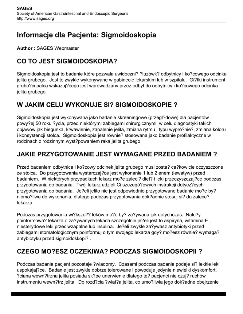 SAGES Society of American Gastrointestinal and Endoscopic Surgeons http://www.sages.org Informacje dla Pacjenta: Sigmoidoskopia Author : SAGES Webmaster CO TO JEST SIGMOIDOSKOPIA? Sigmoidoskopia jest to badanie które pozwala uwidoczni? ?luzówk? odbytnicy i ko?cowego odcinka jelita grubego. Jest to zwykle wykonywane w gabinecie lekarskim lub w szpitalu. Gi?tki instrument grubo?ci palca wskazuj?cego jest wprowadzany przez odbyt do odbytnicy i ko?cowego odcinka jelita grubego. W JAKIM CELU WYKONUJE SI? SIGMOIDOSKOPIE ? Sigmoidoskopia jest wykonywana jako badanie skreeningowe (przegl?dowe) dla pacjentów powy?ej 50 roku ?ycia, przed niektórymi zabiegami chirurgicznymi, w celu diagnostyki takich objawów jak biegunka, krwawienie, zapalenie jelita, zmiana rytmu i typu wypró?nie?, zmiana koloru i konsystencji stolca. Sigmoidoskopia jest równie? stosowana jako badanie profilaktyczne w rodzinach z rodzinnym wyst?powaniem raka jelita grubego. JAKIE PRZYGOTOWANIE JEST WYMAGANE PRZED BADANIEM ? Przed badaniem odbytnica i ko?cowy odcinek jelita grubego musi zosta? ca?kowicie oczyszczone ze stolca. Do przygotowania wystarczaj?ce jest wykonanie 1 lub 2 enem (lewatyw) przed badaniem. W niektórych przypadkach lekarz mo?e zaleci? diet? i leki przeczyszczaj?ce podczas przygotowania do badania. Twój lekarz udzieli Ci szczegó?owych instrukcji dotycz?cych przygotowania do badania. Je?eli jelito nie jest odpowiednio przygotowane badanie mo?e by? niemo?liwe do wykonania, dlatego podczas przygotowania dok?adnie stosuj si? do zalece? lekarza. Podczas przygotowania wi?kszo?? leków mo?e by? za?ywana jak dotychczas. Nale?y poinformowa? lekarza o za?ywanych lekach szczególnie je?eli jest to aspiryna, witamina E , niesterydowe leki przeciwzapalne lub insulina. Je?eli zwykle za?ywasz antybiotyki przed zabiegami stomatologicznym poinformuj o tym swojego lekarza gdy? mo?esz równie? wymaga? antybiotyku przed sigmoidoskopi? . CZEGO MO?ESZ OCZEKIWA? PODCZAS SIGMOIDOSKOPII ? Podczas badania pacjent pozostaje ?wiadomy. Czasami podczas badania podaje si? lekkie leki uspokajaj?ce. Badanie jest zwykle dobrze tolerowane i powoduje jedynie niewielki dyskomfort. ?ciana wewn?trzna jelita posiada sk?pe unerwienie dlatego te? pacjenci nie czuj? ruchów instrumentu wewn?trz jelita. Do rozd?cia ?wiat?a jelita, co umo?liwia jego dok?adne obejrzenie This document is property of the Society of American Gastrointestinal and Endoscopic Surgeons. All Rights Reserved. Do not repost. u?ywa si? wdmuchiwanego powietrza. Mo?e to powodowa? uczucie wzd?cia czy bólów podczas badania. Badanie wykonywane jest w pozycji le??cej na plecach. Bardzo uwa?nie ogl?dana jest ?luzówka jelita grubego. Sigmoidoskopia zajmuje zwykle od 5 do 15 minut. Je?eli podczas badania odczuwasz nasilone dolegliwo?ci bólowe poinformuj swojego lekarza. WYNIK SIGMOIDOSCOPII ? Po badaniu lekarz wyja?ni Ci wynik. Po badaniu mo?esz odczuwa? wzd?cia i skurcze jelit powodowane przez powietrze wprowadzone do jelita podczas badania. Uczucie to mija po oddaniu wiatrów. Po badaniu mo?esz od?ywia? si? i powróci? do normalnej aktywno?ci ?yciowej zaraz po opuszczeniu gabinetu lekarskiego lub szpitala. Je?eli podczas badania lekarz zauwa?a miejsce podejrzane, wykonuje biopsj? zmiany i przesy?a preparat do badania histopatologicznego. Biopsja jest wykonywana specjalnym instrumentem chirurgicznym. Biopsja jest niebolesna. Je?eli polip lub inna patologia jest znaleziona podczas badania to lekarz zleci Ci wykonanie kolonoskopii która pozwala oceni? ca?e jelito grube. JAKIE KOMPLIKACJE MOG? WYST?PI? PO BADANIU ? Sigmoidoskopia i biopsja s? to bezpieczne badania je?eli s? wykonywane przez do?wiadczonego lekarza. Komplikacje s? rzadkie lecz mog? wyst?pi?. Zalicza si? do nich krwawienie z miejsca biopsji lub perforacja czyli przedziurawienie ?ciany jelita. Nale?y skontaktowa? si? z lekarzem je?eli wyst?pi? objawy takie jak: ból brzucha lub wzd?cie, nudno?ci, gor?czka, dreszcze, krwawienie z odbytu w ilo?ci wi?kszej ni? pó? szklanki. Krwawienia w niewielkim nasileniu mog? wyst?powa? przez kilka dni po biopsji. This document is property of the Society of American Gastrointestinal and Endoscopic Surgeons. All Rights Reserved. Do not repost. Powered by TCPDF (www.tcpdf.org)