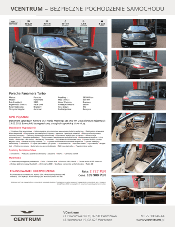 Porsche Panamera Turbo Marka: Model: Rok Produkcji: Pojemność silnika : Kolor Nadwozia: Skrzynia biegów: Porsche Panamera 2011 4806 cm3 Brązowy Automat Przebieg : Moc silnika : Kolor Wnętrza: Rodzaj nadwozia: Ilość drzwi: Rodzaj paliwa: 185000 km 500 KM Brązowy Sedan 4/5 Benzyna OPIS POJAZDU: Dokument sprzedaży: Faktura VAT-marża Przebieg: 185 000 km Data pierwszej rejestracji: 15.02.2011 Samochód bezwypadkowy z oryginalną powłoką lakierniczą. Dodatkowe Wyposażenie ✓20-calowe felgi aluminiowe ✓Automatycznie przyciemniane wewnętrzne lusterko wsteczne ✓Elektrycznie otwierana klapa bagażnika ✓Elektrycznie sterowany fotel kierowcy i pasażera z pamięcią ustawień ✓Elektrycznie sterowany hamulec postojowy ✓Elementy dekoracyjne aluminiowe ✓Kierownica wykończona drewnem ✓Klimatyzacja automatyczna ✓Komputer pokładowy ✓Podgrzewane i wentylowane przednie fotele ✓Podgrzewane przednie i tylne fotele ✓Podsufitka z Alcantary ✓Reflektory ksenonowe ✓Spryskiwacze ciśnieniowe lamp ✓System bezkluczykowy Keyless Entry ✓Światła do jazdy dziennej LED ✓System monitorowania ciśnienia w oponach ✓System nawigacji satelitarnej ✓Tempomat ✓Czujniki parkowania tył i przód ✓Czujnik deszczu ✓Sportowe fotele ✓Dysk twardy ✓Napęd 4x4 ✓Elektryczne szyby ✓Automatyczna skrzynia biegów ✓Skórzana tapicerka ✓Przyciemniane szyby Systemy Bezpieczeństwa ✓Servotronic ✓Poduszka powietrzna kierowcy i pasażera ✓ISOFIX ✓Centralny zamek Multimedia ✓Kamera wspomagająca parkowanie ✓DVD ✓Gniazdo AUX ✓Gniazdo USB / iPod® ✓Zestaw audio BOSE Surround ✓Zestaw głośnomówiący Bluetooth ✓Zmieniarka 6CD ✓Sportowa kierownica wielofunkcyjna ✓Radio CD FINANSOWANIE I UBEZPIECZENIA: Przykładowa rata miesięczna, wpłata 20%, okres leasingu/kredytu 48 miesięcy, 10% wykupu. Rata leasingu jest wartością netto bez vat. Rata: 2 727 Cena: 189 900 PLN PLN Niniejsza treść nie stanowi oferty w rozumieniu przepisów Kodeksu Cywilnego oraz opisu towaru ani zapewnienia w rozumieniu art. 4 Ustawy z dnia 27 lipca 2002r o szczególnych warunkach sprzedaży konsumenckiej. Powered by TCPDF (www.tcpdf.org)