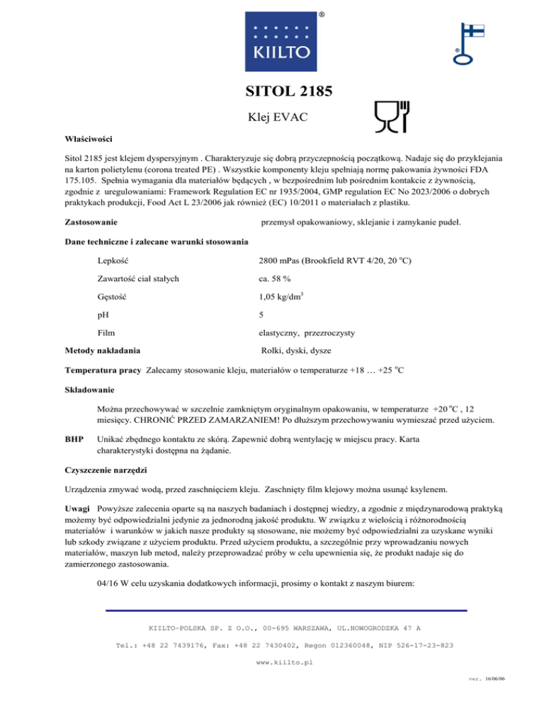 SITOL 2185 Klej EVAC Właściwości Sitol 2185 jest klejem dyspersyjnym . Charakteryzuje się dobrą przyczepnością początkową. Nadaje się do przyklejania na karton polietylenu (corona treated PE) . Wszystkie komponenty kleju spełniają normę pakowania żywności FDA 175.105. Spełnia wymagania dla materiałów będących , w bezpośrednim lub pośrednim kontakcie z żywnością, zgodnie z uregulowaniami: Framework Regulation EC nr 1935/2004, GMP regulation EC No 2023/2006 o dobrych praktykach produkcji, Food Act L 23/2006 jak również (EC) 10/2011 o materiałach z plastiku. przemysł opakowaniowy, sklejanie i zamykanie pudeł. Zastosowanie Dane techniczne i zalecane warunki stosowania Lepkość 2800 mPas (Brookfield RVT 4/20, 20 oC) Zawartość ciał stałych ca. 58 % Gęstość 1,05 kg/dm3 pH 5 Film elastyczny, przezroczysty Metody nakładania Rolki, dyski, dysze Temperatura pracy Zalecamy stosowanie kleju, materiałów o temperaturze +18 … +25 oC Składowanie Można przechowywać w szczelnie zamkniętym oryginalnym opakowaniu, w temperaturze +20 oC , 12 miesięcy. CHRONIĆ PRZED ZAMARZANIEM! Po dłuższym przechowywaniu wymieszać przed użyciem. BHP Unikać zbędnego kontaktu ze skórą. Zapewnić dobrą wentylację w miejscu pracy. Karta charakterystyki dostępna na żądanie. Czyszczenie narzędzi Urządzenia zmywać wodą, przed zaschnięciem kleju. Zaschnięty film klejowy można usunąć ksylenem. Uwagi Powyższe zalecenia oparte są na naszych badaniach i dostępnej wiedzy, a zgodnie z międzynarodową praktyką możemy być odpowiedzialni jedynie za jednorodną jakość produktu. W związku z wielością i różnorodnością materiałów i warunków w jakich nasze produkty są stosowane, nie możemy być odpowiedzialni za uzyskane wyniki lub szkody związane z użyciem produktu. Przed użyciem produktu, a szczególnie przy wprowadzaniu nowych materiałów, maszyn lub metod, należy przeprowadzać próby w celu upewnienia się, że produkt nadaje się do zamierzonego zastosowania. 04/16 W celu uzyskania dodatkowych informacji, prosimy o kontakt z naszym biurem: KIILTO–POLSKA SP. Z O.O., 00-695 WARSZAWA, UL.NOWOGRODZKA 47 A Tel.: +48 22 7439176, Fax: +48 22 7430402, Regon 012360048, NIP 526-17-23-823 www.kiilto.pl ver. 16/06/06